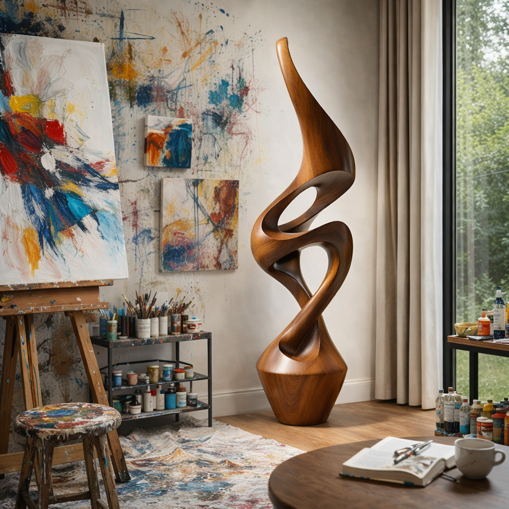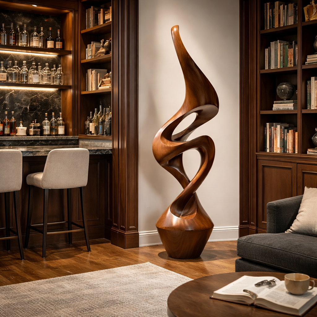 Hand-carved from natural solid wood, the piece reflects careful craftsmanship in its contours. Its flowing structure brings a sense of movement and harmony, making it an inviting focal point for living rooms, entryways, studios, or open interior layouts. A satin finish helps preserve the natural color of the wood while adding a smooth, modern touch.