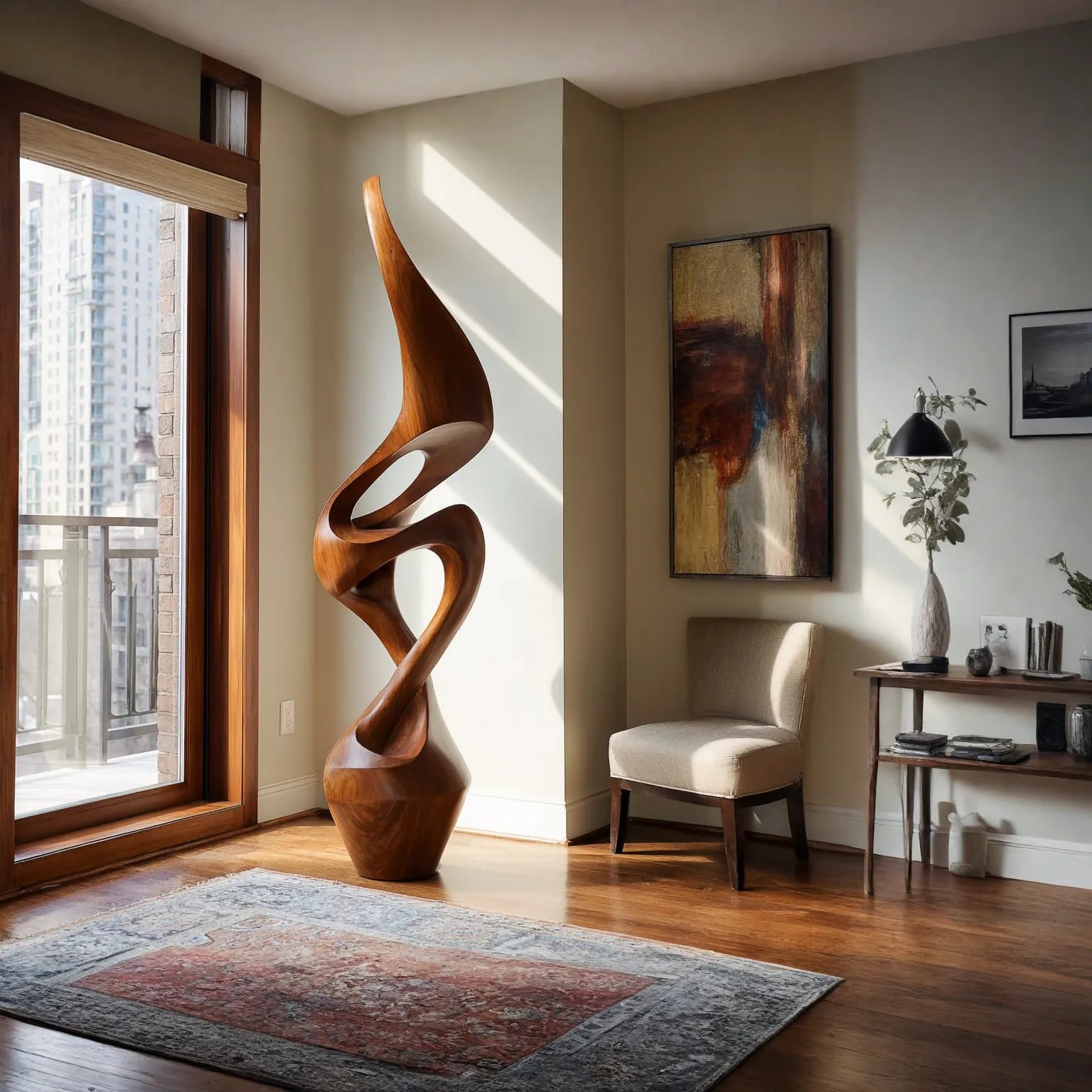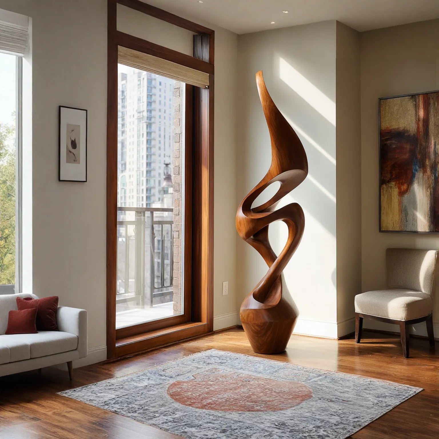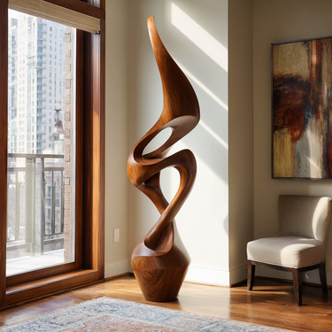 This contemporary sculpture is shaped with sweeping curves that rise and twist gracefully, creating a refined organic presence in the room. Open spaces within the form introduce lightness while allowing natural light to interact with the polished wooden surfaces, highlighting the warm grain and soft tonal transitions.