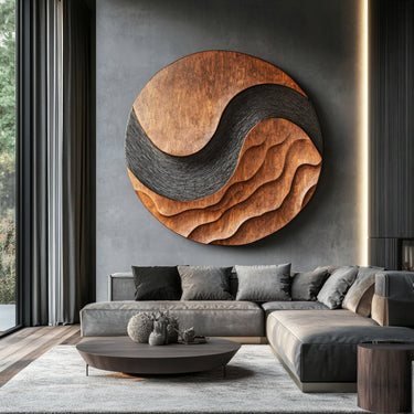 This wall art features a round form with a flowing wave pattern that adds depth and a calm sense of motion. The contrast between smooth areas and carved contours creates a balanced focal point that suits contemporary interiors without feeling heavy.