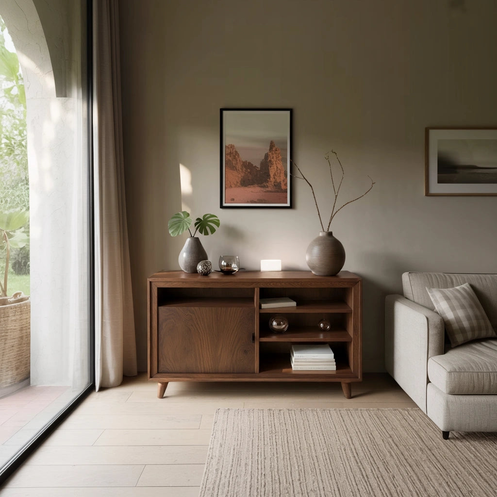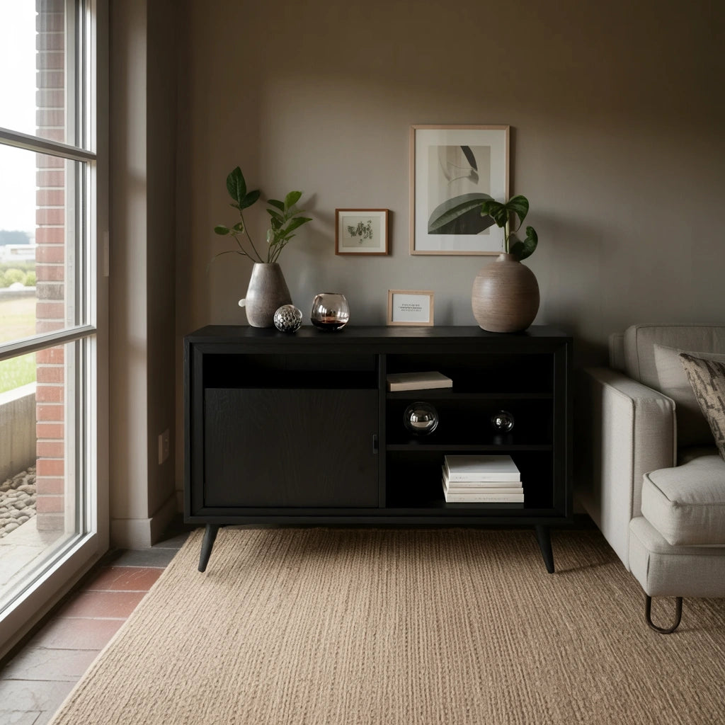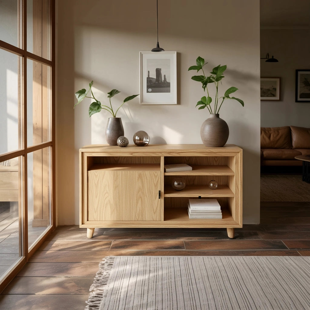 Designed for versatility, this sideboard works beautifully in living rooms, dining areas, entryways, or home offices. Open shelves provide space for books, art objects, or decorative accents, while the enclosed compartment keeps everyday items neatly hidden. Its minimalist design pairs seamlessly with organic modern, Japandi, Scandinavian, and contemporary styles, adding contrast without overwhelming the space.