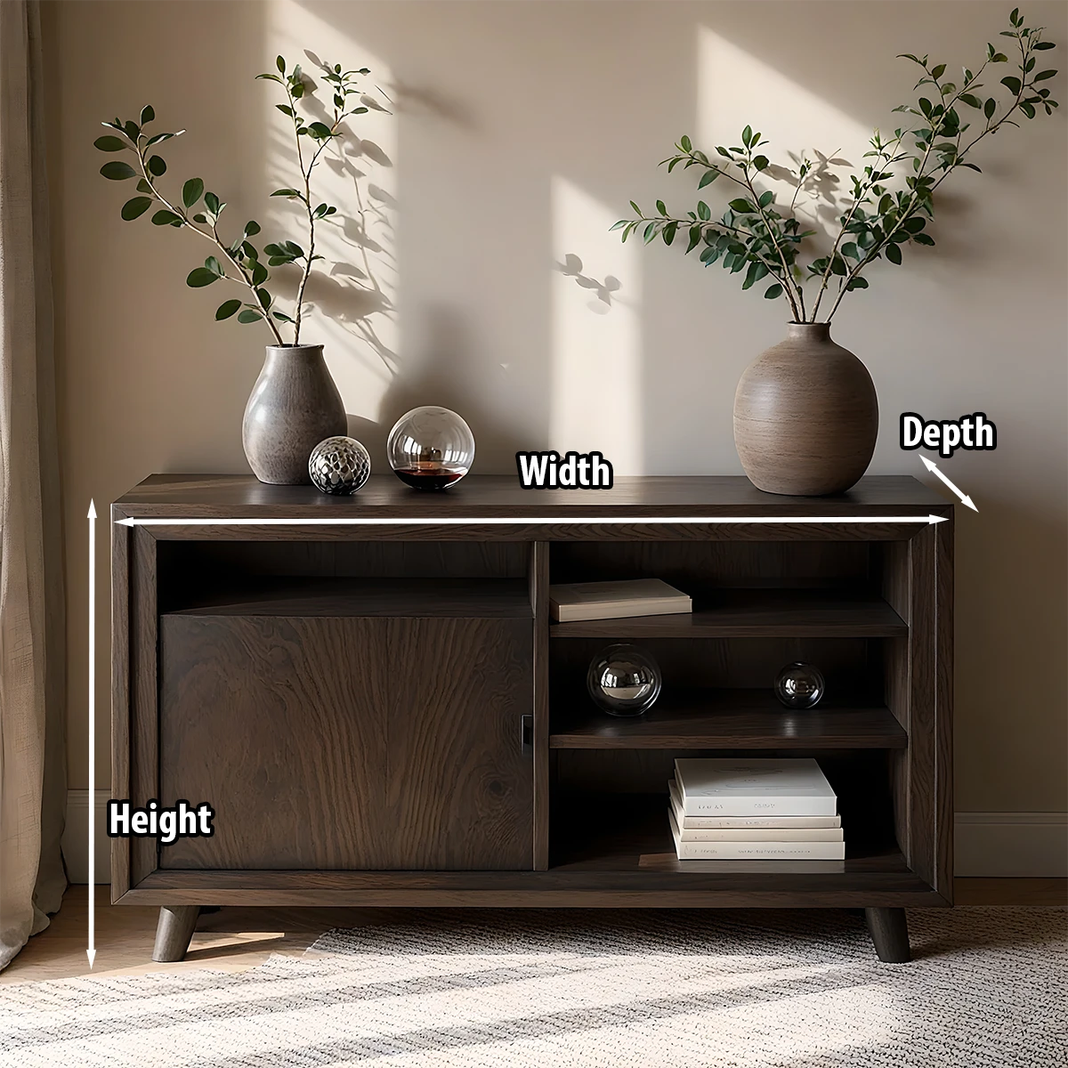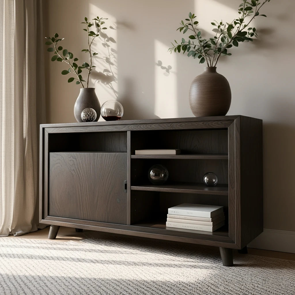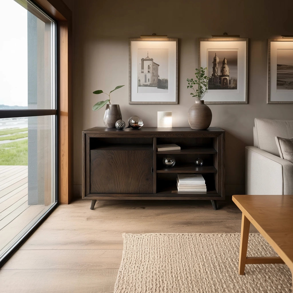 Dark Solid Wood Sideboard with Open Shelving for Modern Interiors