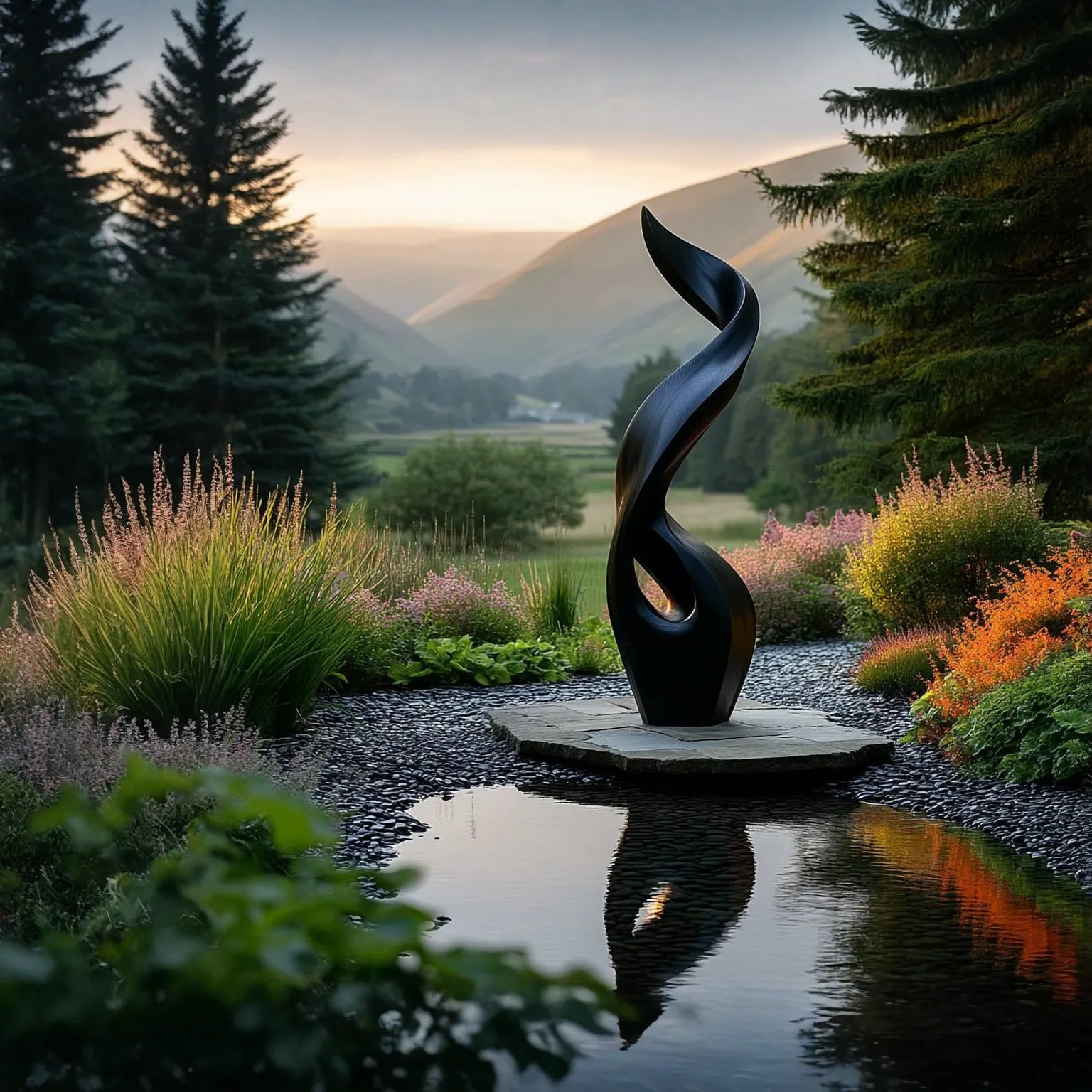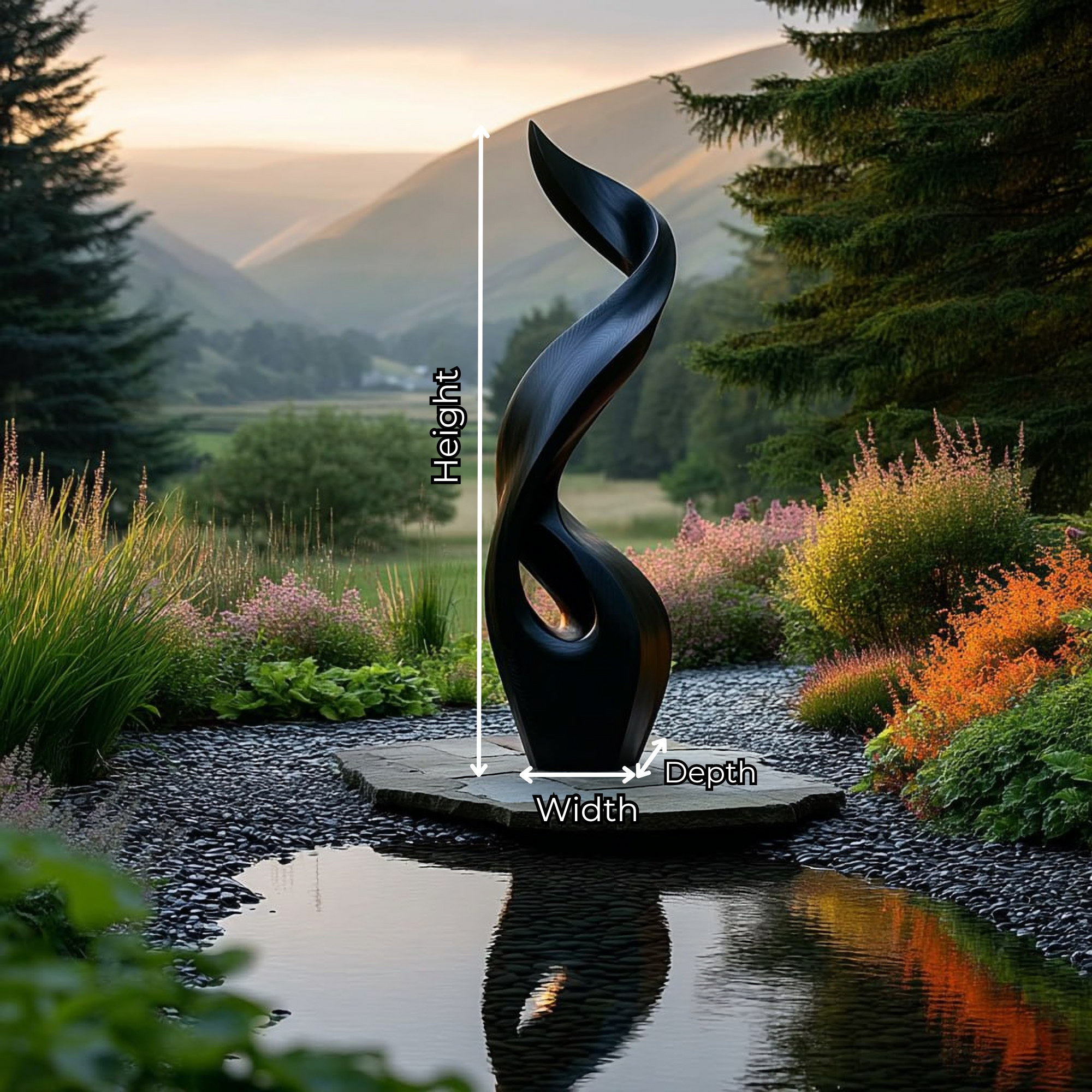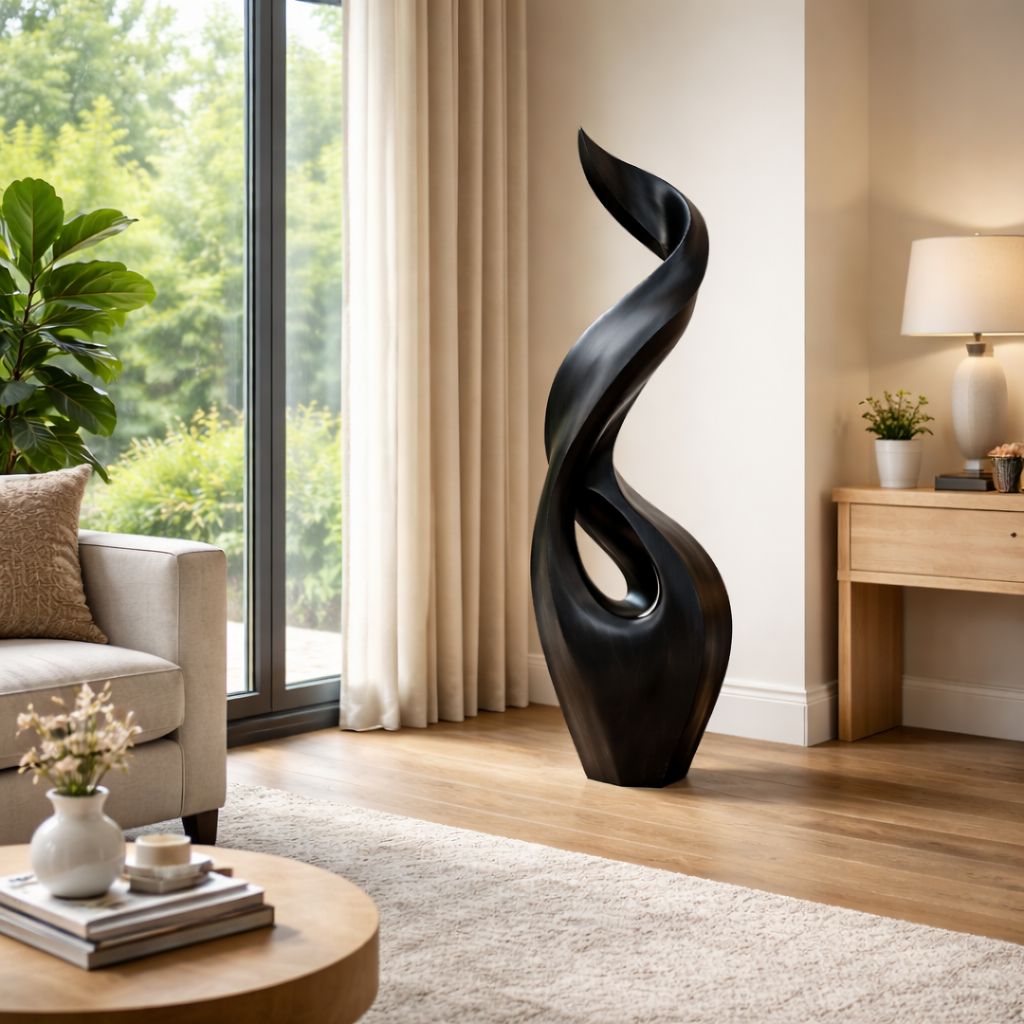 This sculpture suggests a considered harmony between movement and stillness. Inspired by the natural forms of fire and wind, it rises in graceful curves that twist together in a fluid vertical motion. The continuous flow of lines introduces a sense of energy, while the balanced composition brings calm and focus to its surroundings.