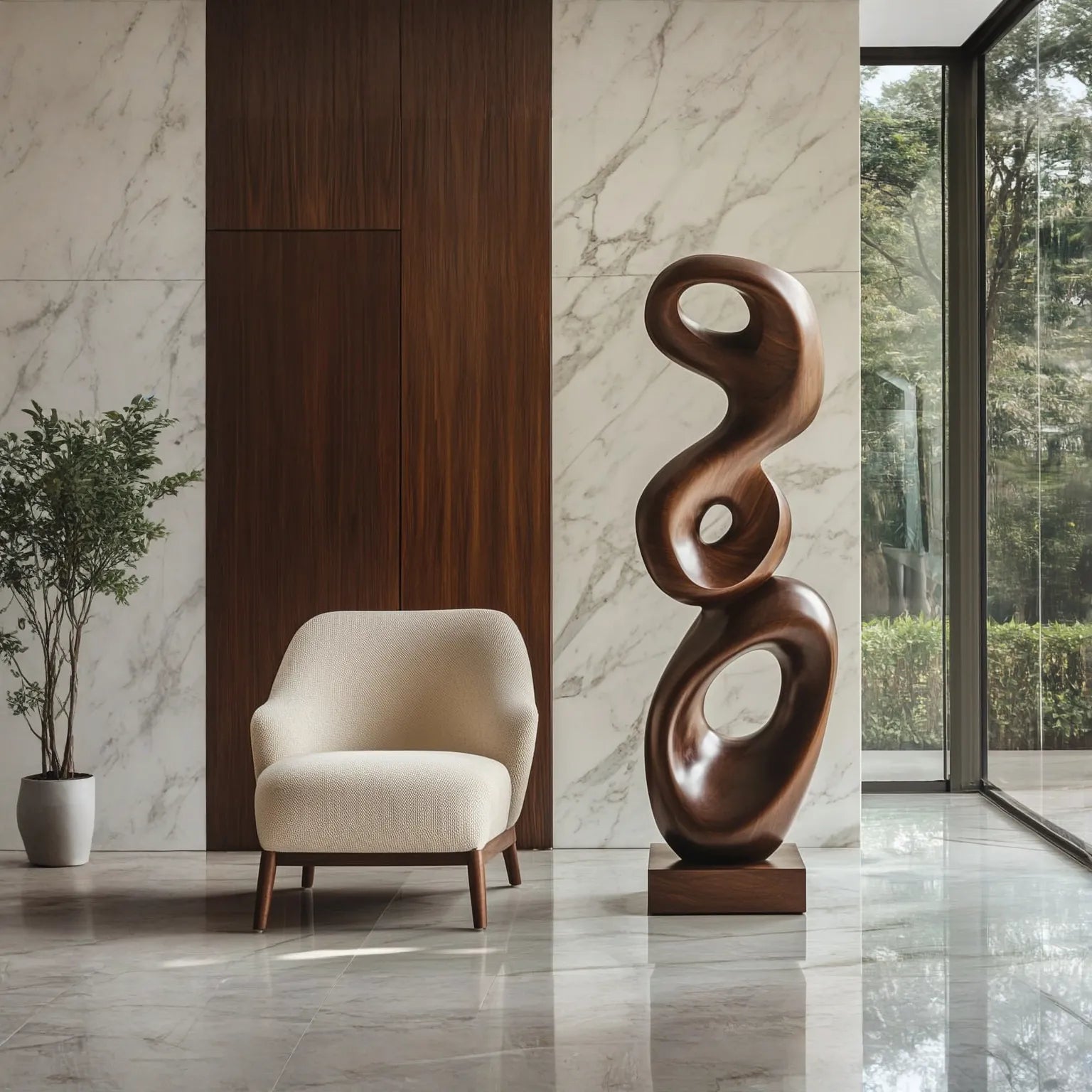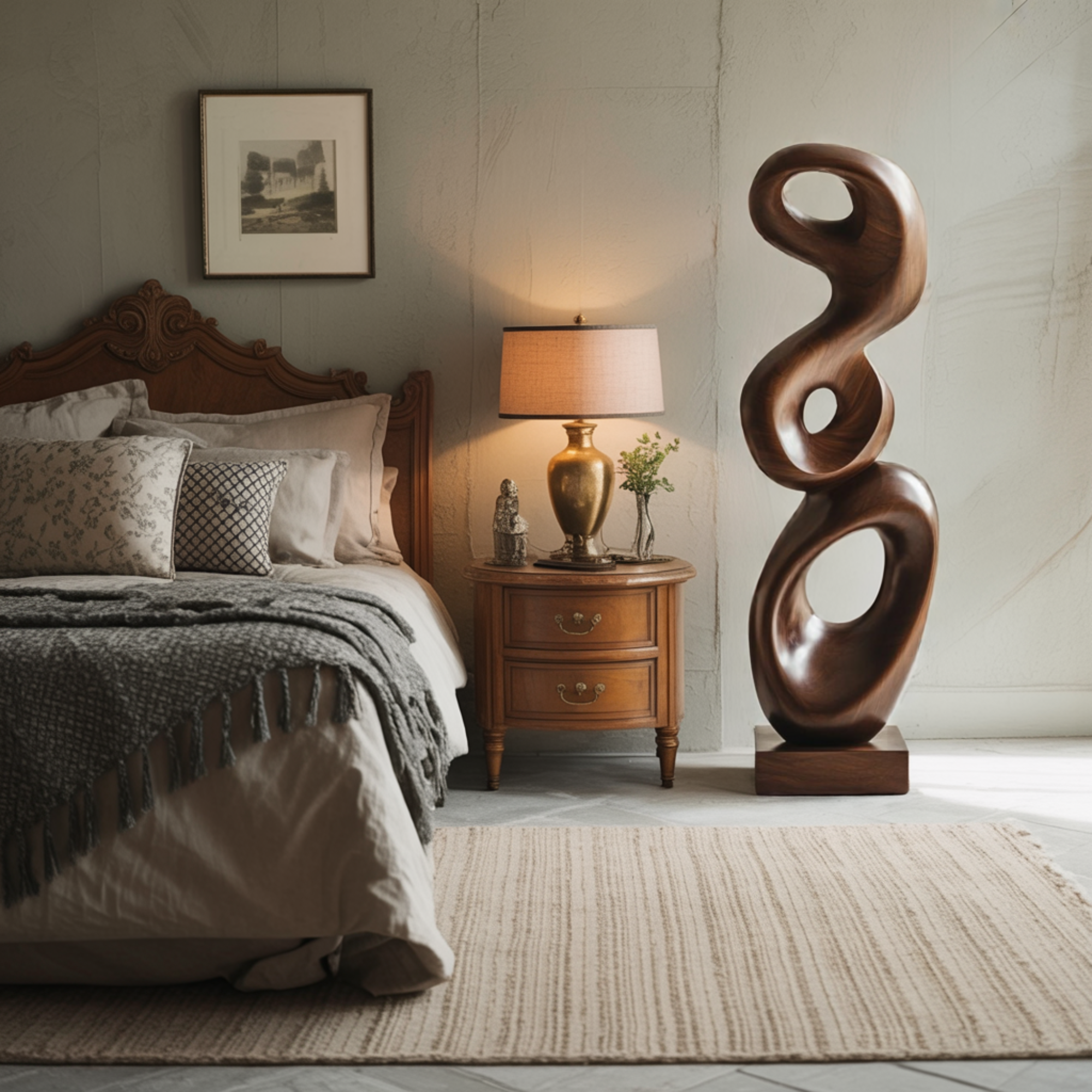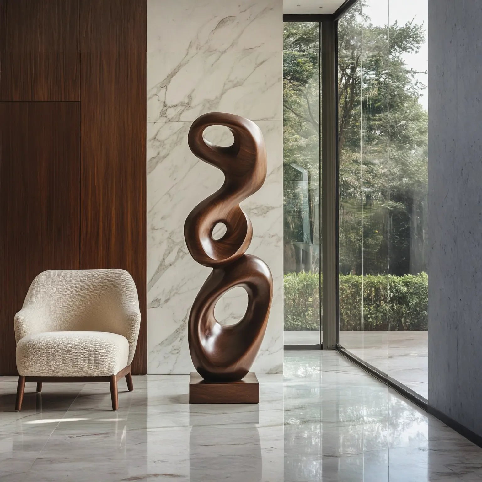 Carved from solid wood and finished to reveal the depth of its natural grain, the sculpture offers a warm, tactile presence. Its smooth surfaces and layered contours interact with light throughout the day, creating subtle shifts in light and shadow that give the piece a calm, quietly enduring character.