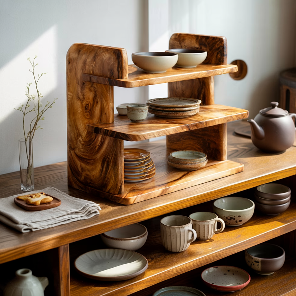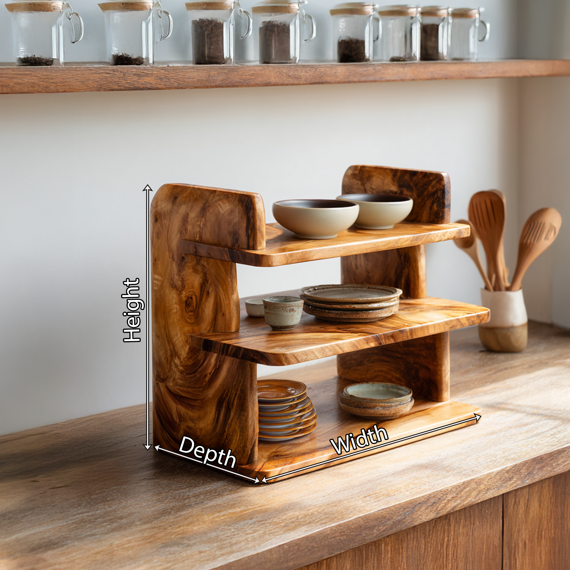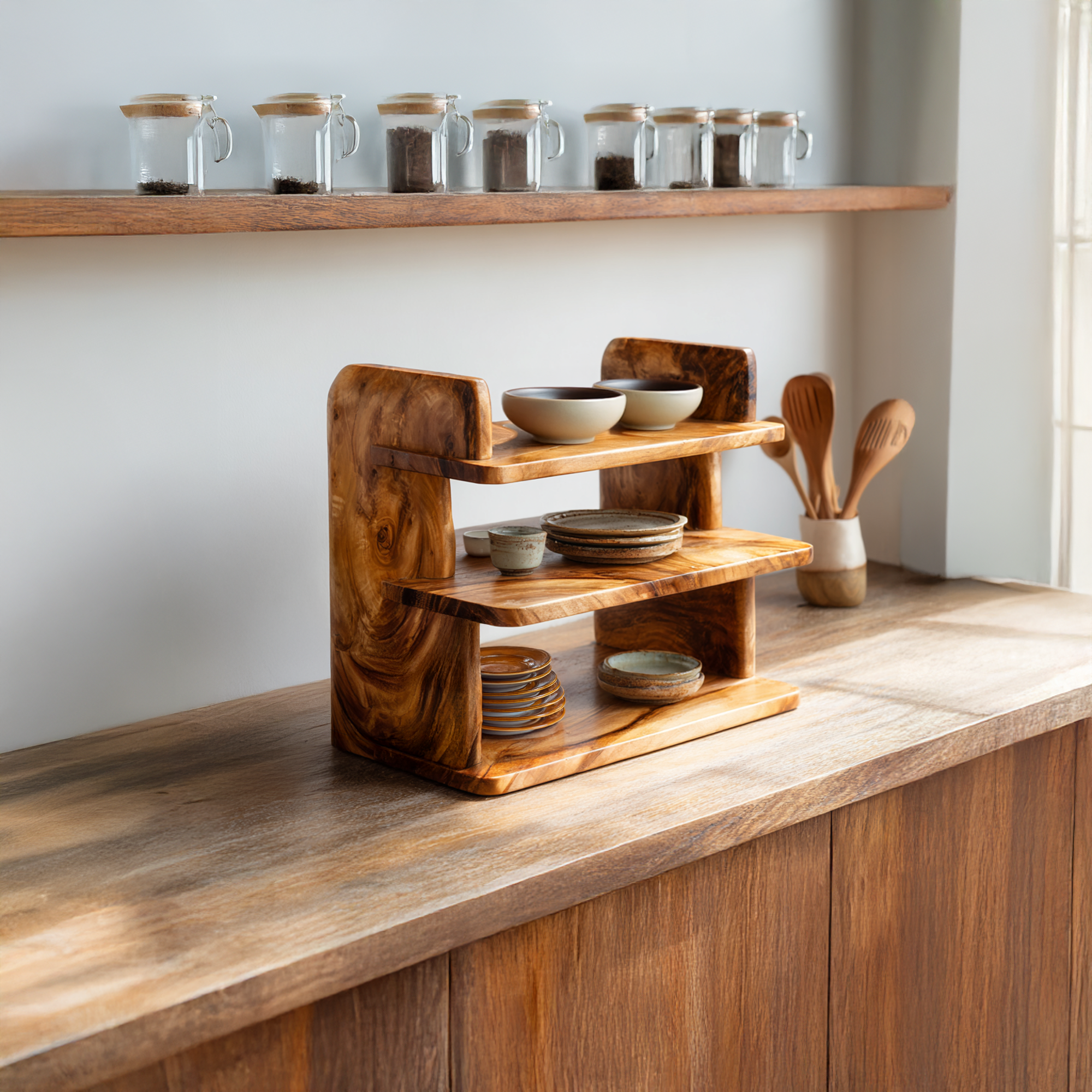 Rooted in organic modern design, this wooden countertop shelf balances practicality and craftsmanship. It adds texture, warmth, and timeless appeal to kitchens, dining areas, or open shelving setup transforming functional storage into a beautifully curated statement piece.