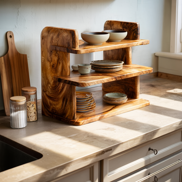 Bring warmth and structure to your kitchen with this handcrafted solid wood counter organizer shelf. Designed with clean horizontal tiers and softly rounded side panels, it offers a refined yet natural presence that enhances both modern and rustic interiors. The sculptural wood grain becomes a visual focal point, turning everyday storage into an elevated display.