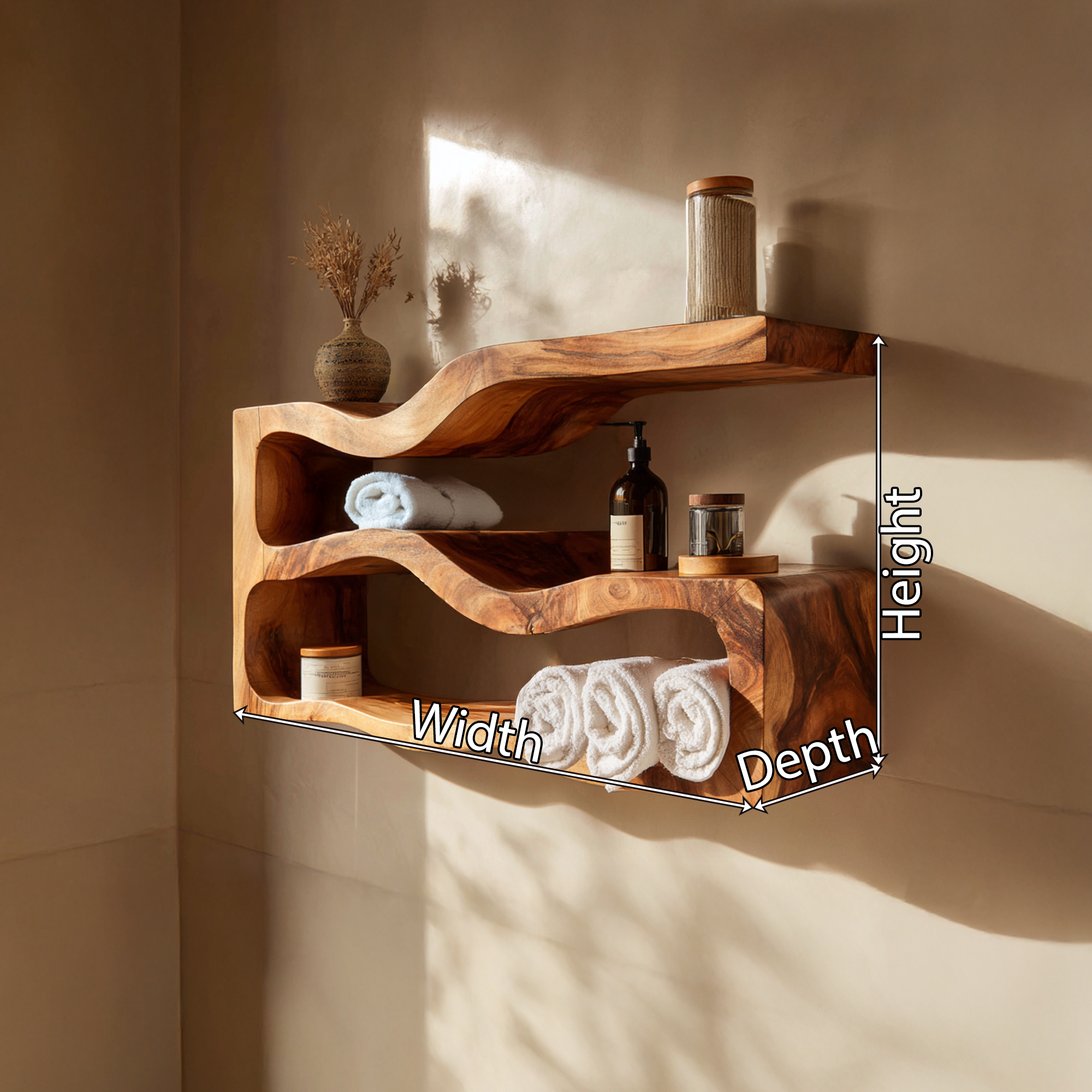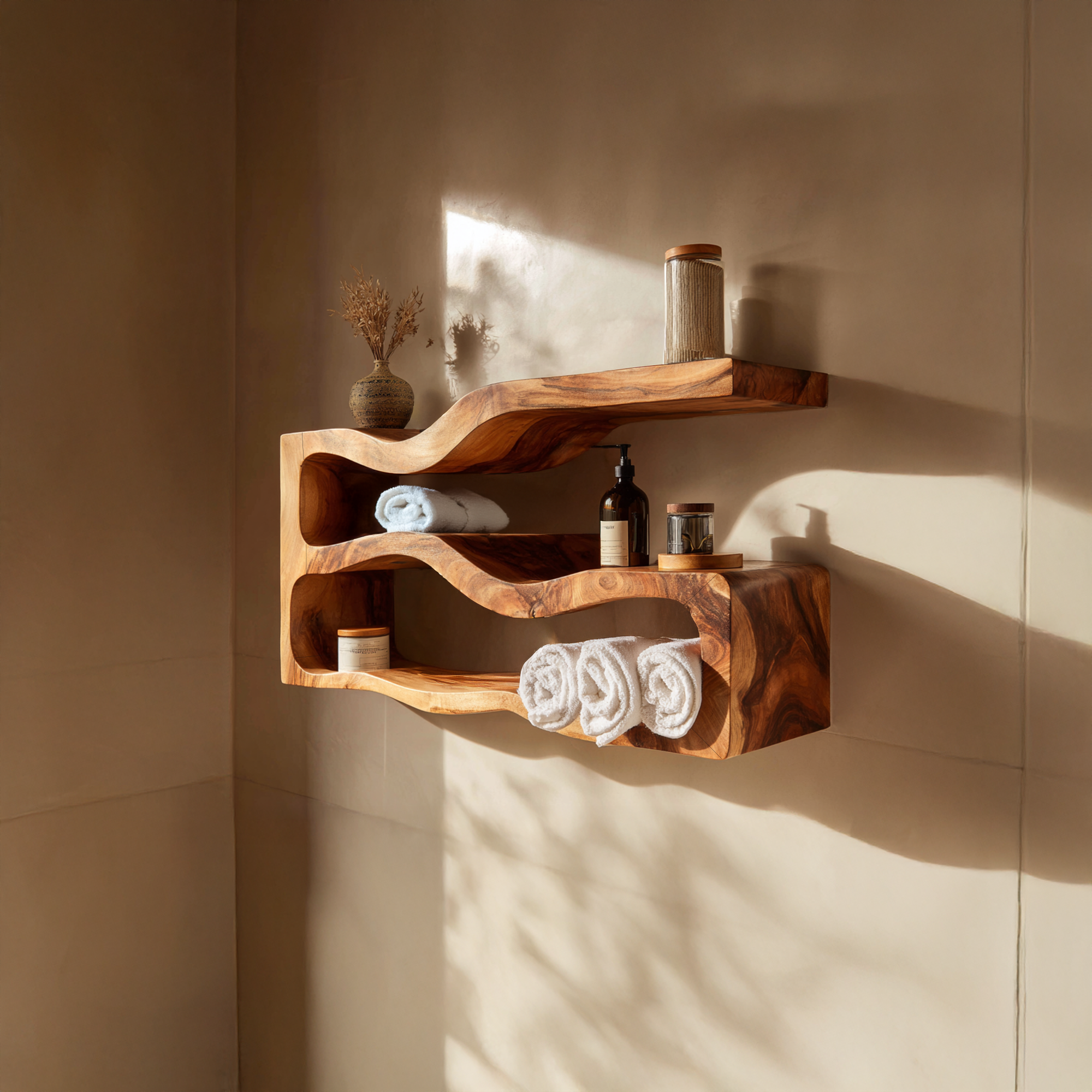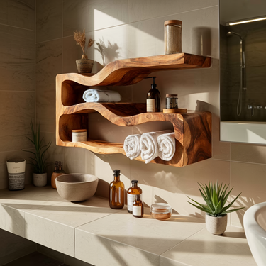 Bring warmth and organic elegance into your bathroom with this sculptural floating wood shelf unit. Designed as both functional storage and wall art, its flowing silhouette and carved open compartments create a striking architectural statement.
