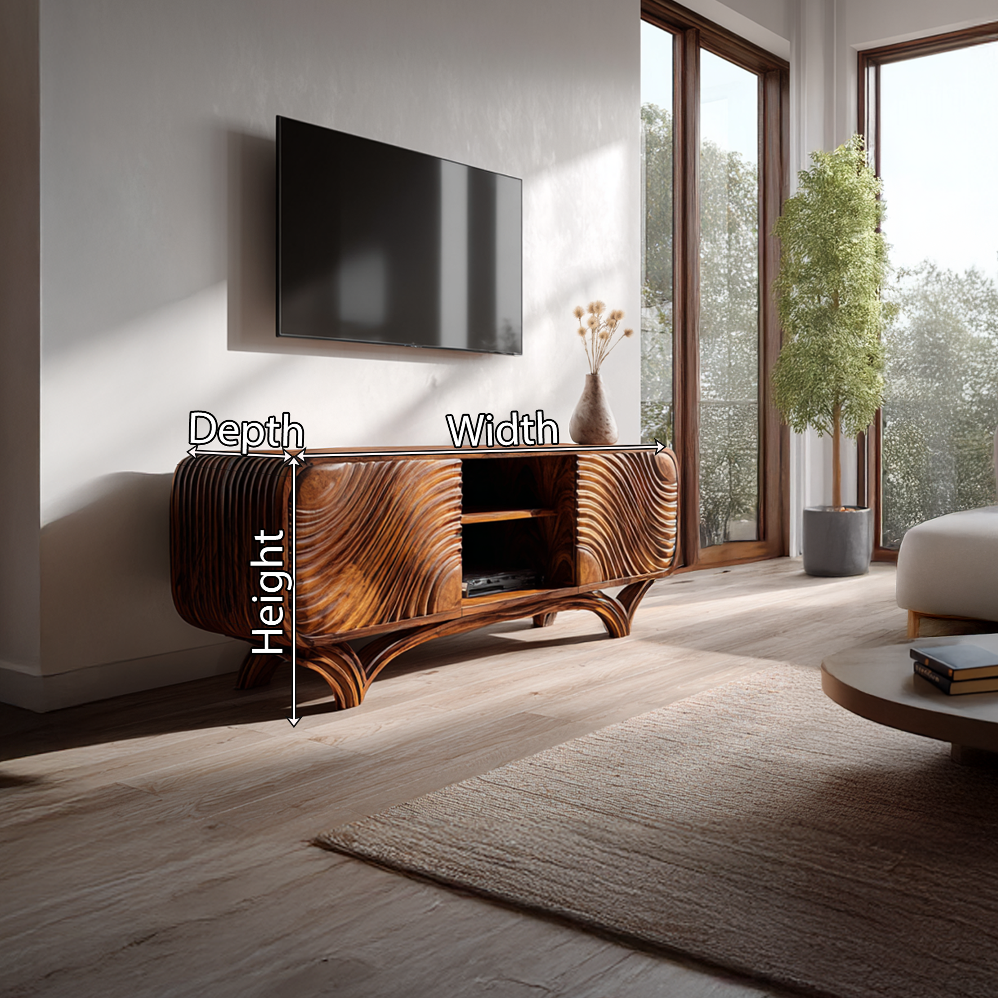 A bold fusion of artistry and craftsmanship, this sculptural solid wood TV stand transforms everyday storage into a statement of organic modern design. The cabinet’s rounded edges and flowing silhouette create a soft architectural presence, while the deeply carved wave patterns bring dynamic texture and movement across the surface. Elevated on elegantly arched legs, the piece feels both grounded and fluid an expressive focal point for refined interiors.