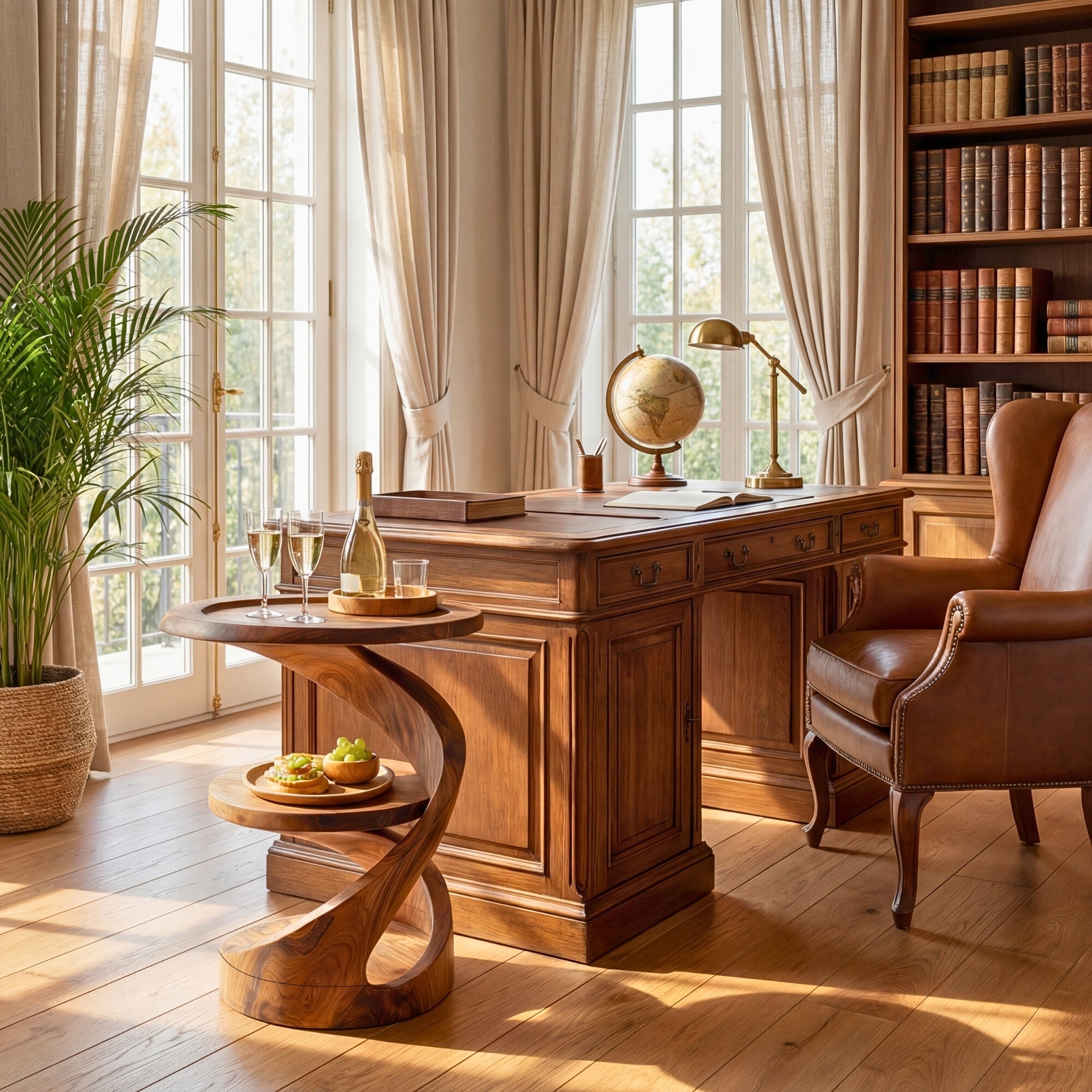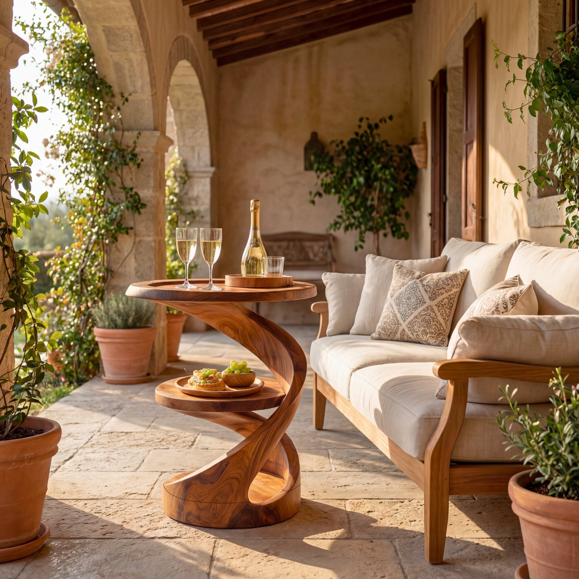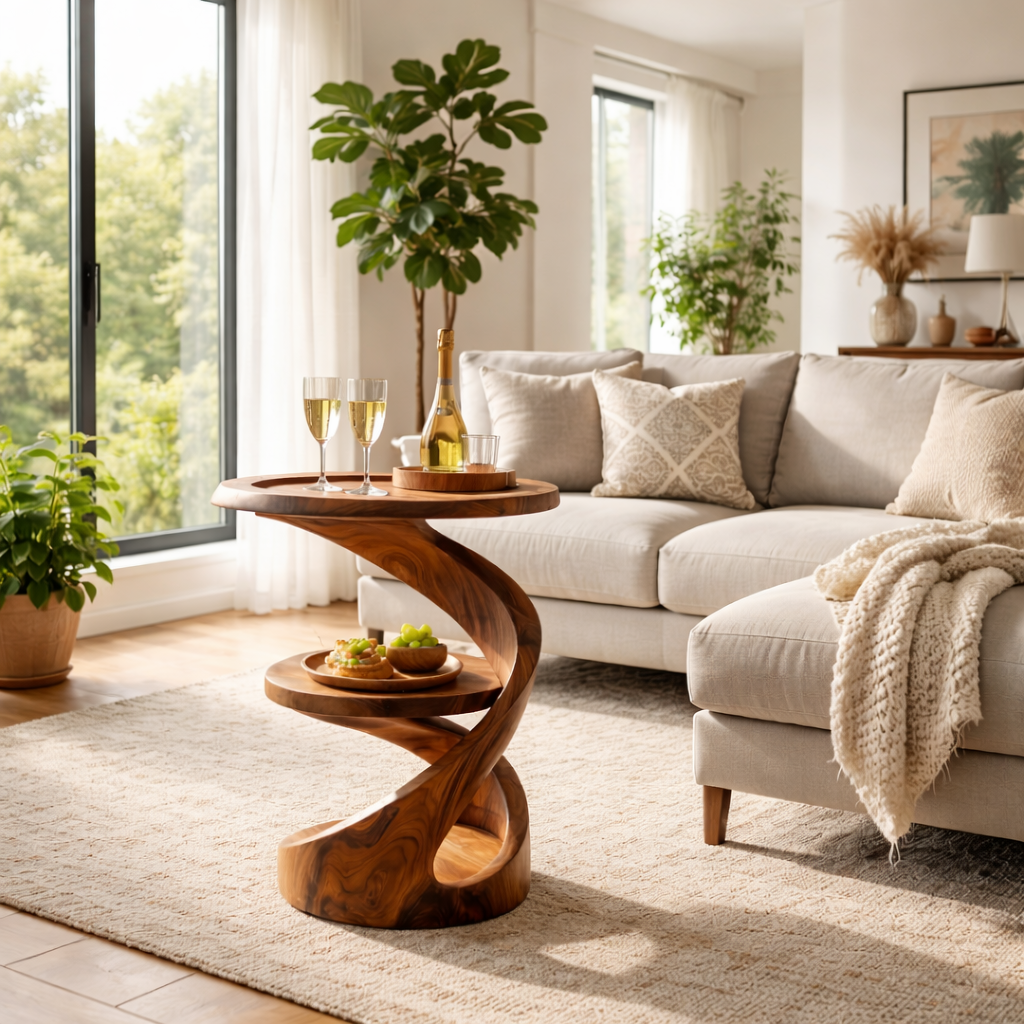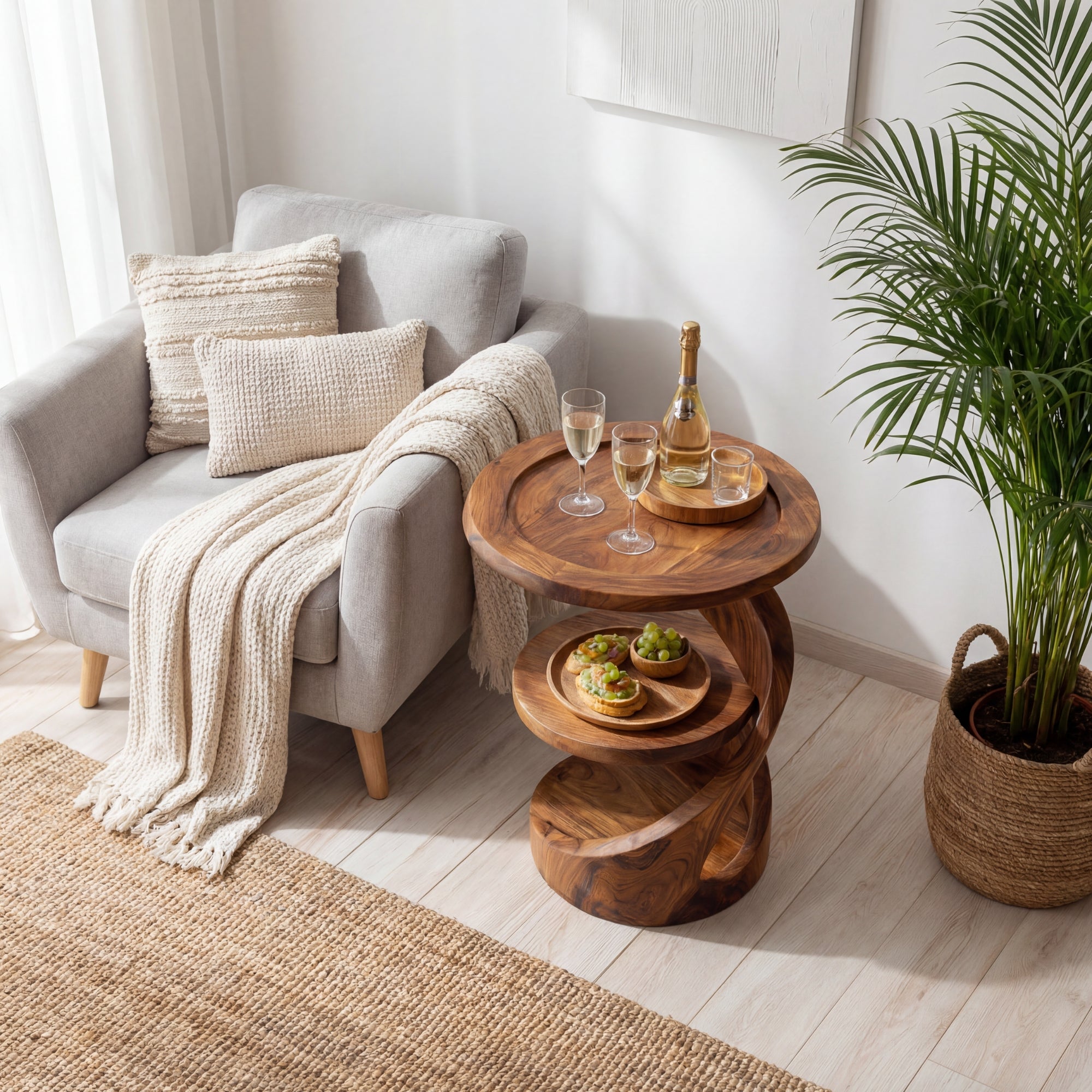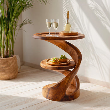 Crafted from solid wood, this sculptural side table features a sweeping helix form that connects a round tray style top with a functional lower tier. The twisting profile adds an elegant sense of movement while keeping a compact footprint, making it a refined accent for living room decor, lounge corners, or entertaining spaces.