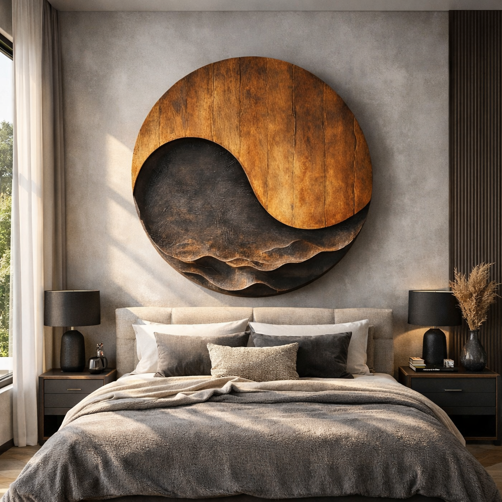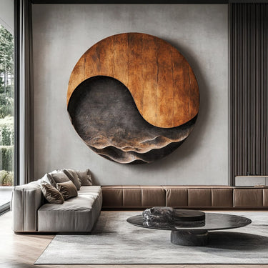 Add a sculptural focal point to your interior with this large abstract wall piece, hand carved from solid wood into a flowing, organic form. The circular composition pairs smooth grain with carved relief, evoking wave movement, crescent horizons, and natural landscape contours.