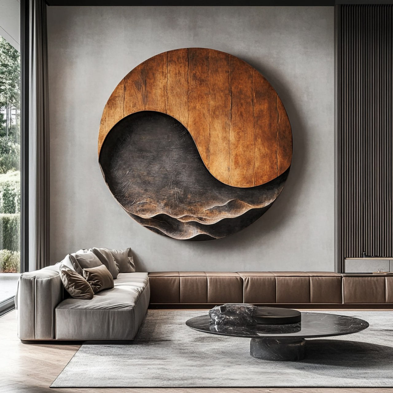 Designed as a feature wall centerpiece, it complements living rooms, open lounges, penthouses, studios, and hospitality spaces. Because solid wood is a natural material and each piece is finished individually, slight variations in grain, tone, and surface detail may occur.