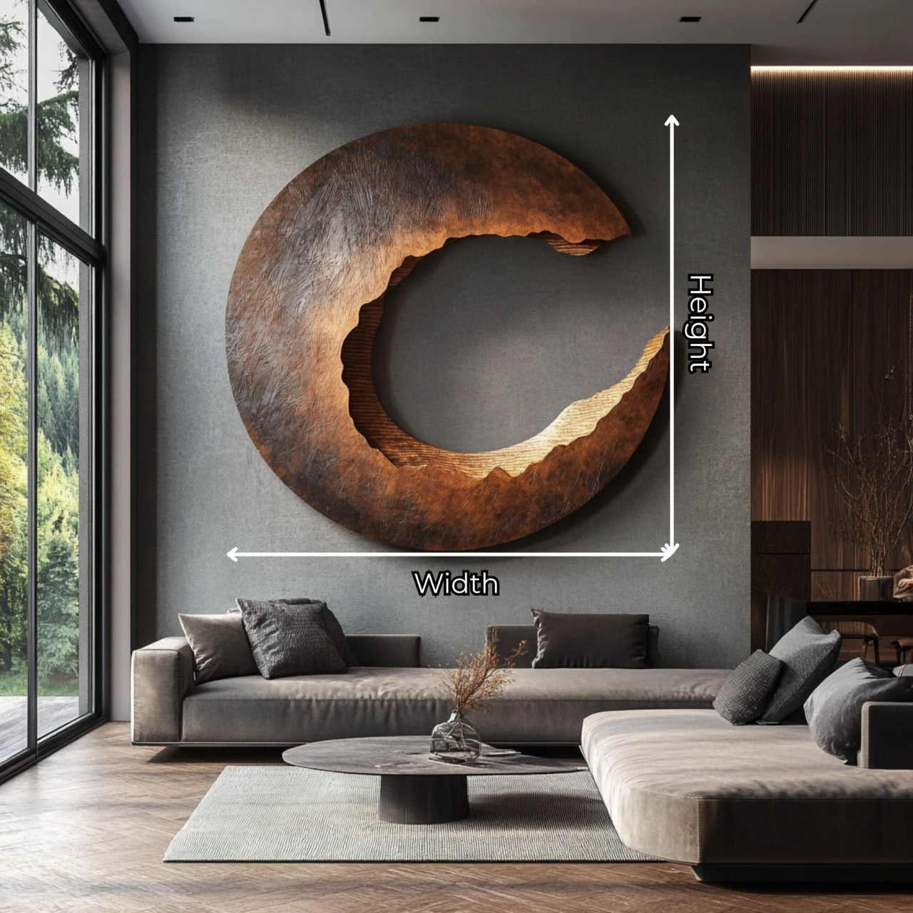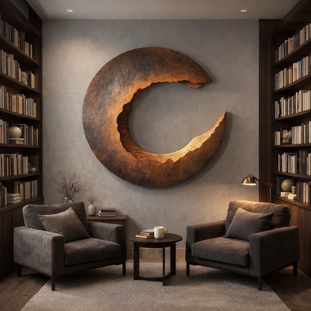 This large solid wood wall sculpture is hand-carved into a sweeping crescent form, combining smooth contours with richly textured surfaces. The silhouette evokes natural formations such as ridge lines, tidal movement, and changing moon shapes, bringing a calm sense of motion and sculptural depth to the wall.