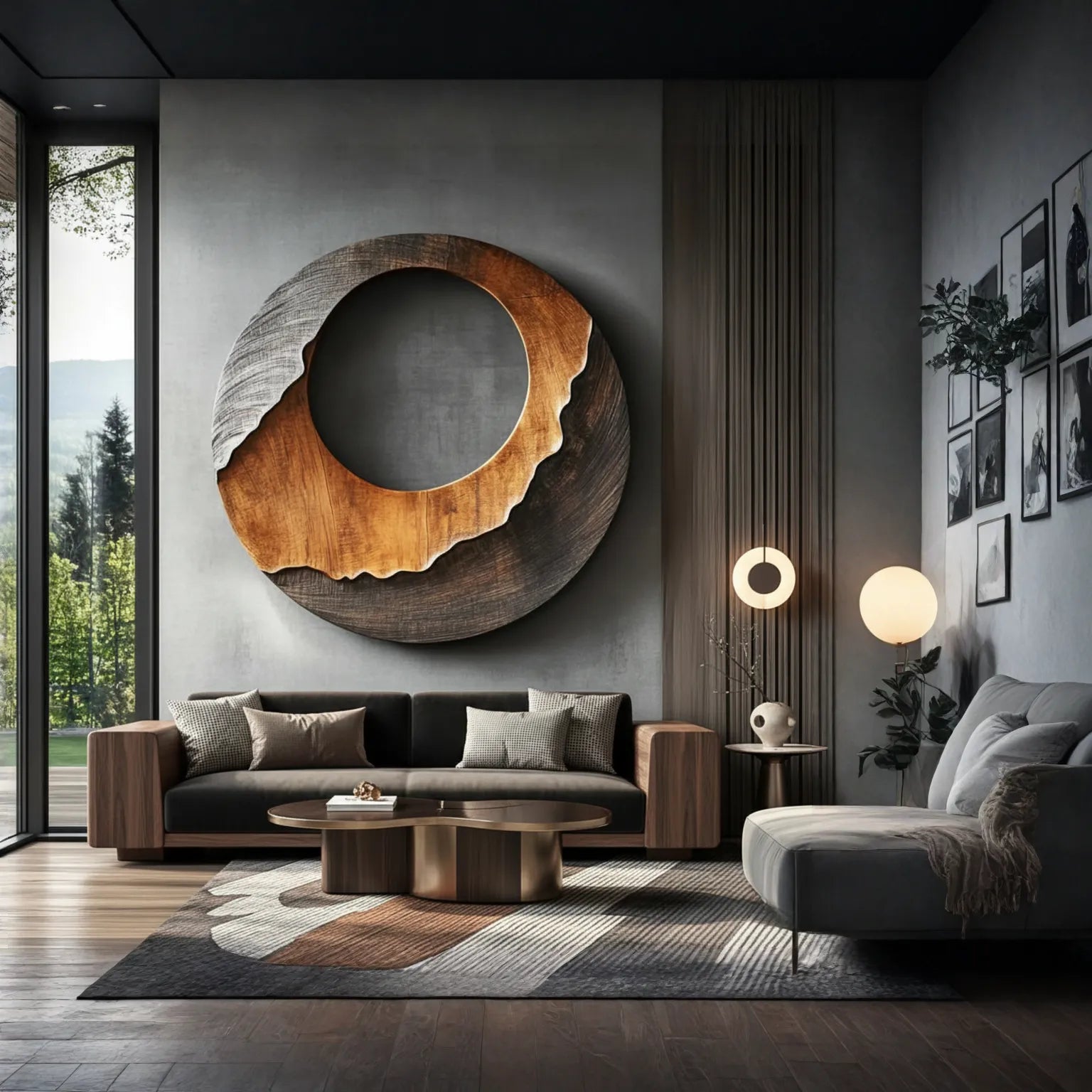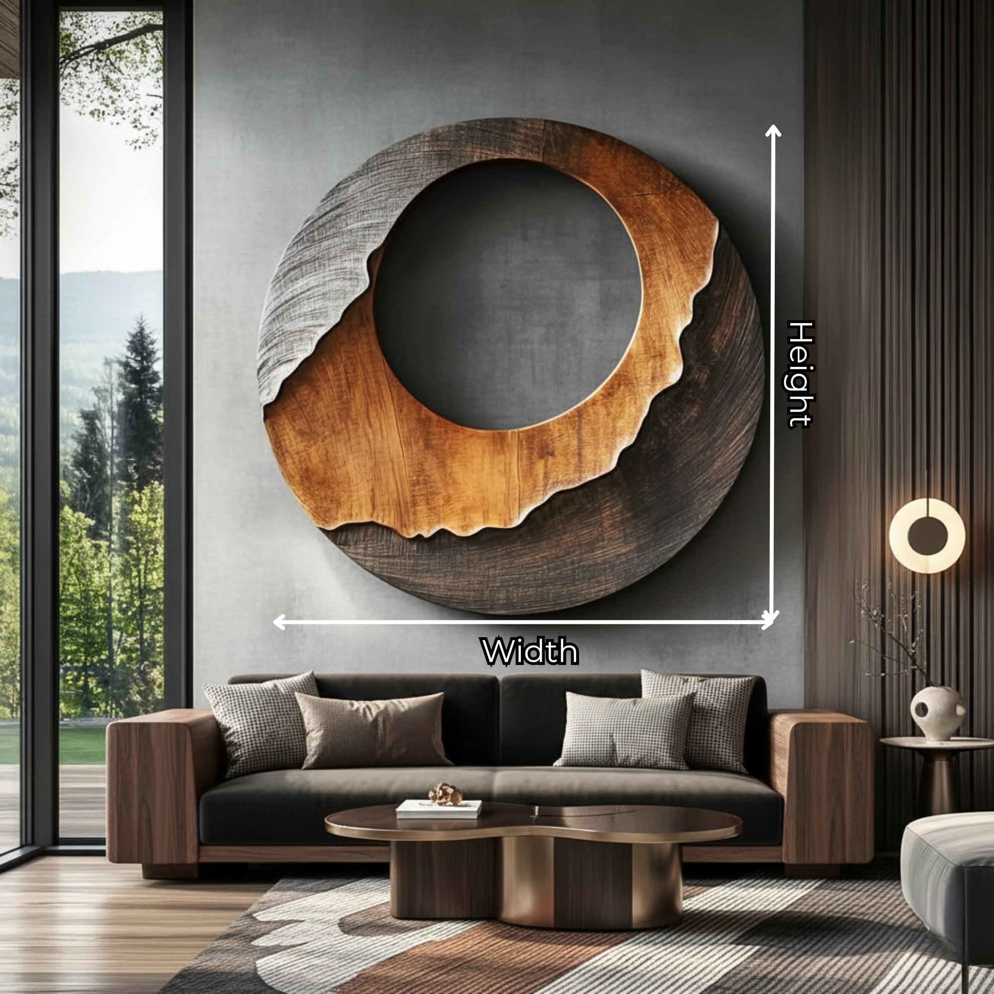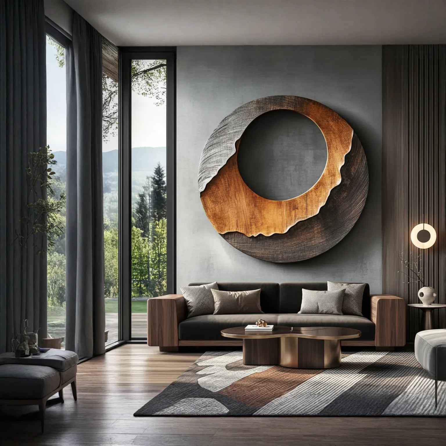This layered round solid wood wall sculpture introduces a modern organic focal point for contemporary interiors. The design features a large circular form with a recessed open center and a contrasting outer band that appears to flow across the surface like a carved landscape. The balance between the smooth upper section and the darker textured lower arc gives the piece a calm yet distinctive sculptural presence on the wall.