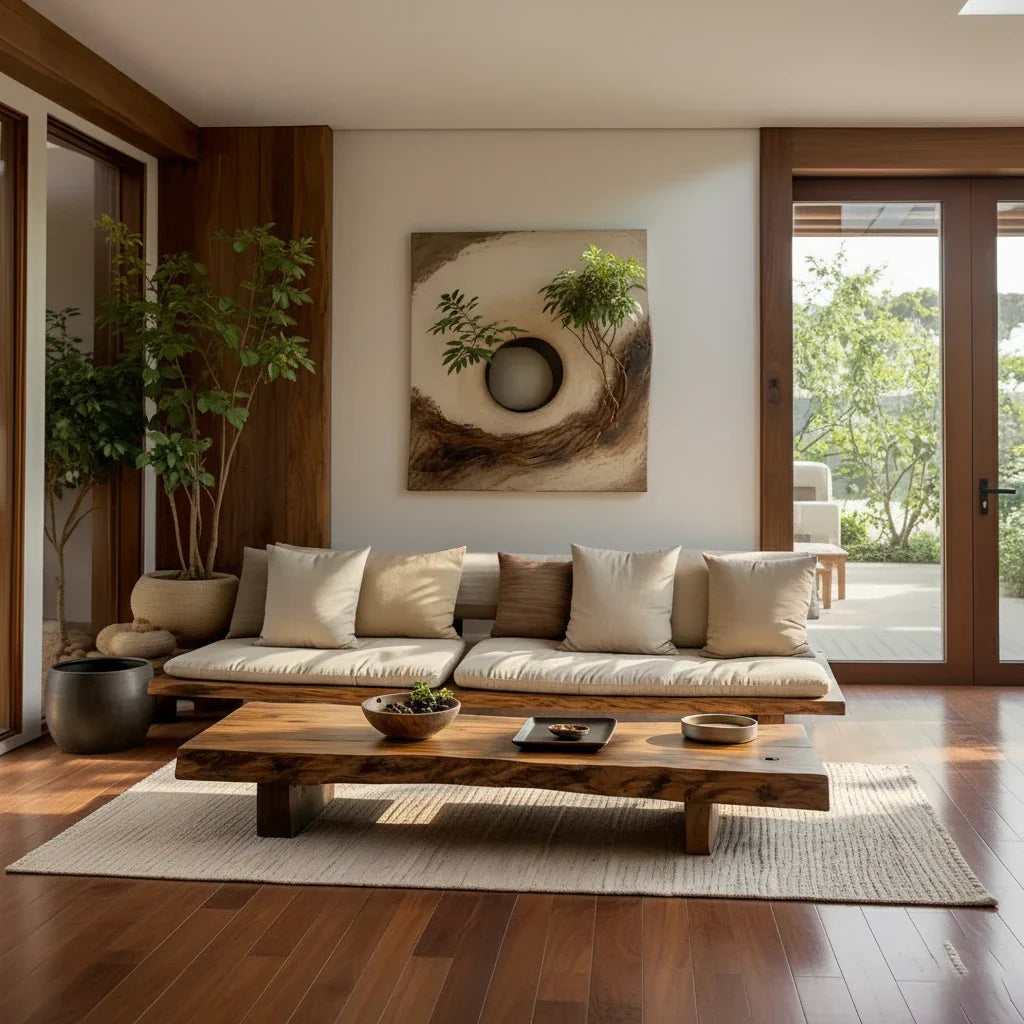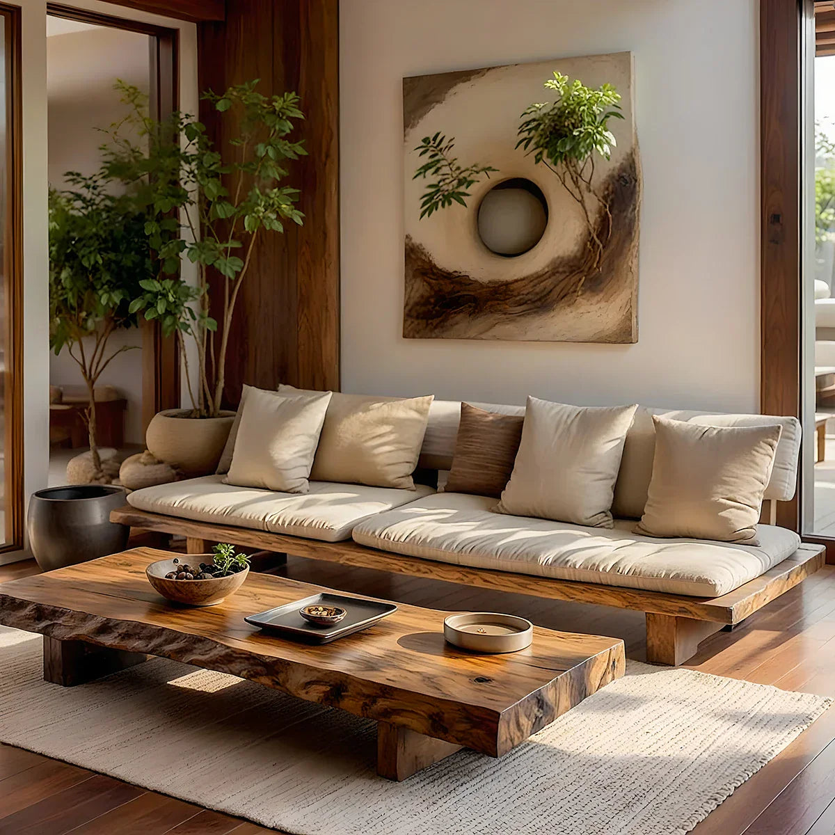 This live-edge solid-wood coffee table is designed as a calm, grounding centerpiece for Japandi-inspired living rooms. The broad, low slab top follows the natural contour of the tree, with softly undulating edges and rich grain that catch the light and invite touch. Its understated height encourages relaxed lounging, floor cushions, and slow tea moments, creating an intimate gathering zone at the heart of the room.