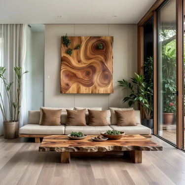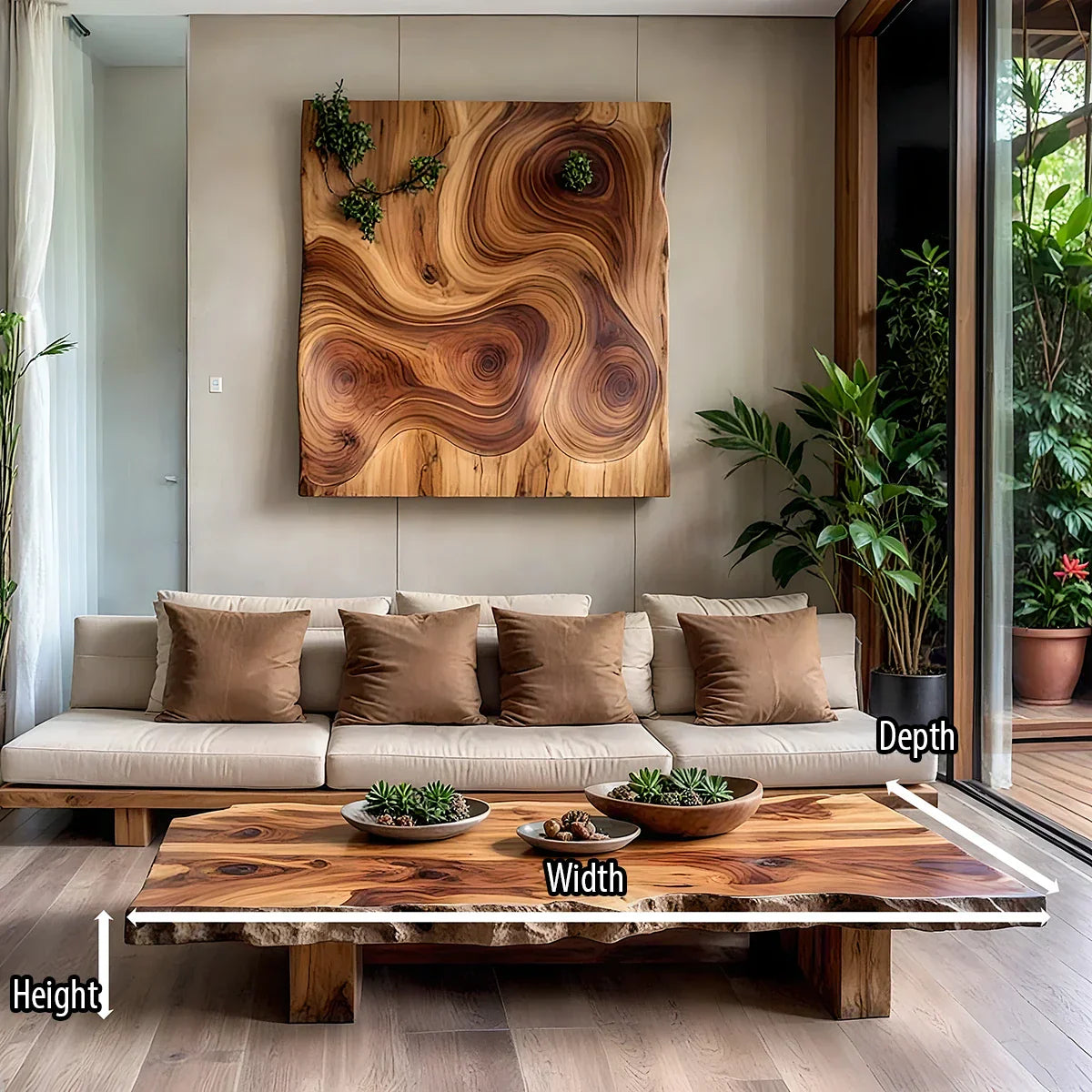 This live-edge solid-wood coffee table is designed as a calm, grounding focal point for organic modern living rooms. The wide slab top follows the natural contour of the tree, with softly sculpted edges and rich, flowing grain that echo the wall art and surrounding greenery. Low and expansive, it creates an inviting platform for ceramics, books, and everyday rituals while keeping the space open and airy.