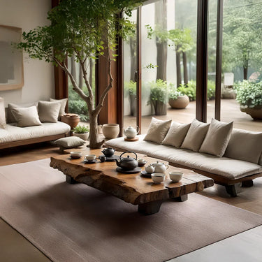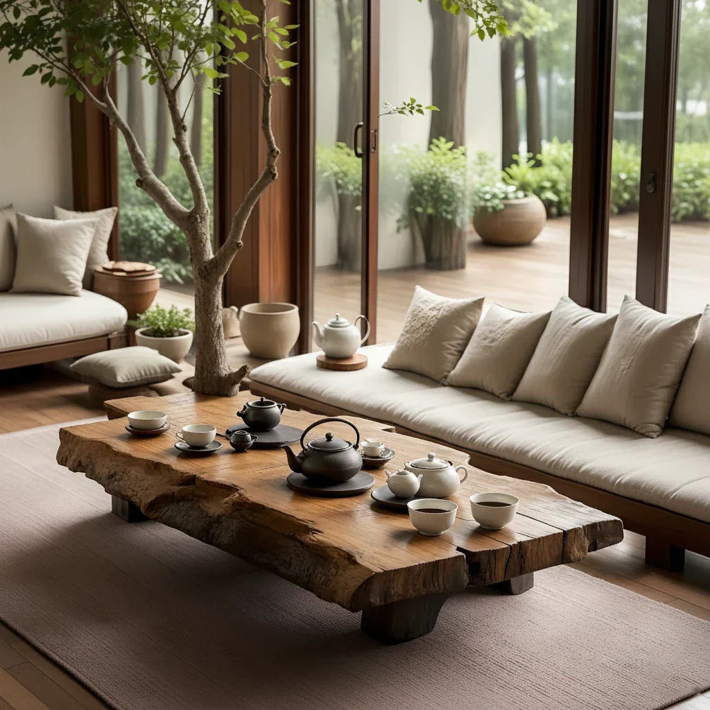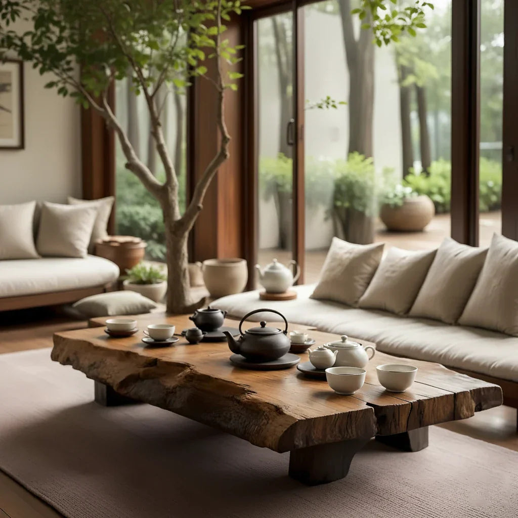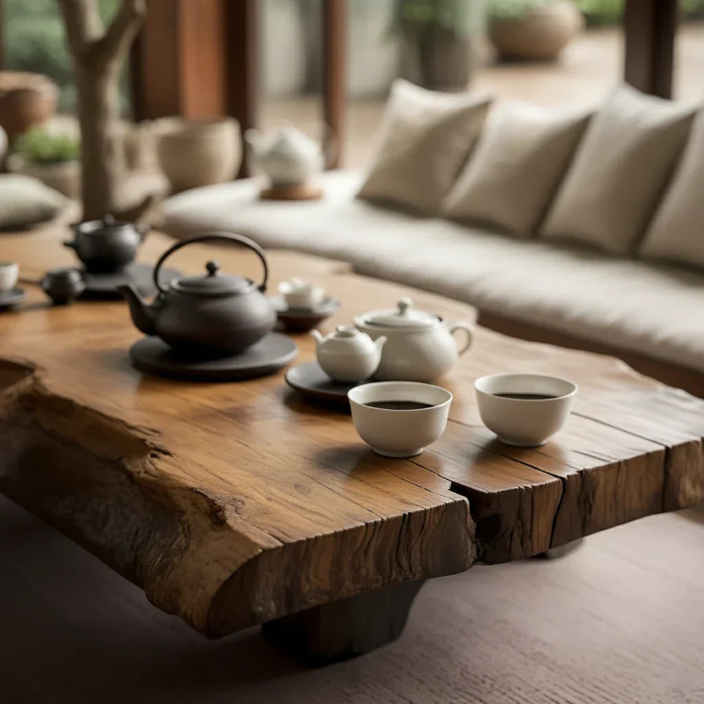 Perfect for Japandi, wabi-sabi, and nature-inspired interiors, this tea table works beautifully in a garden-view living room, a covered terrace, or a dedicated Zen corner. Styled with simple ceramic teaware, linen cushions, and potted greenery, it functions as both practical furniture and natural-wood décor. Combining live-edge artistry, solid-wood construction, and a serene low profile, it brings warmth, harmony, and an organic-modern focal point to any home.