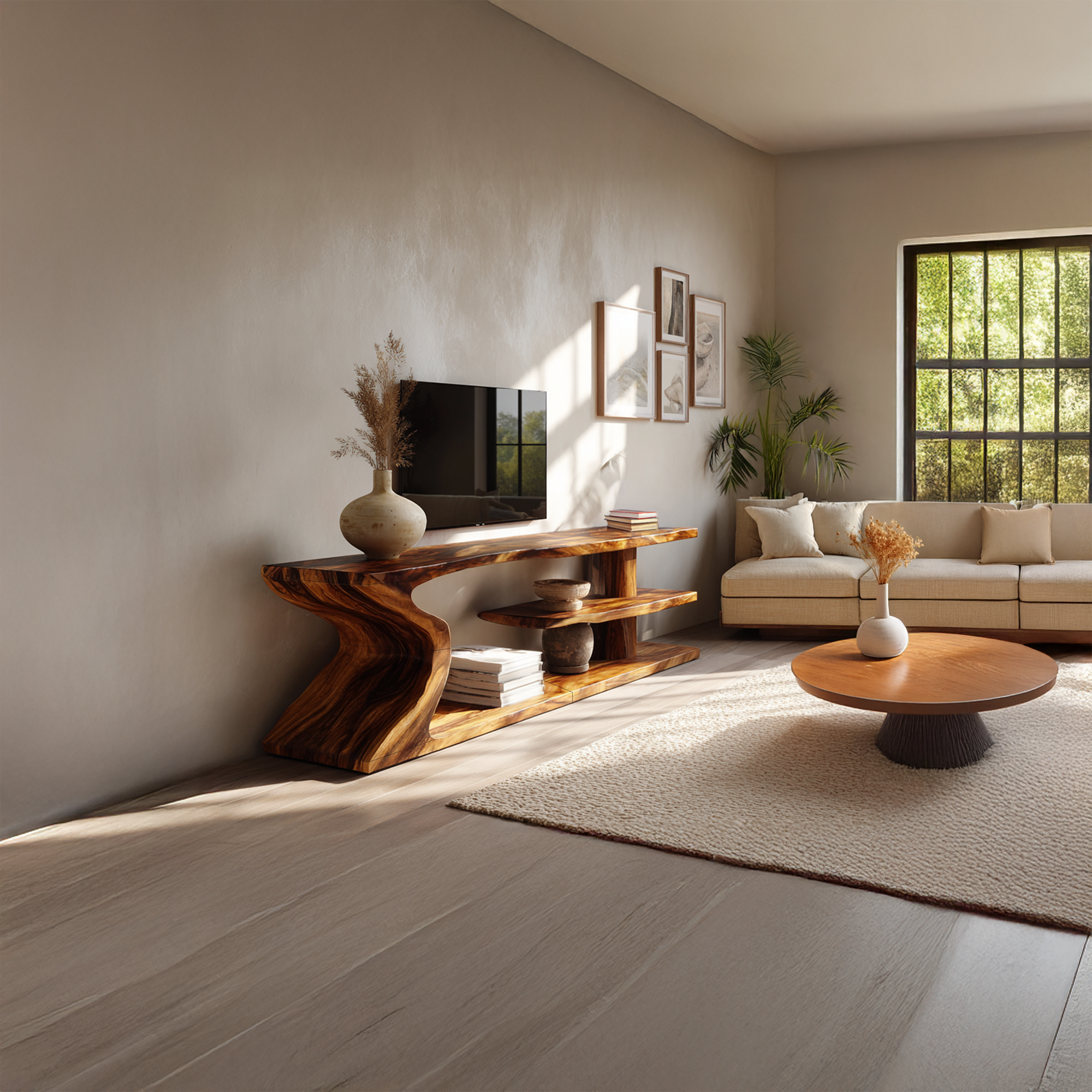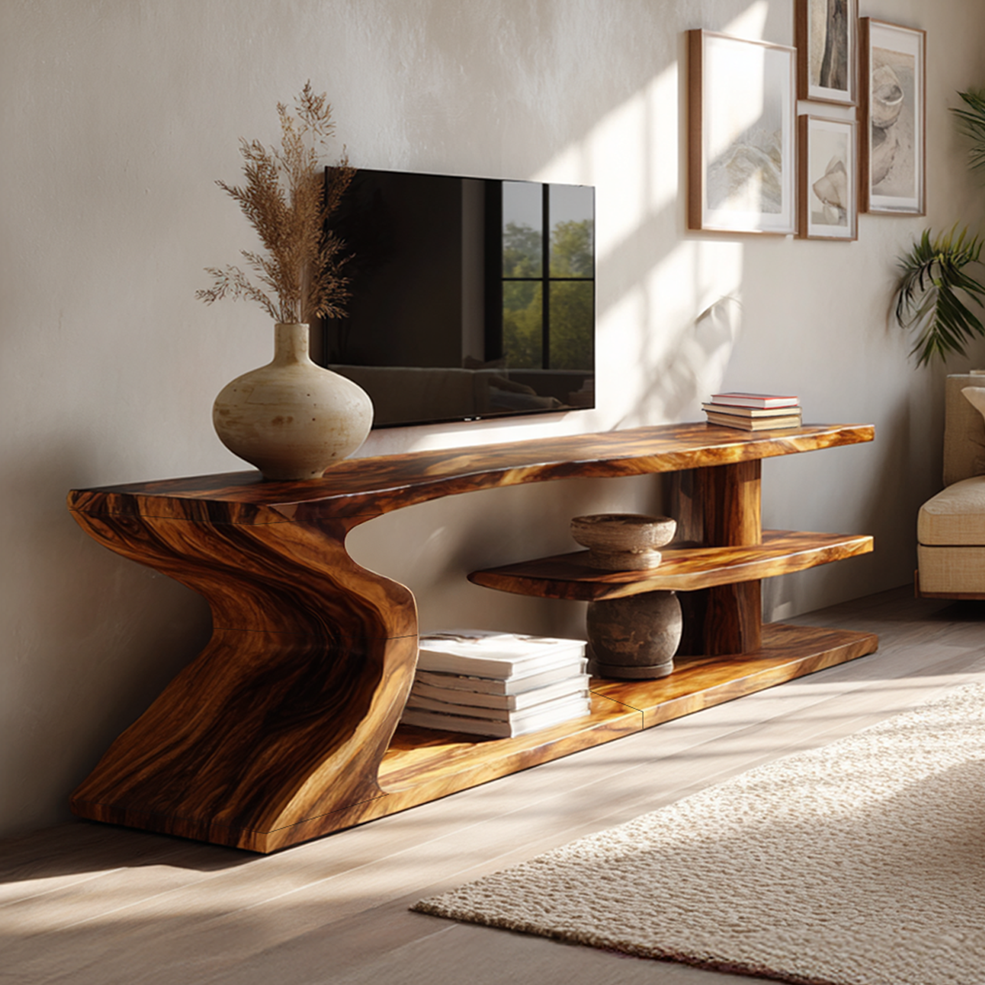 Sculptural Live Edge Wood TV Stand with Flowing Base