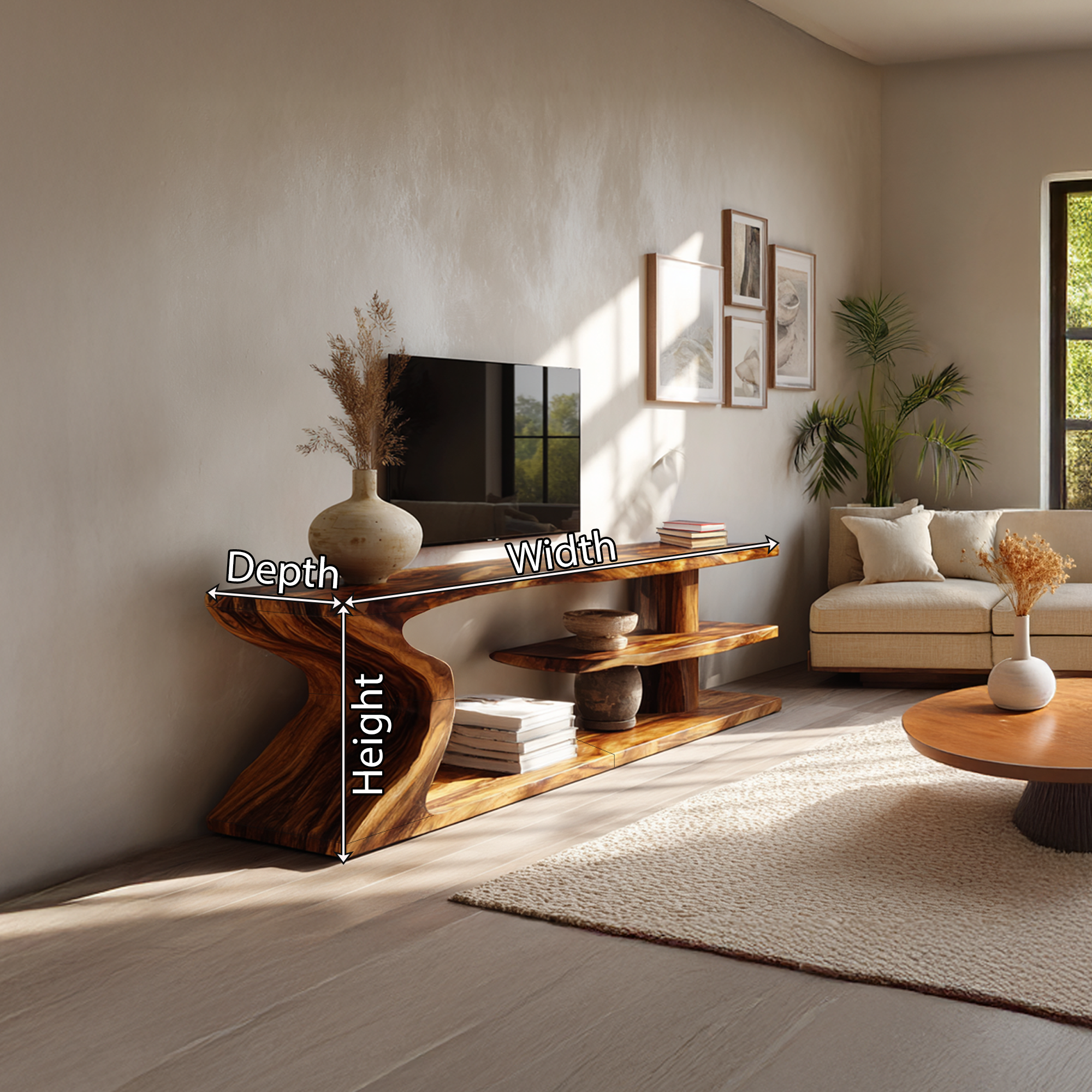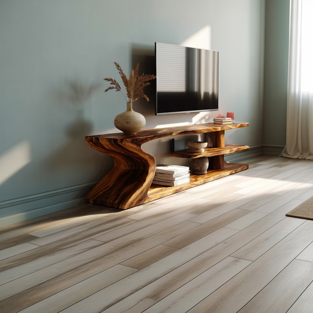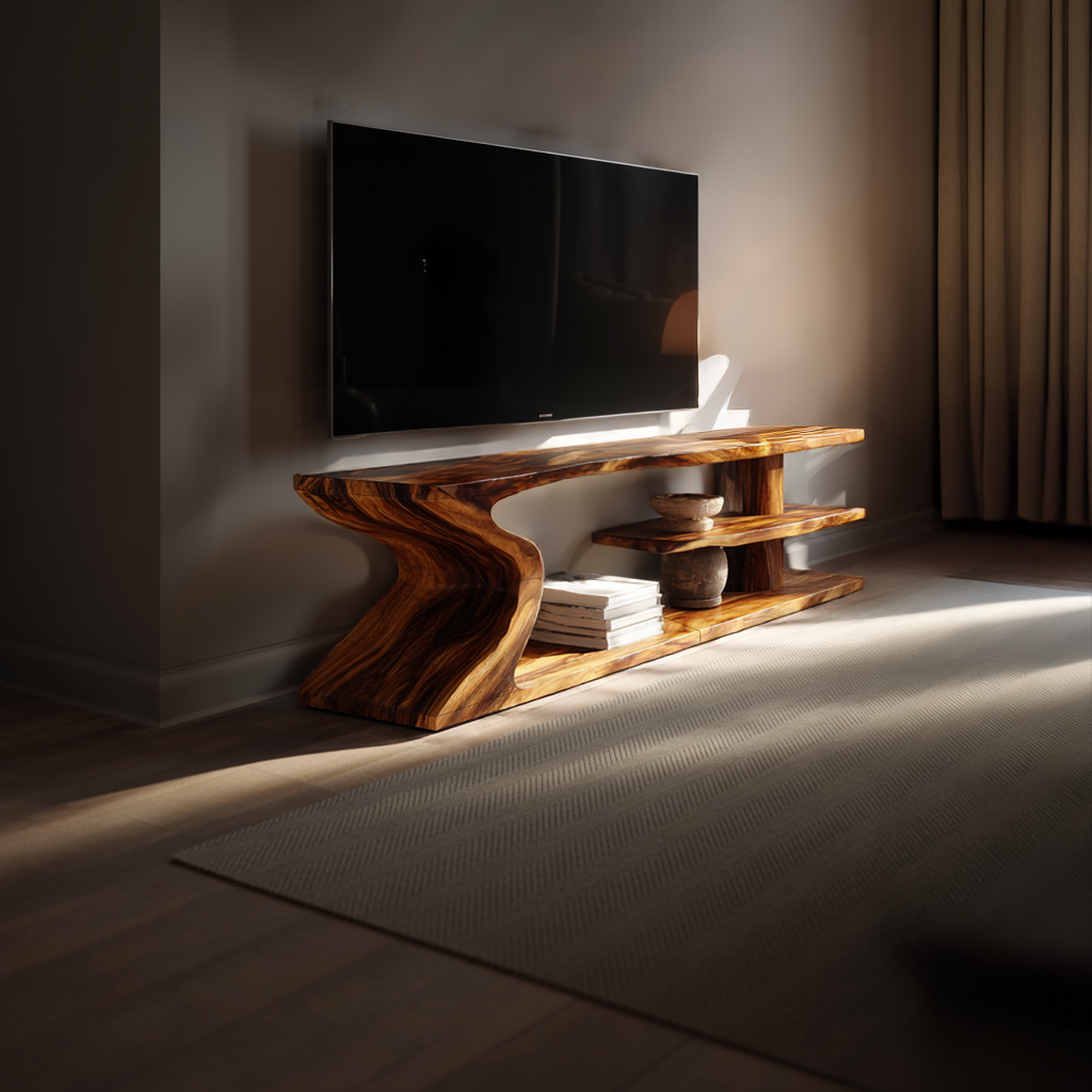 An expressive fusion of art and function, this sculptural live edge wood TV stand is designed to bring movement and organic elegance into modern interiors. The flowing, curved base creates a dramatic architectural silhouette, while the elongated top highlights the natural contours of the wood, forming a striking visual statement from every angle.
