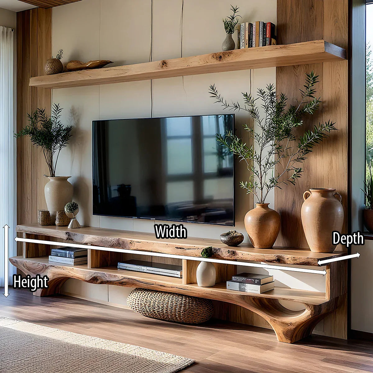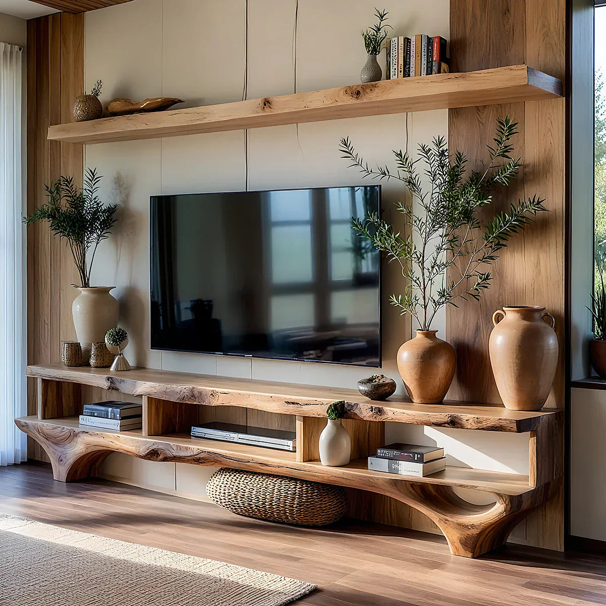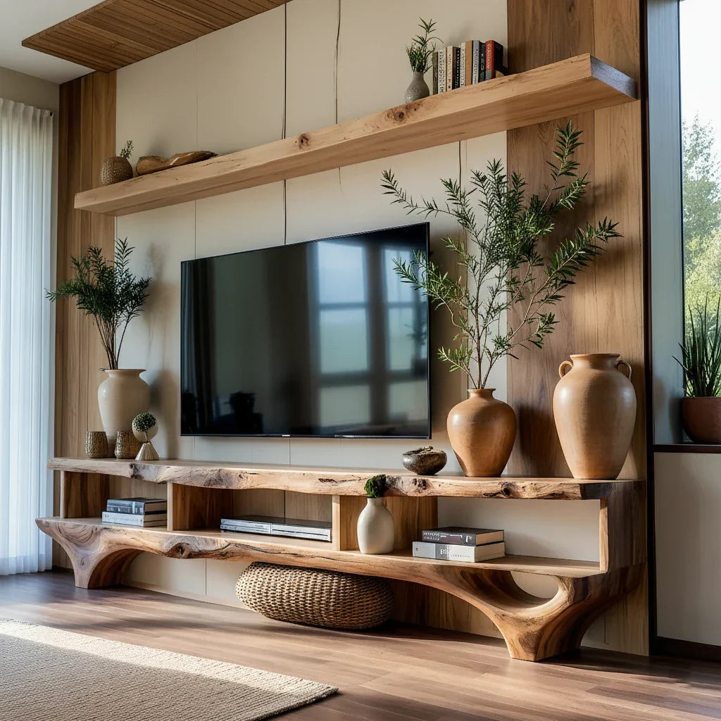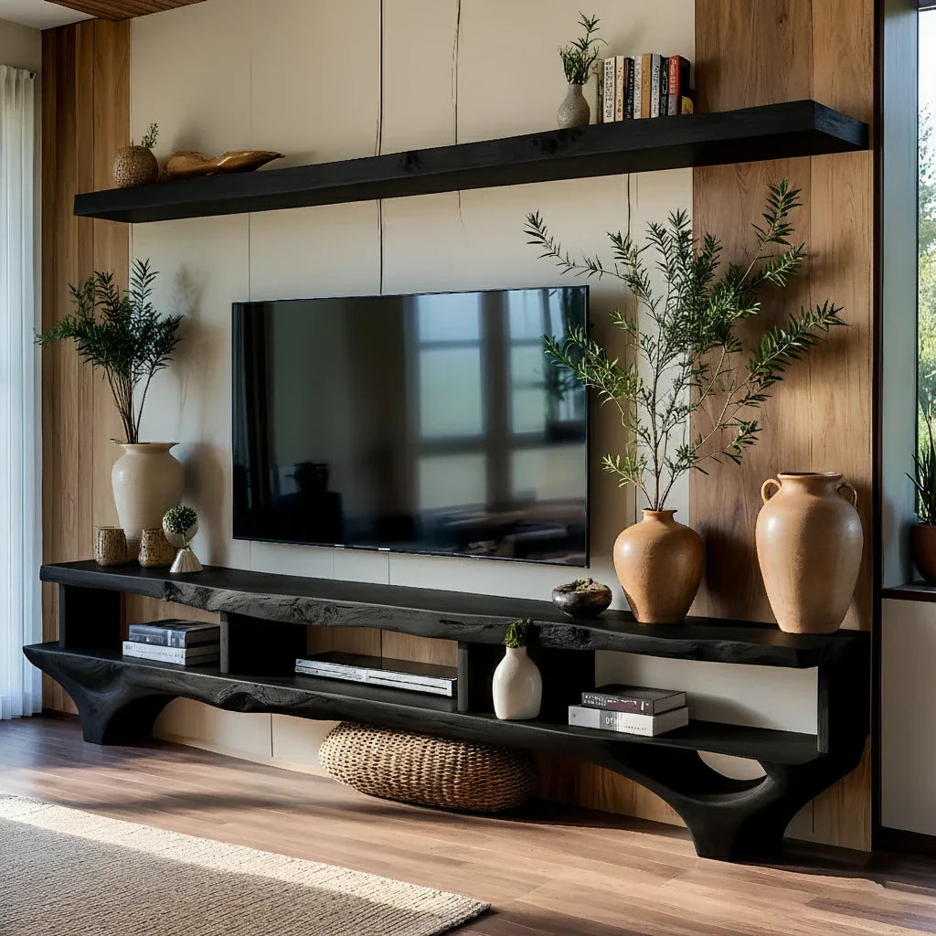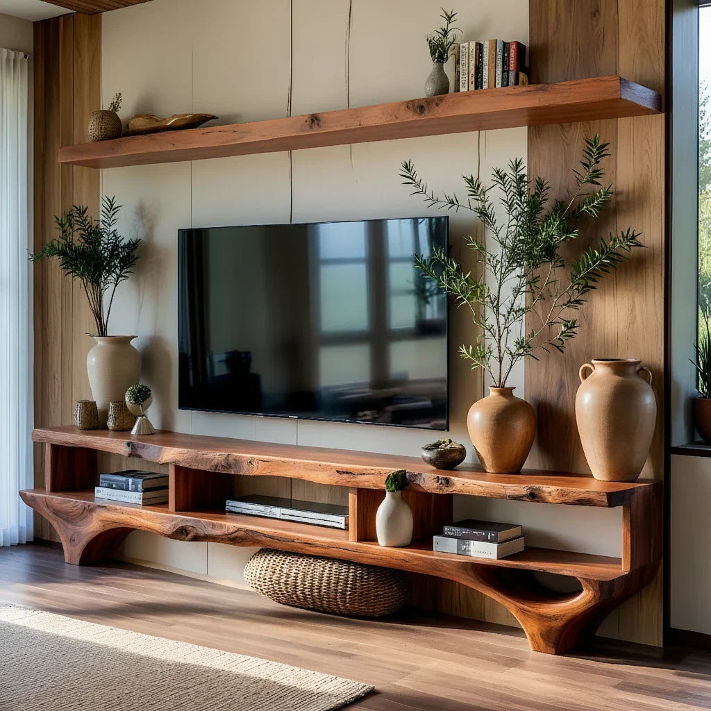 This live-edge style TV console and wall-mounted shelf set is designed to create a calm, cohesive media wall with warm, sculptural character. The long, grounded console anchors the space with an organic front edge and a clean, low profile, while the oversized shelf above frames the screen and adds an elevated styling zone for books, ceramics, and decorative objects. Together, the pieces bring balance and visual rhythm to modern living spaces refined, minimal, and easy to live with.