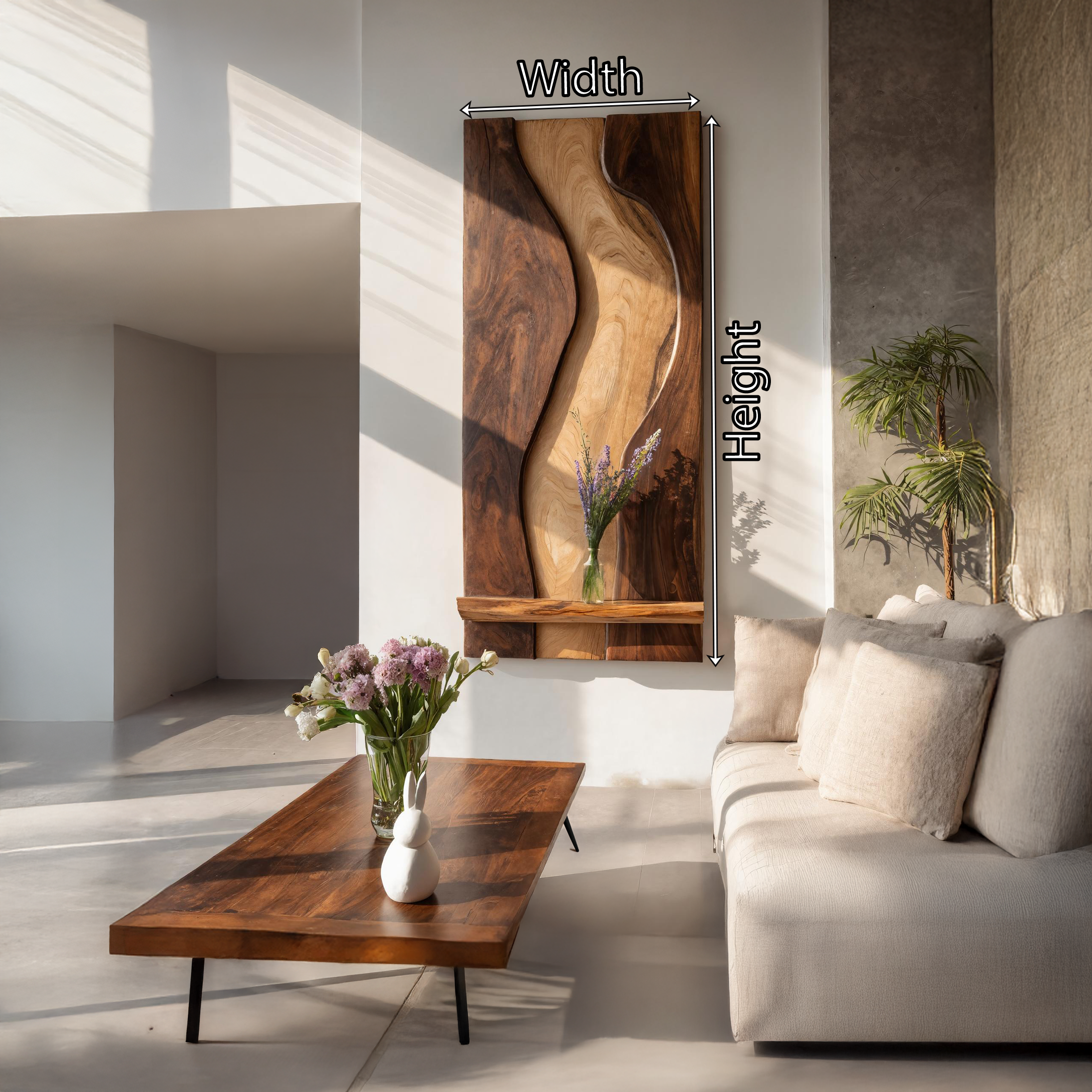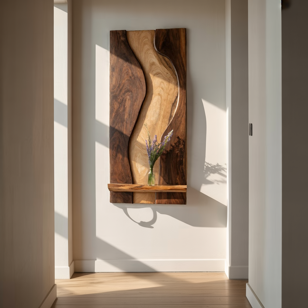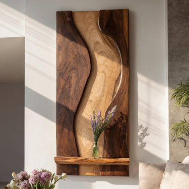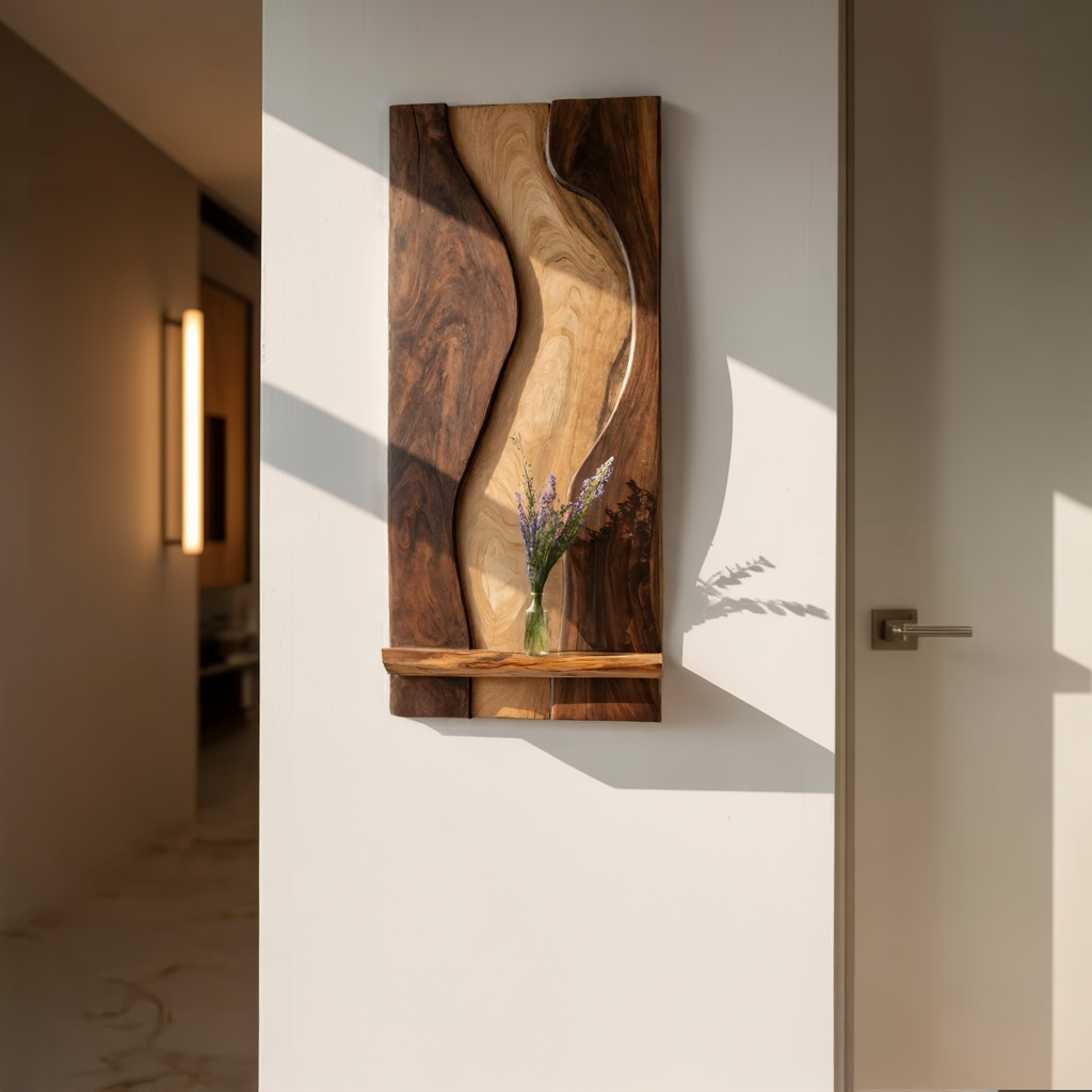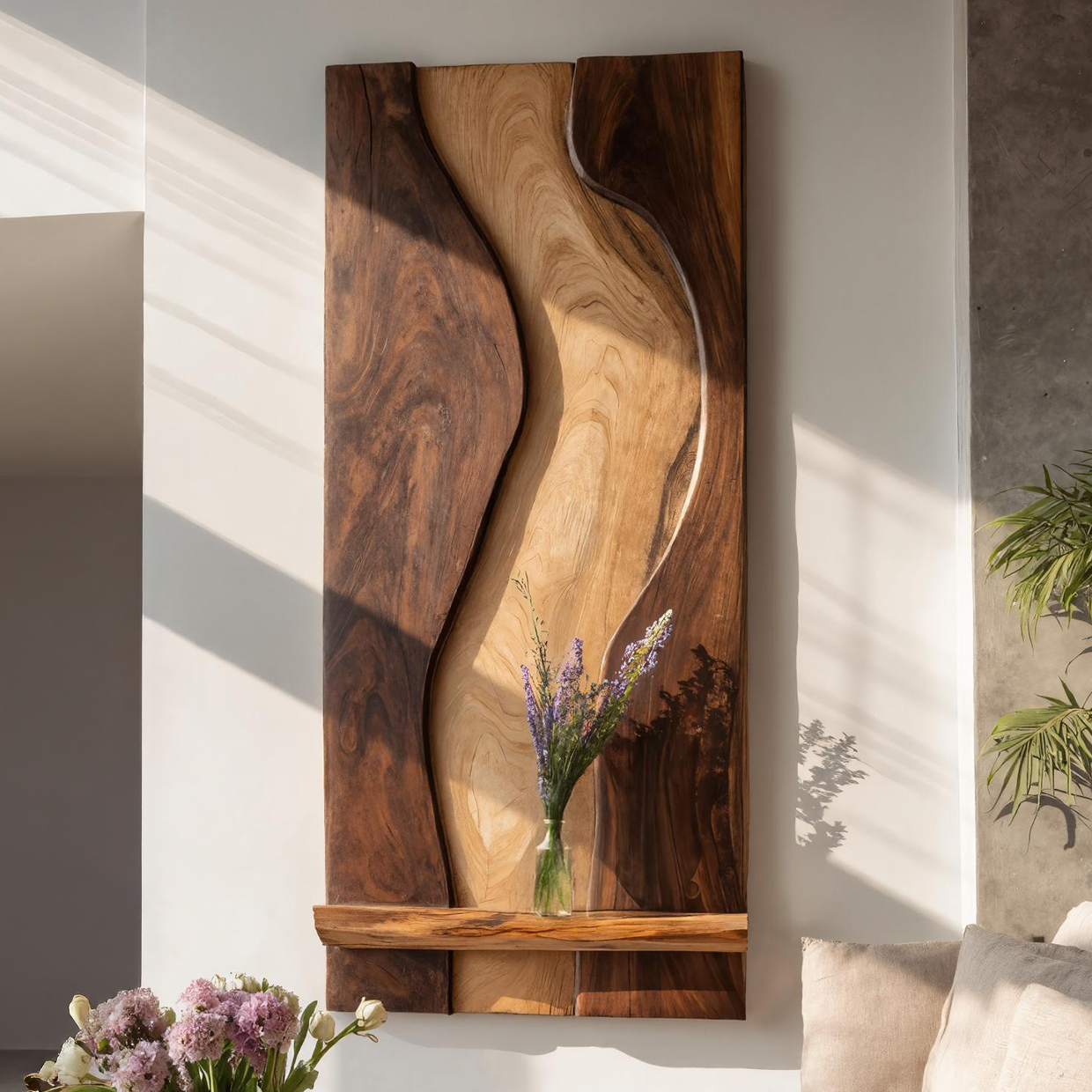 Handcrafted from premium solid wood, each panel highlights the authentic grain patterns and tonal depth unique to natural timber. The sculpted surface adds dimension and shadow play, enhancing the artwork’s presence as light shifts throughout the day. A minimalist floating wood shelf is seamlessly integrated at the base, providing a functional display space for vases, greenery, candles, or small decorative accents.
