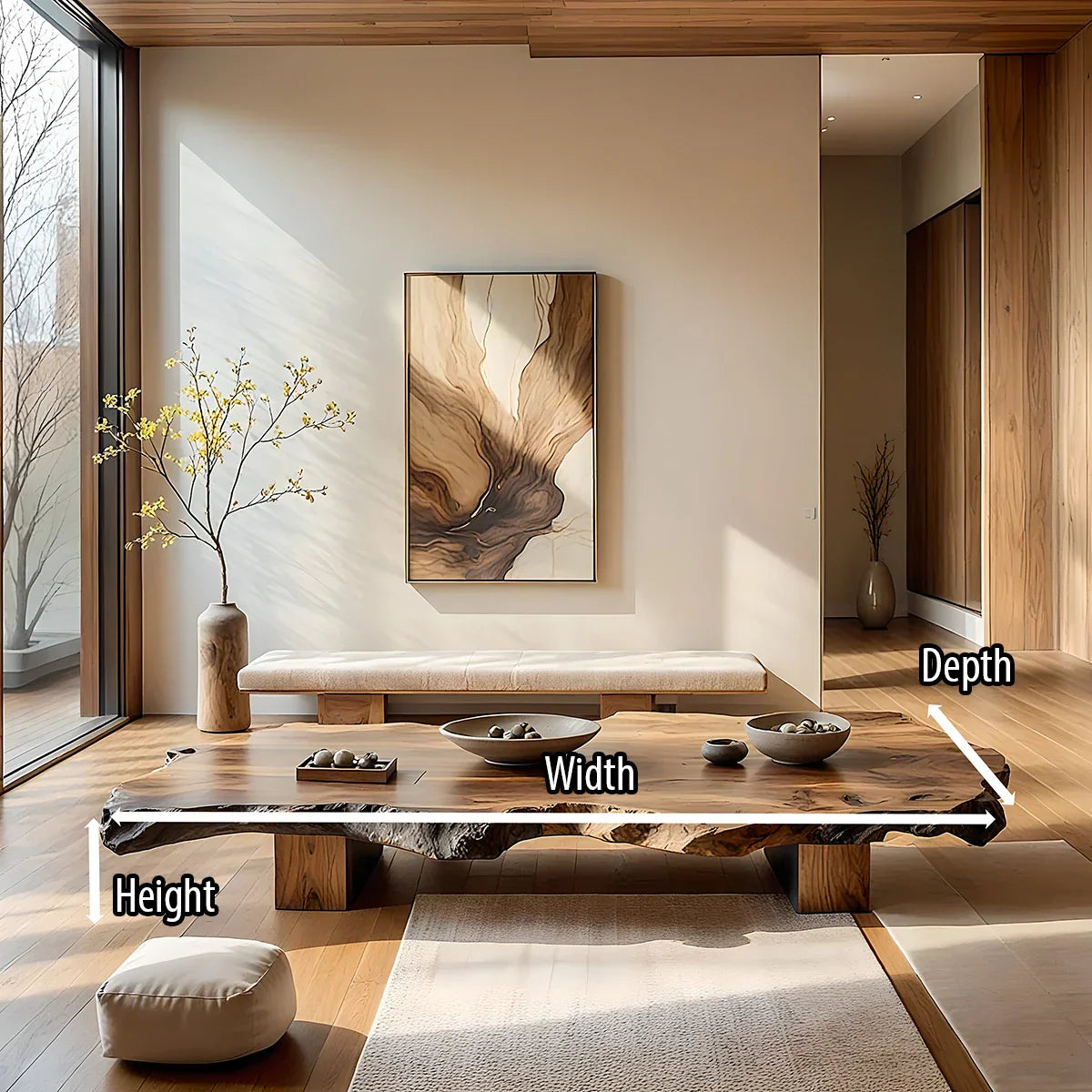 Set on sturdy block legs, the silhouette remains simple and grounded, perfectly suited to Japandi, wabi-sabi, and modern Zen interiors. The low height invites floor cushions, quiet conversation, and slow rituals—whether you are sharing tea, arranging ceramics, or enjoying a moment of stillness by the window. Styled with a few thoughtful objects or left mostly clear, this solid-wood table brings warmth, balance, and a calm focal point to any contemporary home.