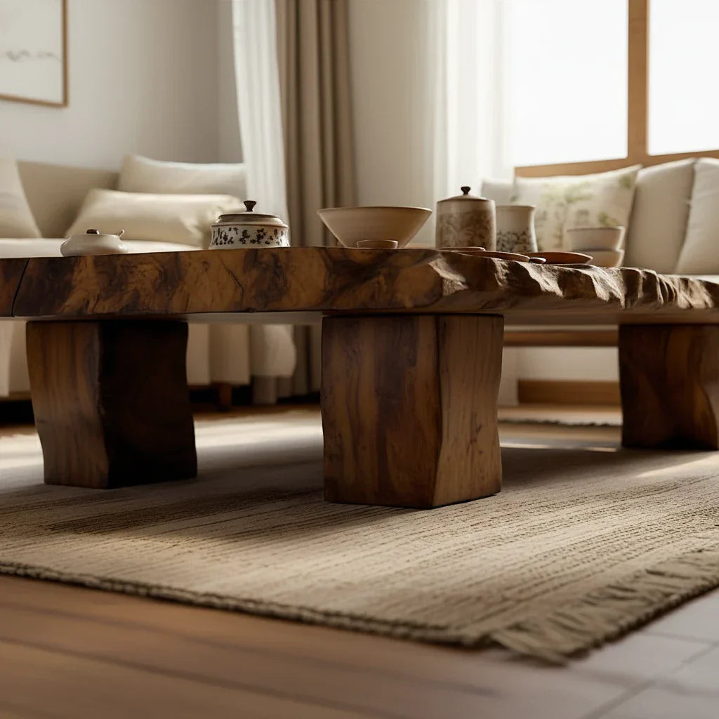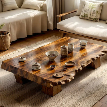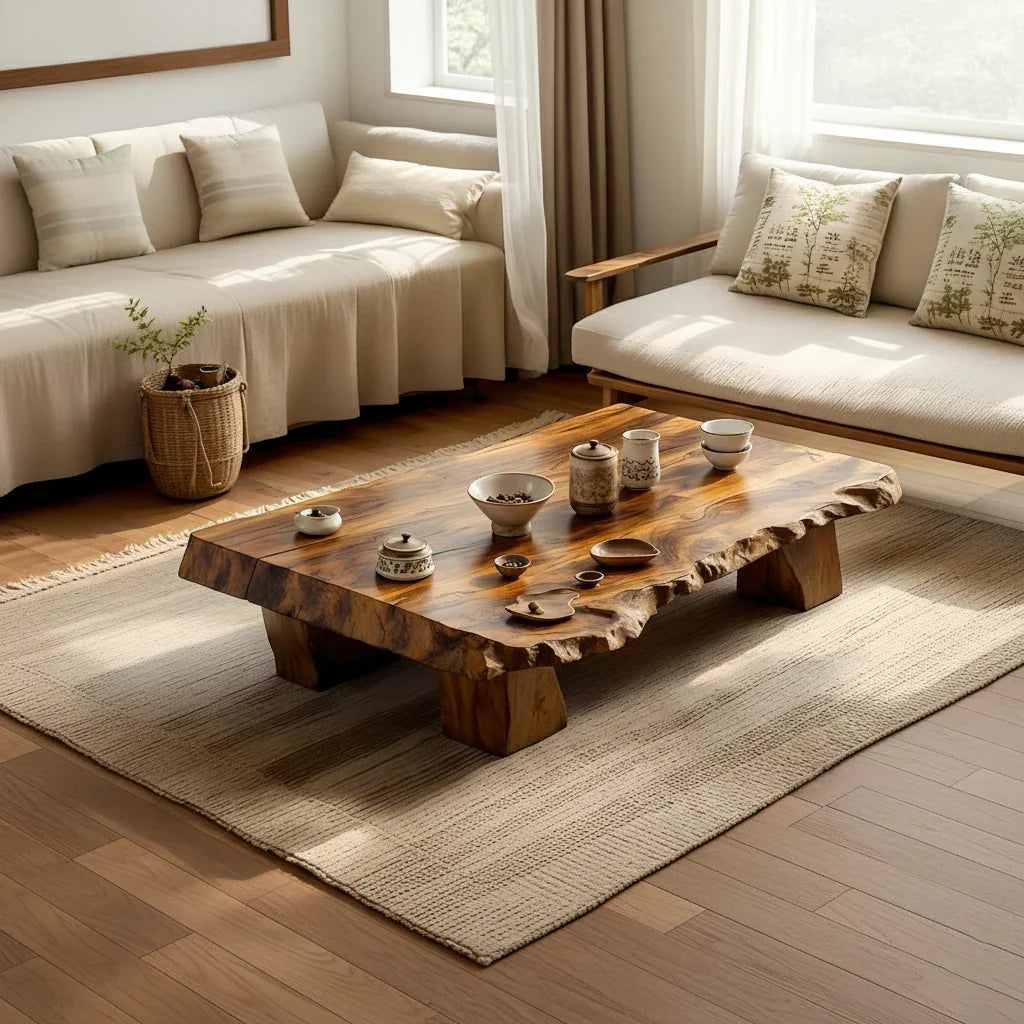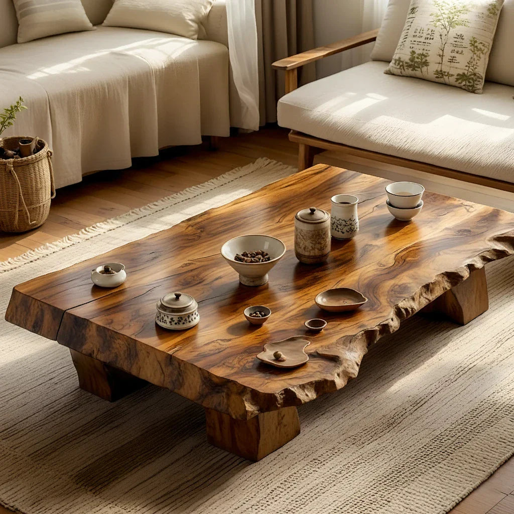 Perfect for Japandi, wabi-sabi, and modern organic interiors, this coffee table pairs beautifully with soft neutral upholstery, textured rugs, and simple ceramic tea sets. It offers a generous surface for serving, reading, or styling décor while acting as a functional piece of natural-wood art. Combining solid-wood construction, minimalist design, and a distinctive textured edge, it brings warmth, movement, and a serene focal point to any contemporary home.