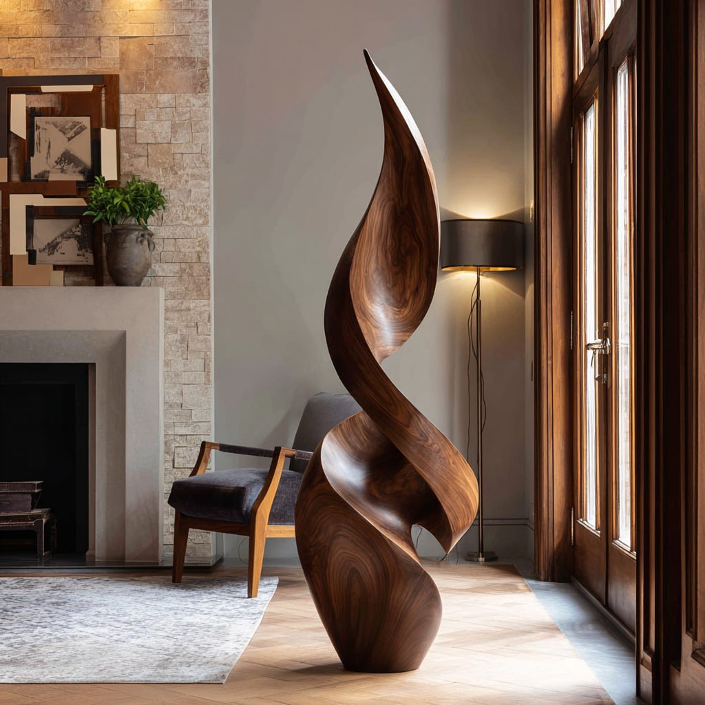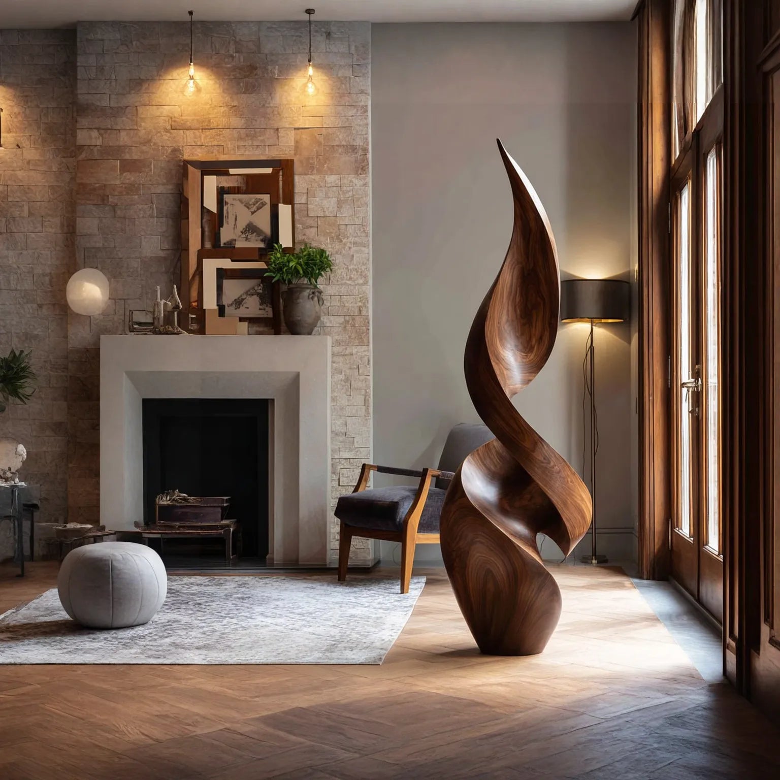 This modern abstract solid wood sculpture brings balance, movement, and artistic presence to both contemporary and classic settings. Its fluid silhouette and sculpted curves create a dynamic visual rhythm, allowing light and shadow to shift across the surface.