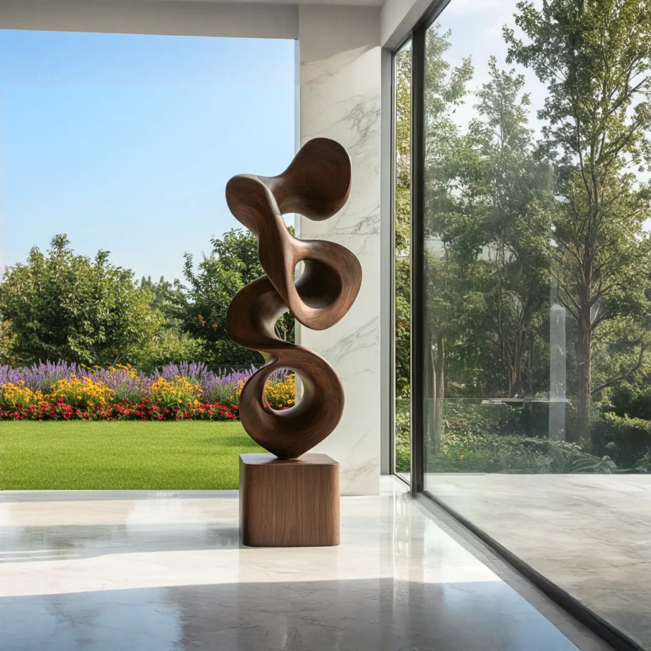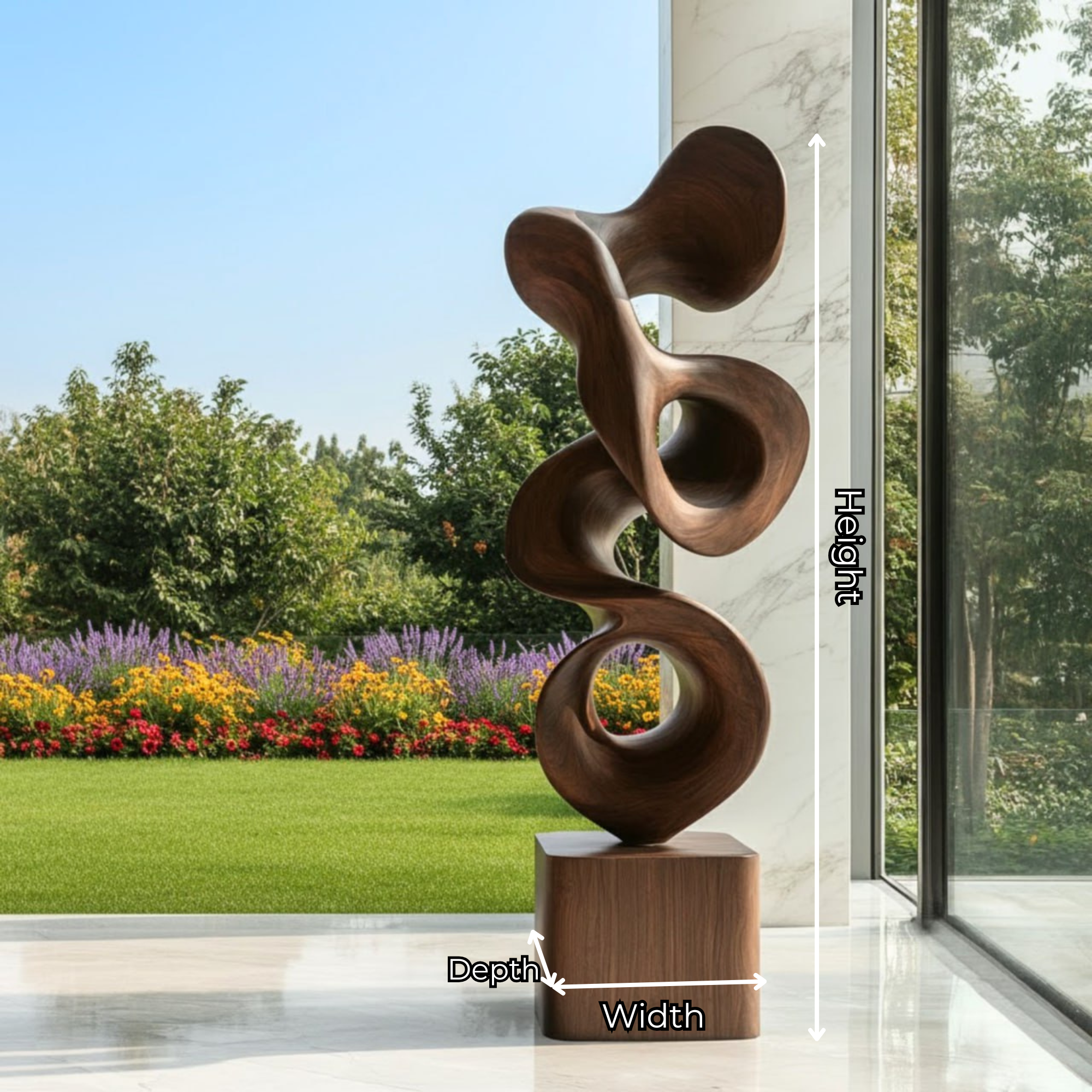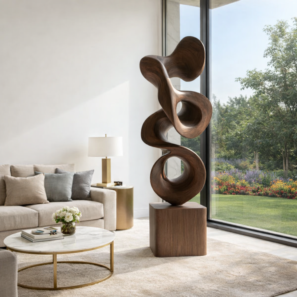 Designed for display in living rooms, entry spaces, galleries, patios, or landscaped gardens, this piece complements modern, organic, and contemporary design styles. It serves as both a decorative element and a sculptural focal point in curated spaces. For outdoor placement, use in covered or partially sheltered areas and maintain the finish periodically according to care guidelines.