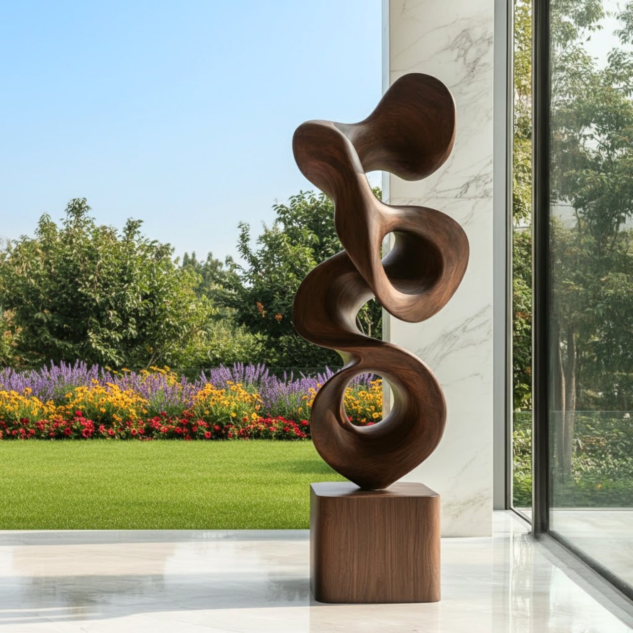 This modern abstract solid wood sculpture is crafted to suggest fluidity and movement, defined by soft curves and sculpted openings that invite light to pass through. Its organic rhythm and balanced form make it an elegant statement piece suitable for a range of interior spaces and protected outdoor settings.