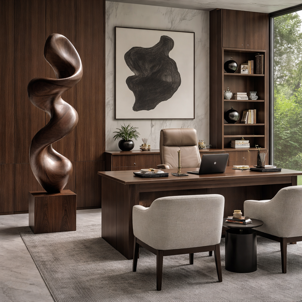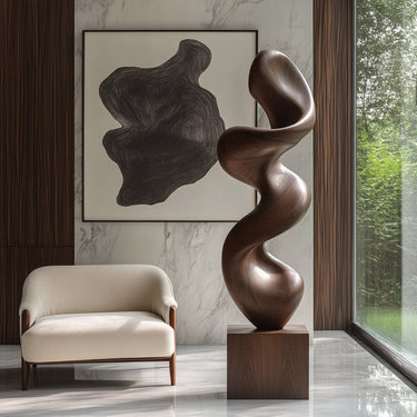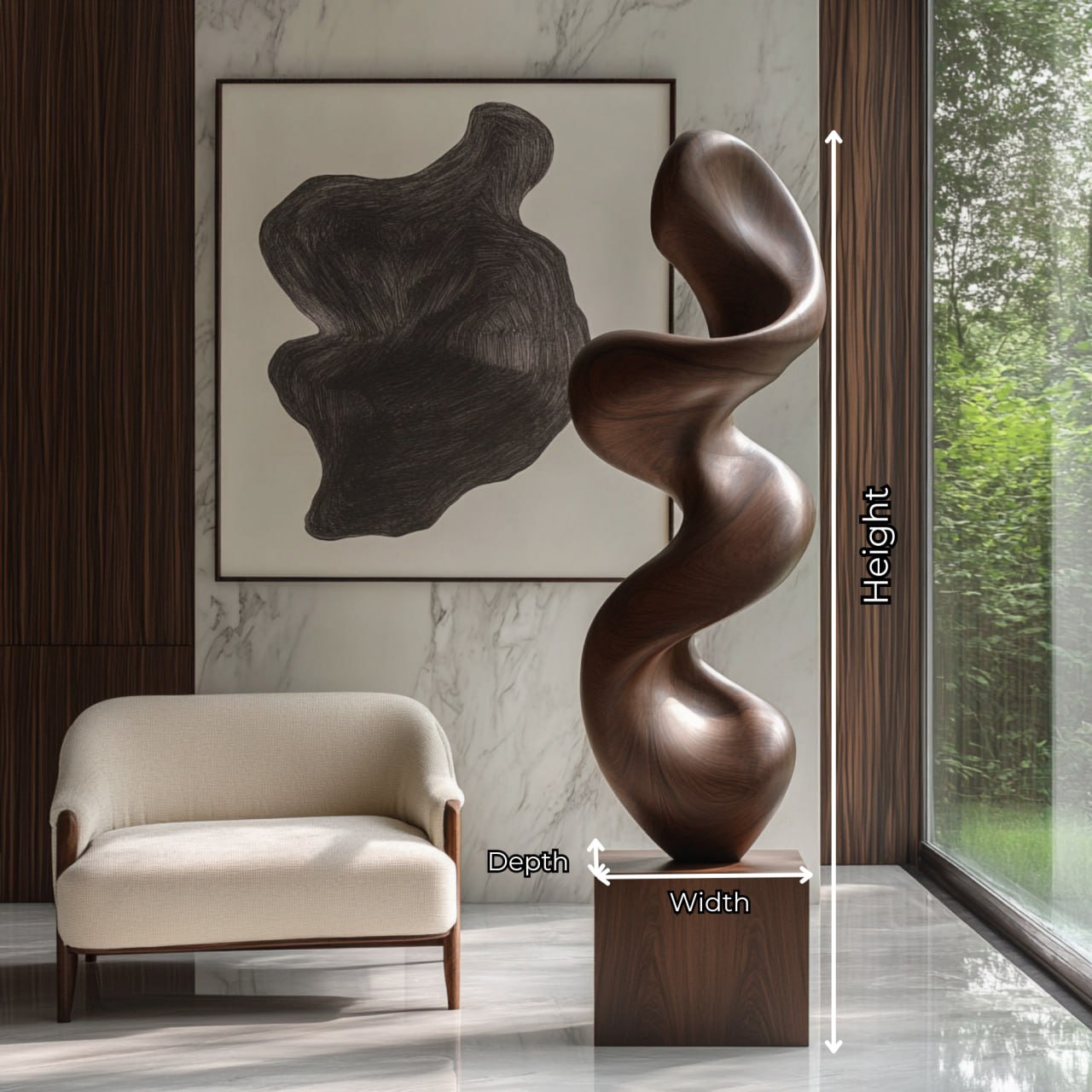 Ideal for living rooms, offices, or art-led spaces, this sculpture balances natural material with contemporary form. It serves as a refined statement accent that brings visual rhythm and sculptural presence without overpowering the room.