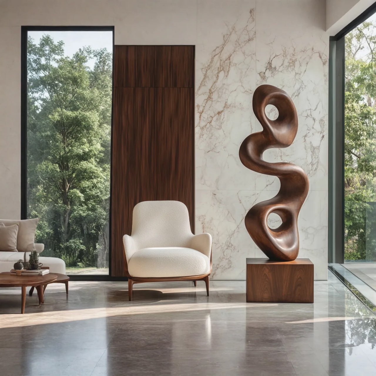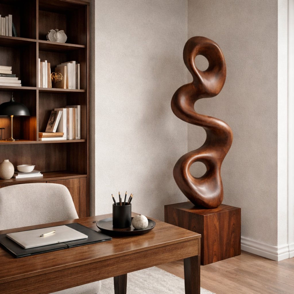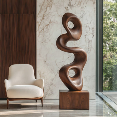 Well suited for living rooms, entryways, gallery-style environments, or professional spaces, this sculpture complements minimalist, contemporary, modern organic, and art-driven interiors. Its form serves as both a visual anchor and a quiet artistic statement that supports a sense of spatial harmony. Because solid wood is a natural material and handcrafted process, natural variations in grain, tone, and surface details are expected; no two pieces are exactly alike.