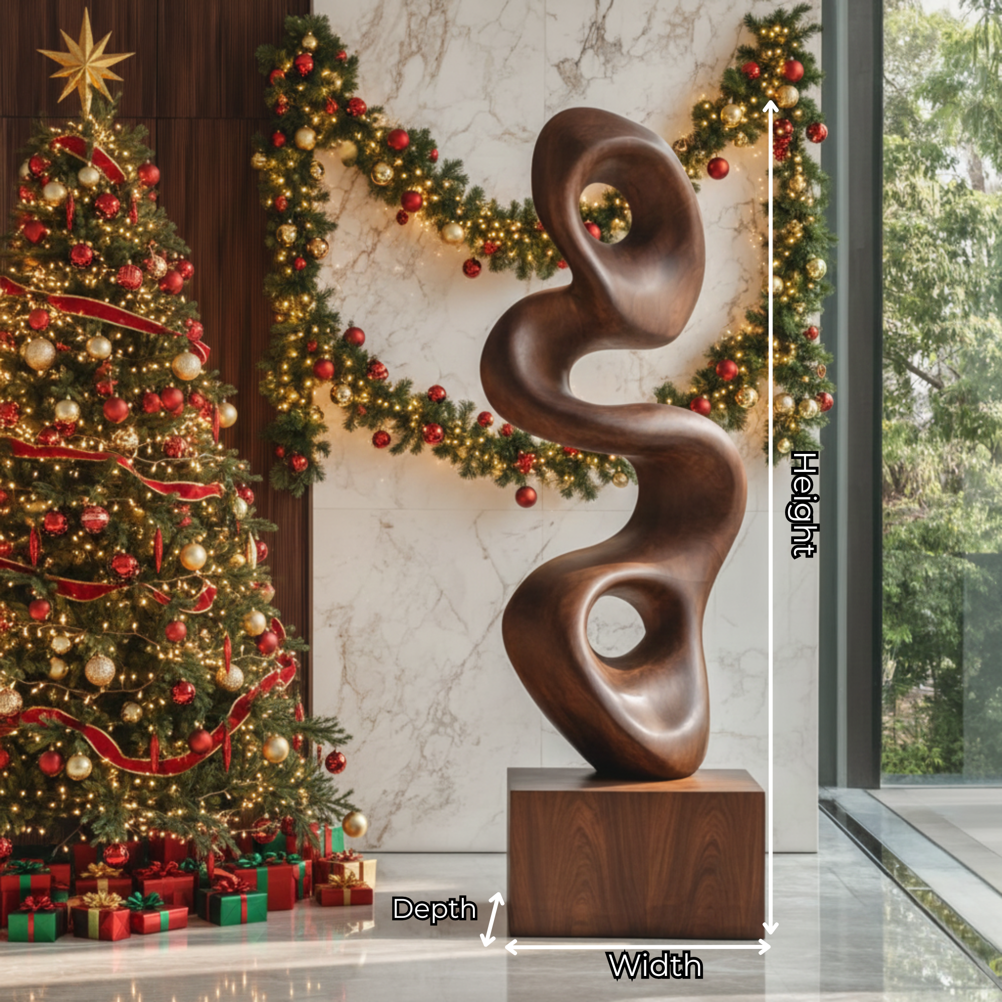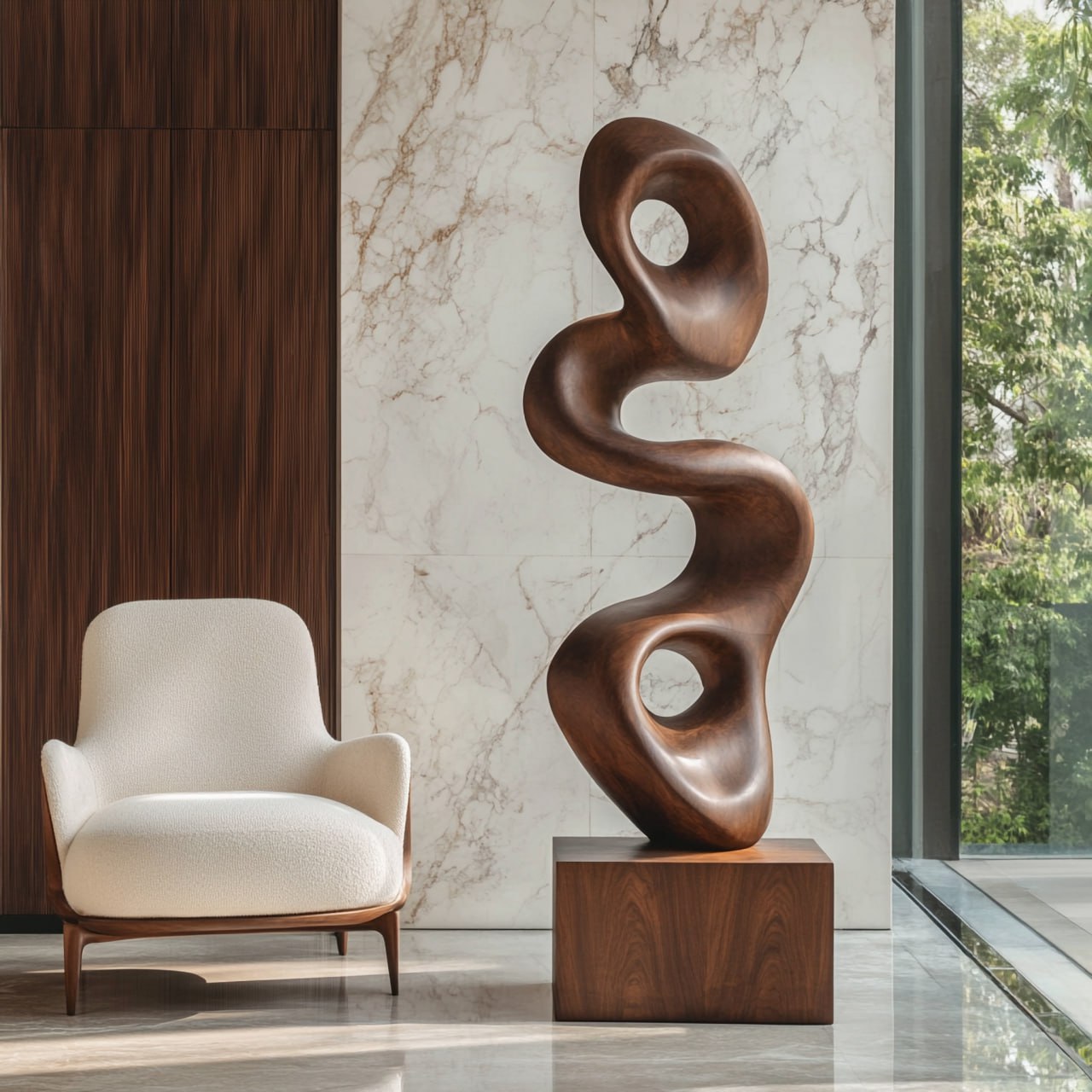 Crafted from natural solid wood, the sculpture is finished with a satin surface that highlights grain patterns and soft tonal transitions. Light moves gently across the curves and carved openings, creating shadow play that adds dimension and depth throughout the day.