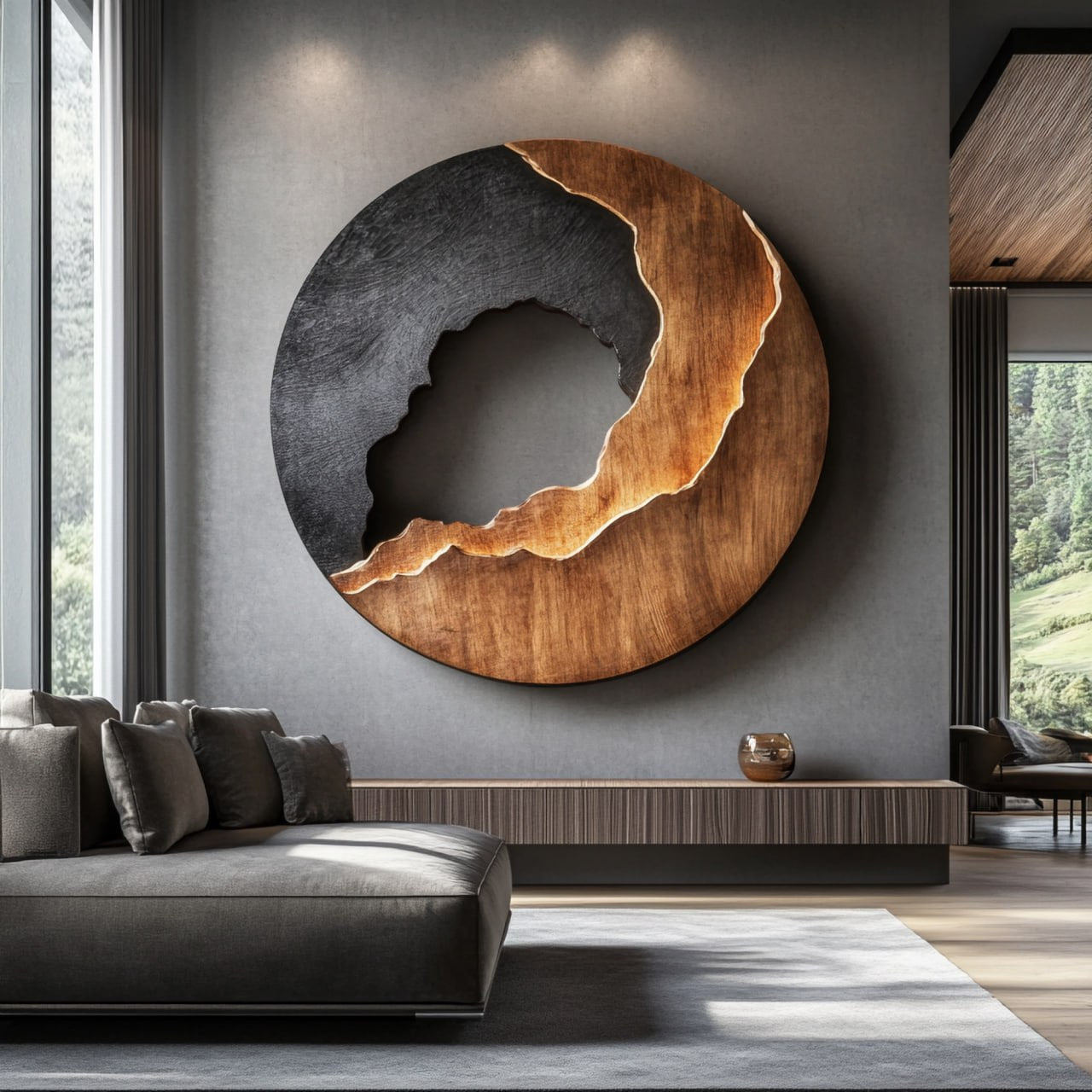Made from solid wood, each piece is shaped and finished individually to highlight natural grain variation and tactile surface detail. The balanced round composition pairs well with modern, minimalist, and architectural spaces.