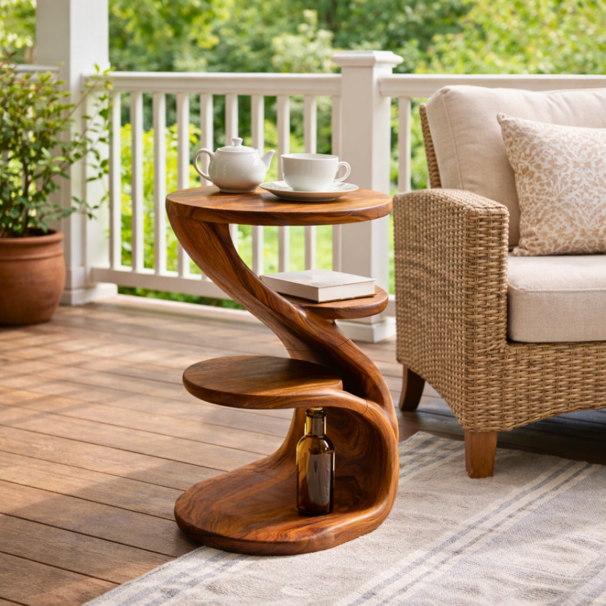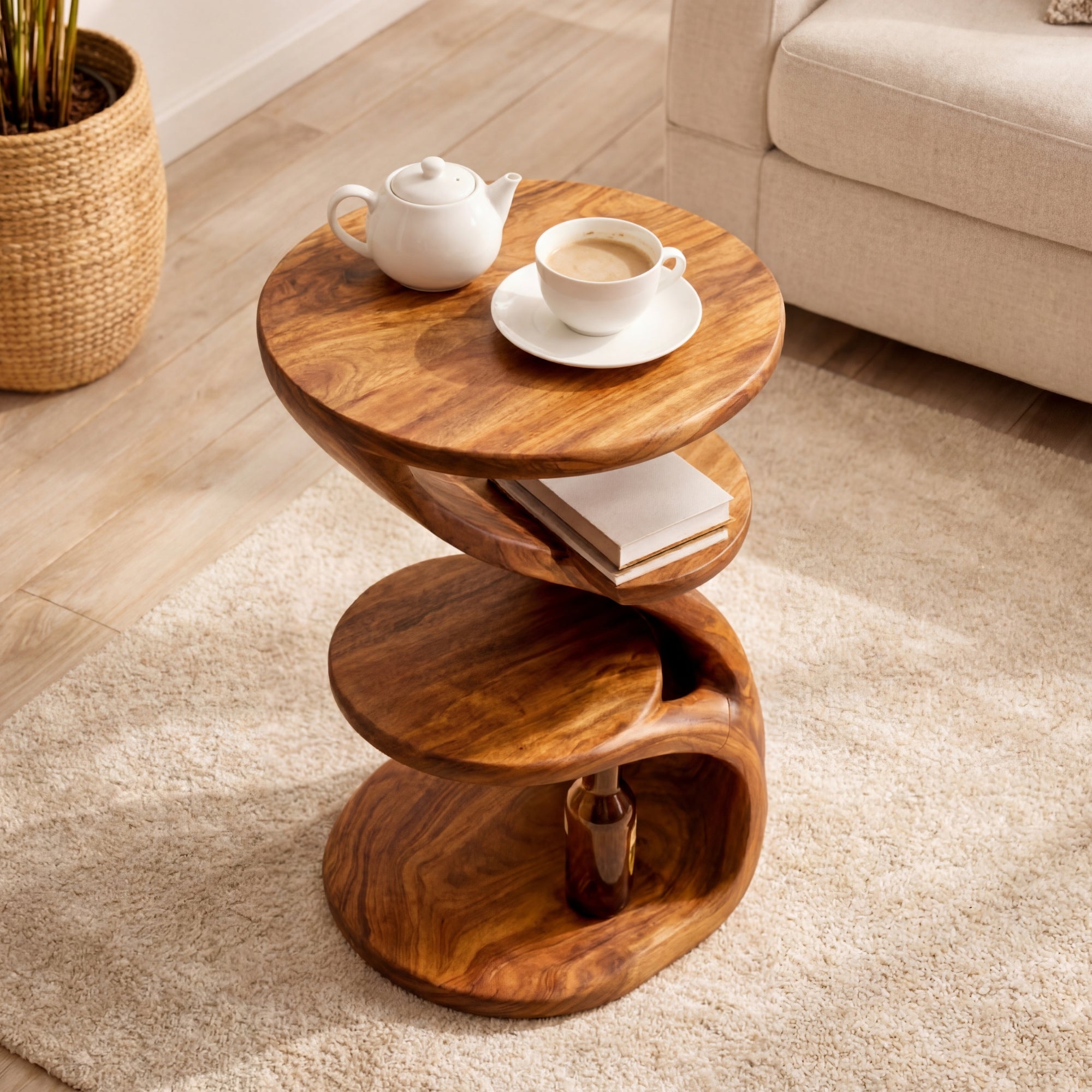 This sculptural side table is crafted from solid wood and designed to style beautifully in a living room lounge area. A flowing spiral silhouette connects a generous top surface with two staggered lower shelves and a grounded base, creating a functional piece that reads like a modern wooden sculpture.