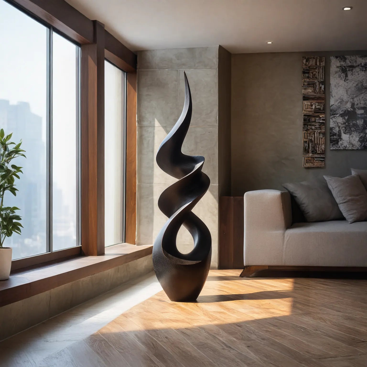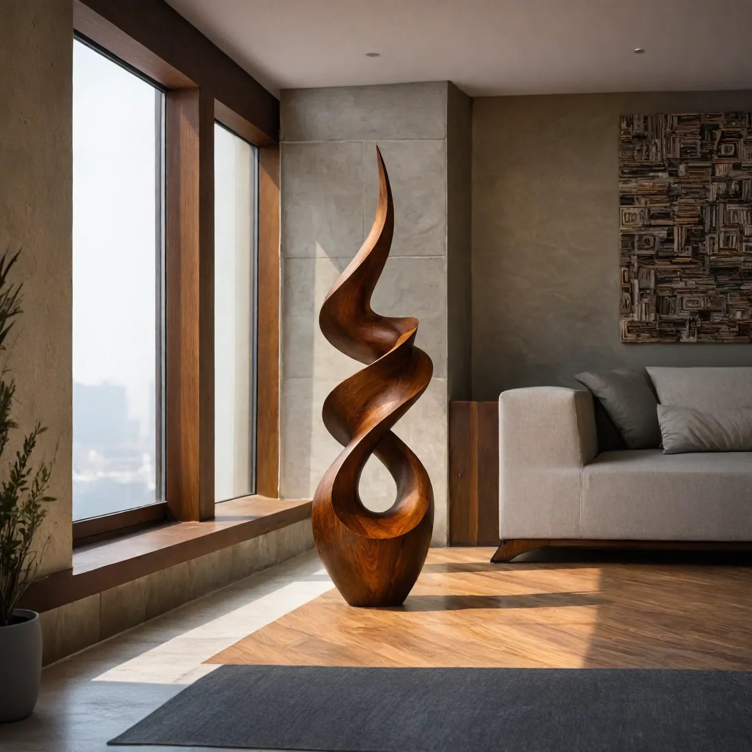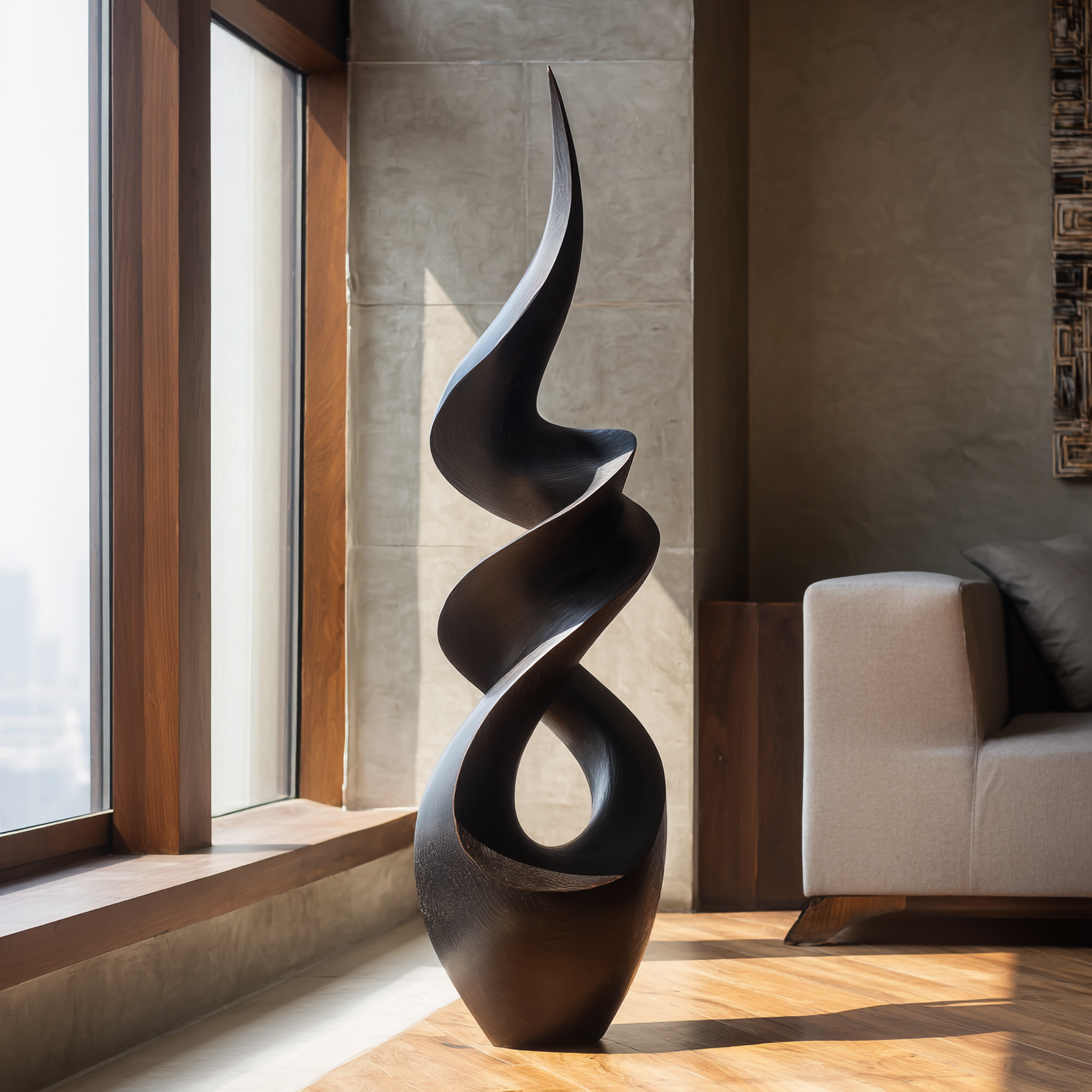 This modern abstract solid wood floor sculpture introduces a flowing spiral form that adds depth and refinement to contemporary interiors. The tall silhouette rises from a rounded base and twists upward in continuous curves, creating a calm yet striking focal point beside windows, seating areas, or in gallery style hallways.