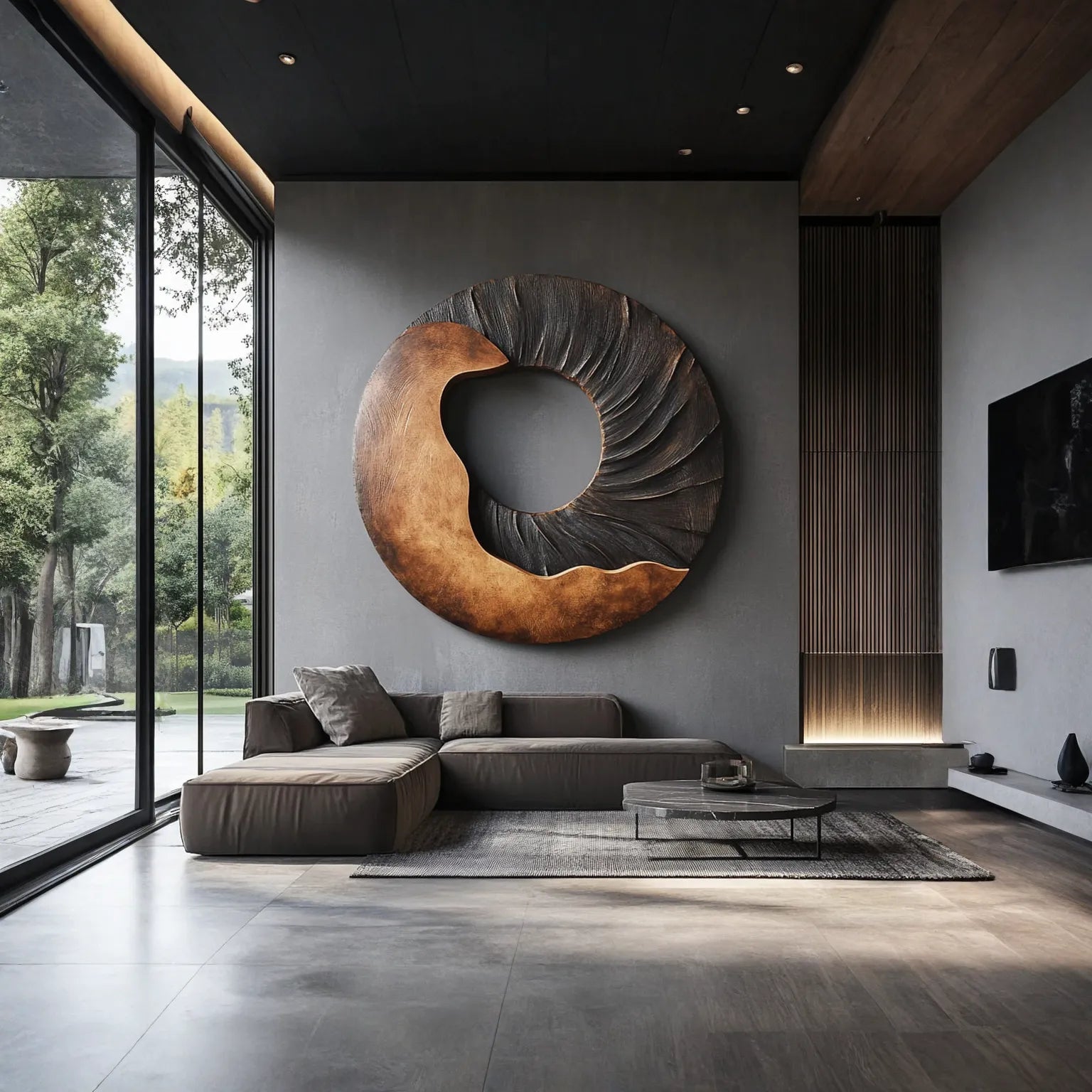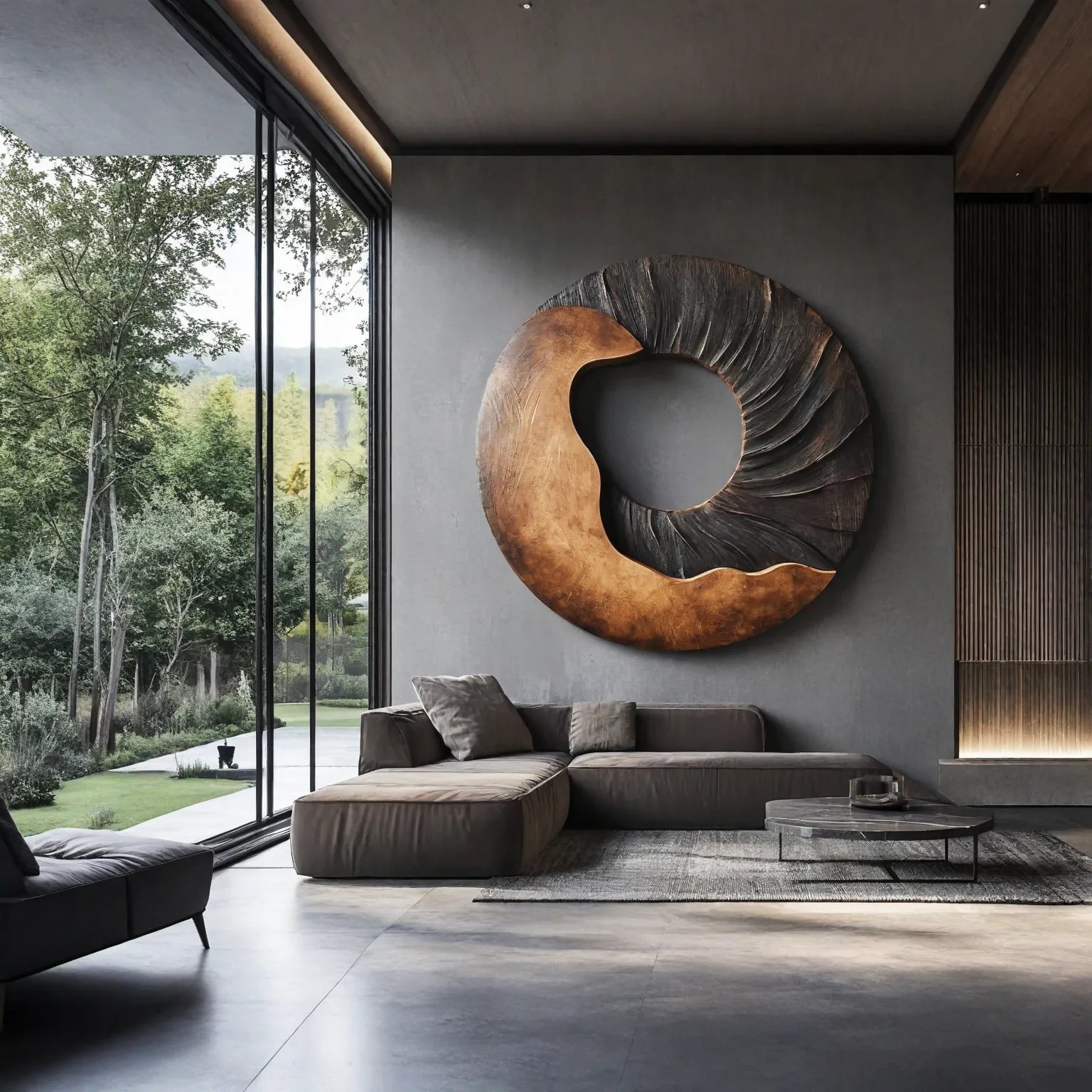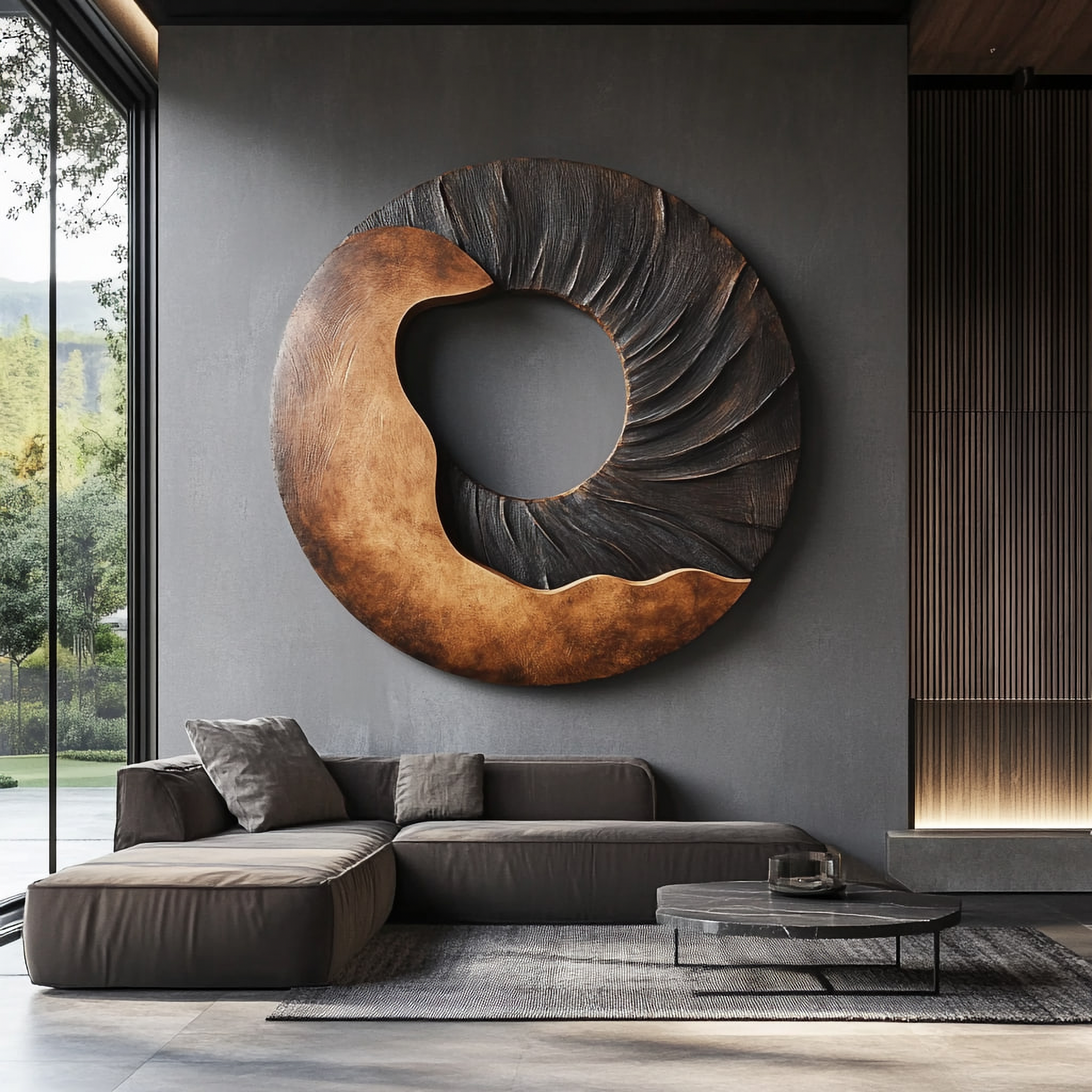 This modern solid wood round wall sculpture introduces a strong yet calm focal point for contemporary interiors. The open circle form is carved as a sweeping band that shifts from a smooth warm section into a darker textured area, creating an organic contrast that gently draws the eye toward the center. The cutaway shape keeps the piece visually light while still reading as a substantial sculptural element on the wall.