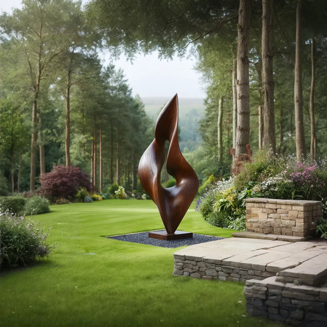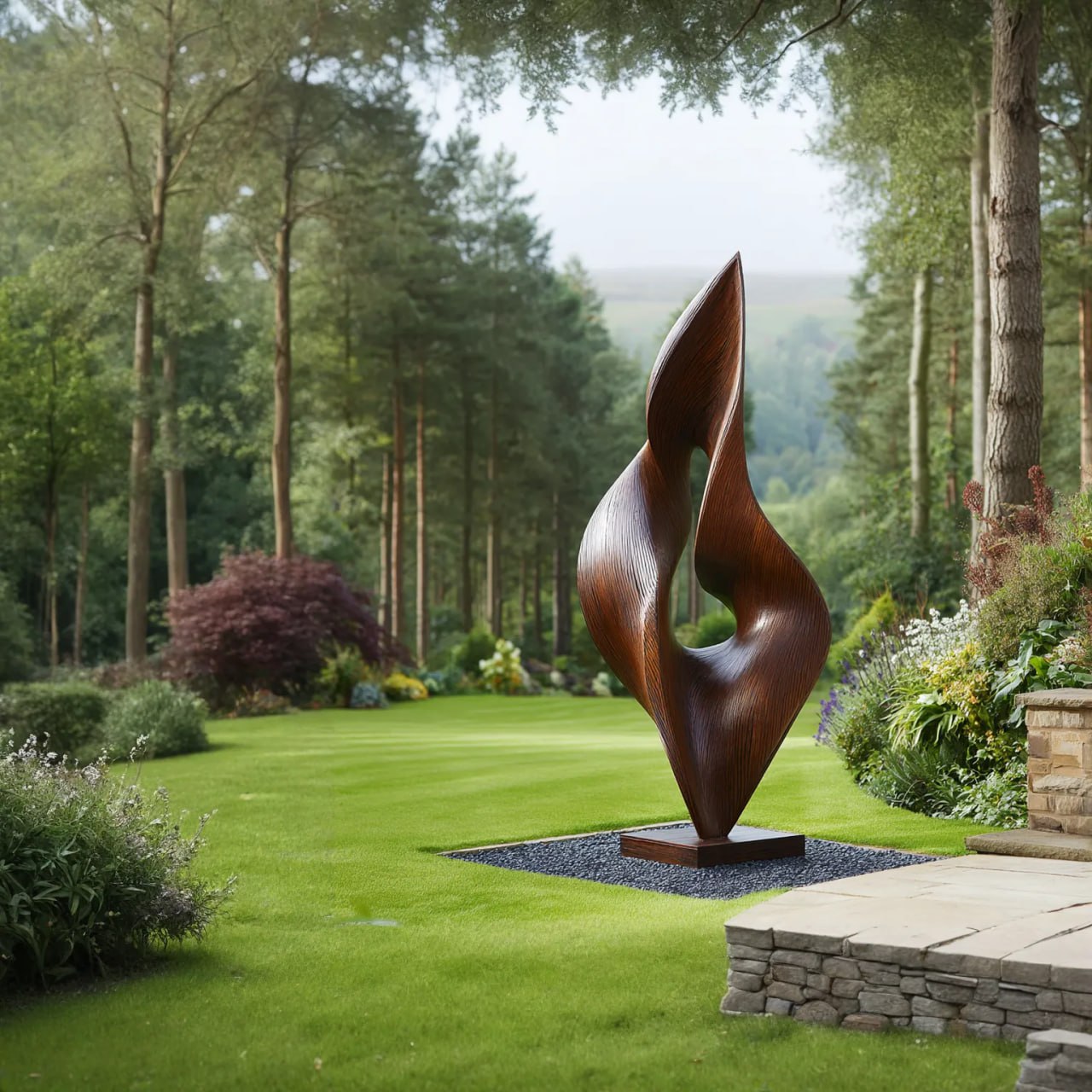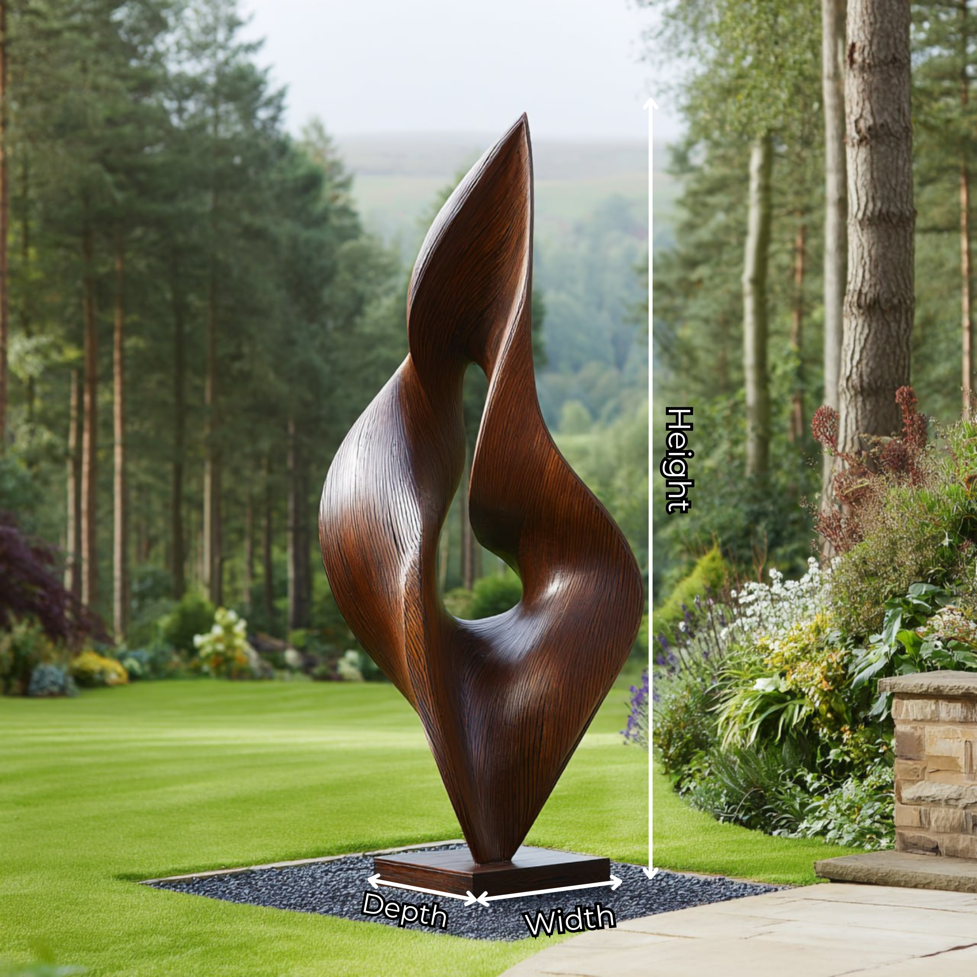 Placed in gardens, courtyards, terraces, pathways, or alongside natural plant groupings, the sculpture becomes a subtle yet striking focal point. Its vertical presence adds elegance without overpowering the landscape, blending comfortably into both structured and more natural settings. Because solid wood is a natural material and each piece is finished by hand, slight variations in grain, tone, and surface detail are expected, and no two sculptures are exactly alike.