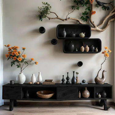 The layout is built for real living. A mix of open compartments and closed storage keeps the space feeling curated while staying practical. Use the open bays to display ceramics, books, and collected objects, or to place media devices with easy access and airflow. The closed sections help keep accessories, cables, and everyday clutter out of sight for a cleaner, calmer setup. The elongated top offers generous space to style vases, trays, or your favourite decor pieces without feeling crowded.