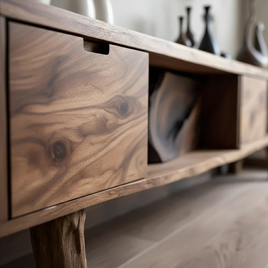 Designed to feel calm, grounded, and artful, this organic modern low media console turns everyday storage into a sculptural focal point. Its long, low profile creates a clean horizontal line that anchors the room, while expressive grain variation and flowing patterning add warmth and movement to minimalist spaces. A smooth, hand-finished surface highlights the natural character of wood, with subtle knots and gentle tonal shifts that give each piece its own look.