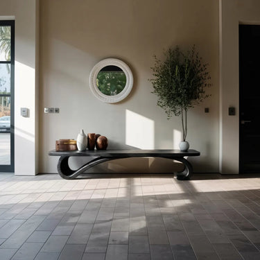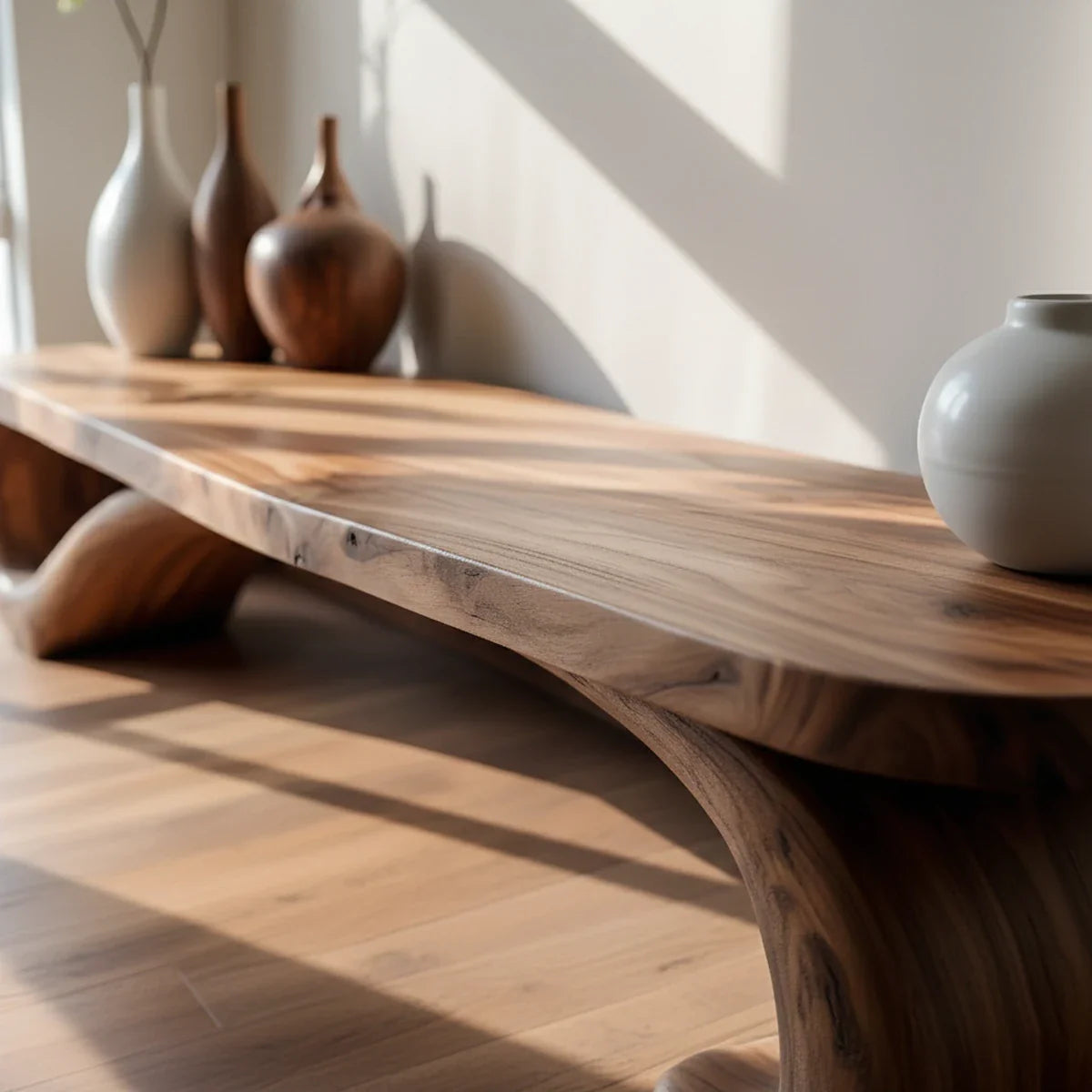 Designed to sit between furniture and sculpture, this organic solid wood console bench brings fluid movement and warm minimalism to modern interiors. The long, refined top creates a clean horizontal line for styling, while the sweeping S-curve base forms a dramatic negative space that feels light, architectural, and quietly bold. With its soft edges and flowing silhouette, it complements organic modern, Japandi, minimalist, and contemporary spaces with effortless calm.