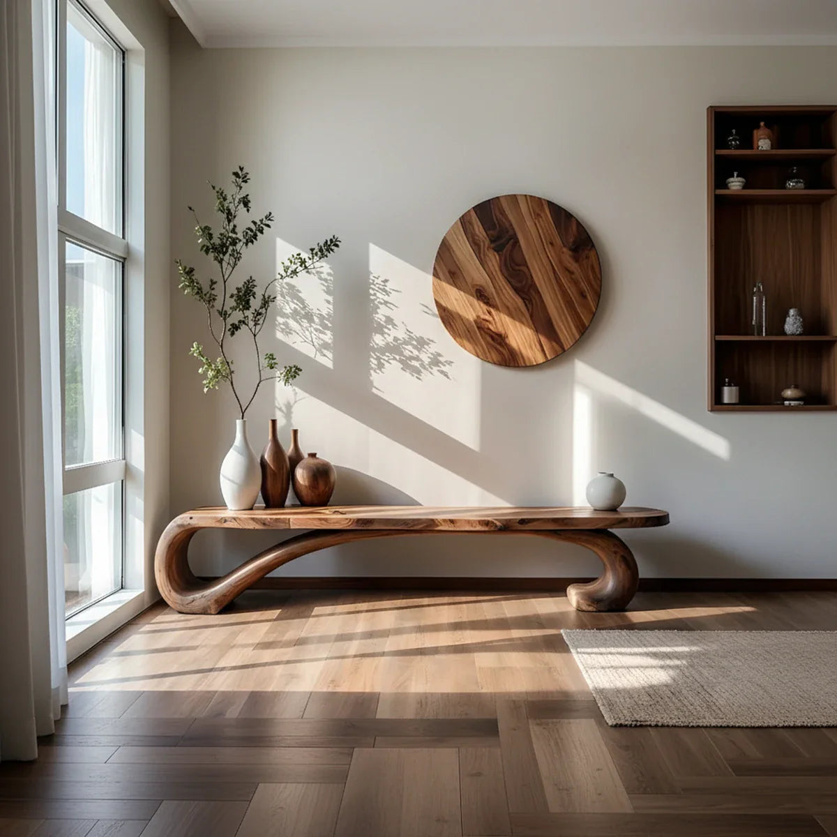 In real spaces, this console bench works beautifully in an entryway beneath wall art, along a hallway wall, or as a low profile display bench in a living room or studio. The generous length provides room for vases, ceramics, and curated objects without clutter, while the sculptural base keeps the floor visually open for a serene, gallery-like feel. A timeless statement in natural wood decor, this piece adds warmth, motion, and elevated simplicity to any modern home interior.
