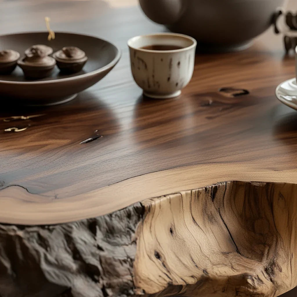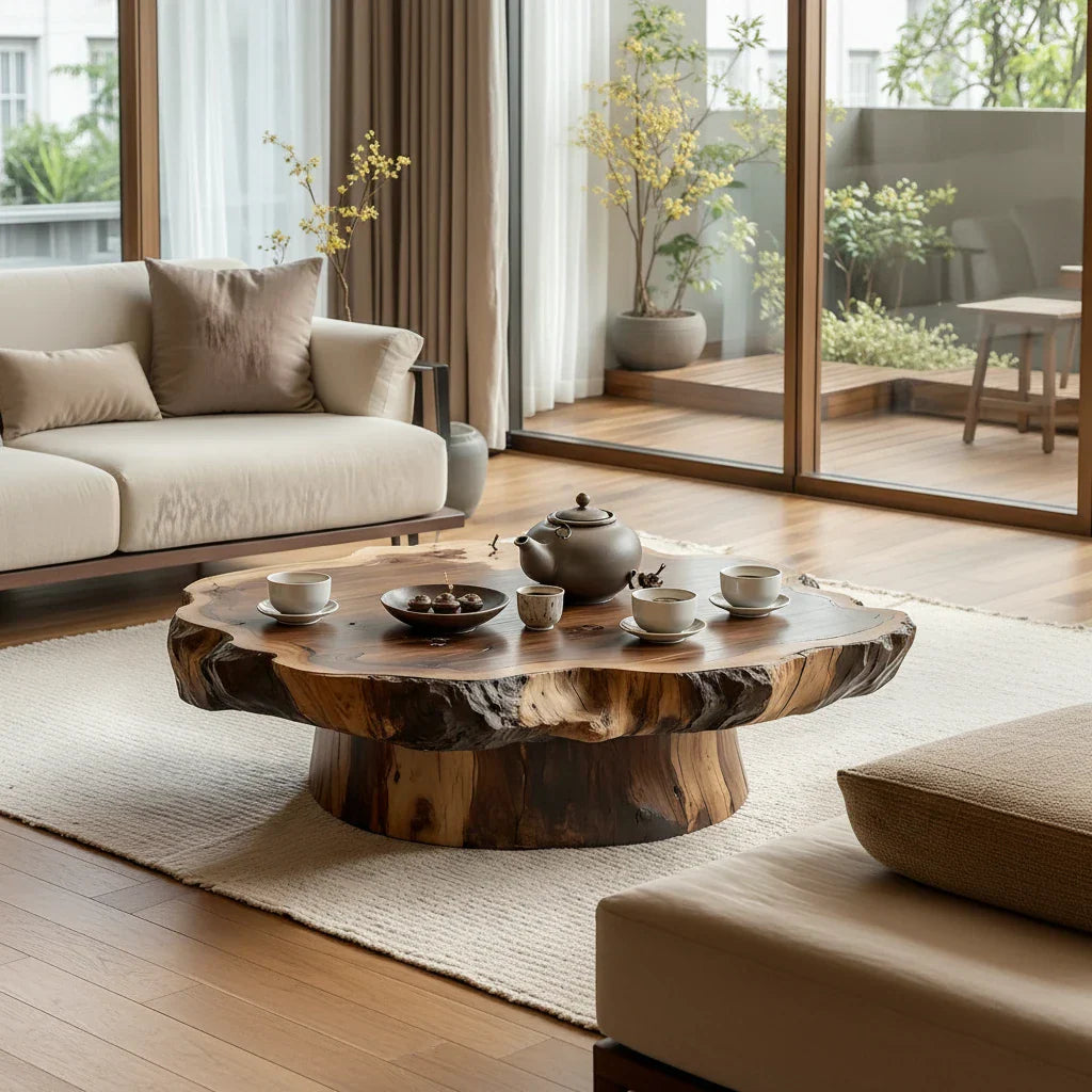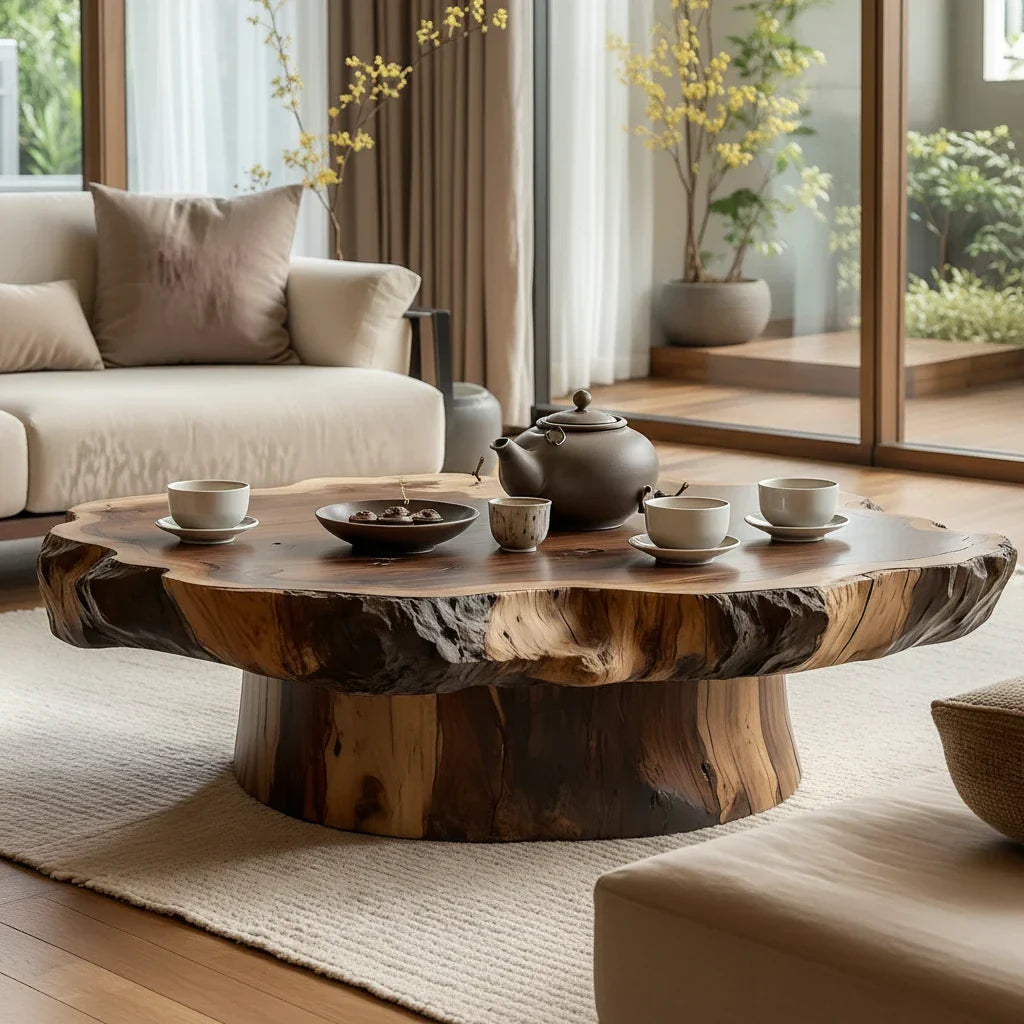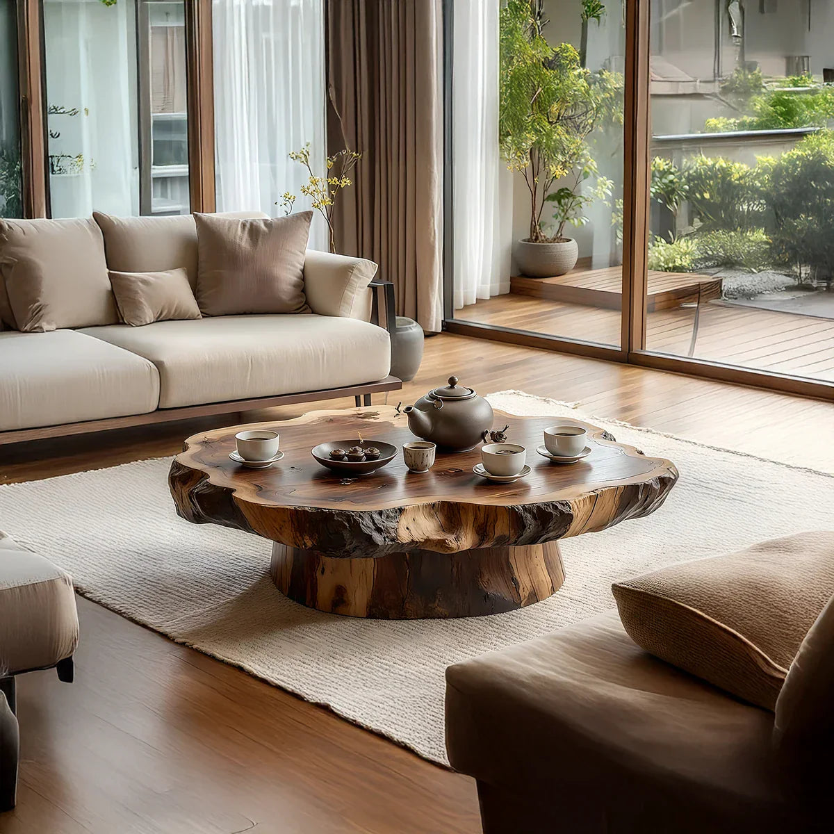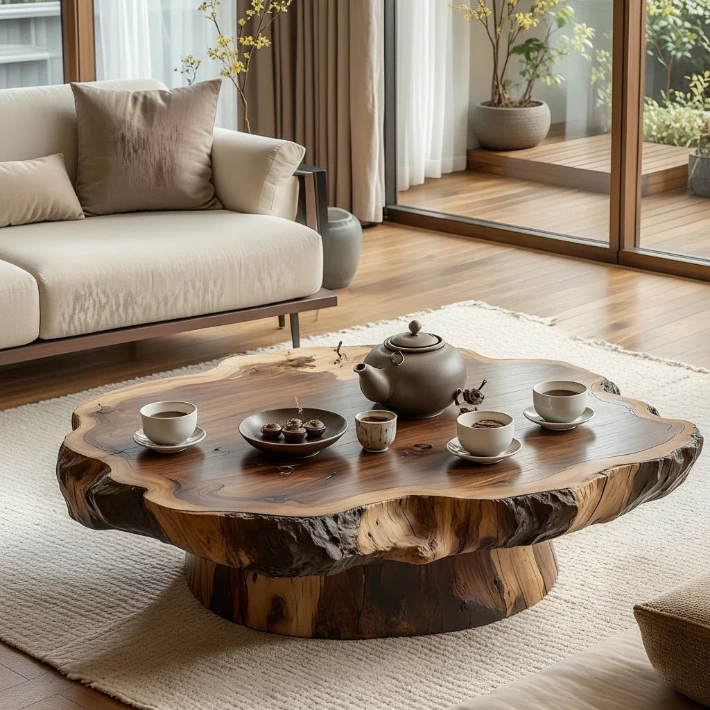 Perfect for contemporary, Japandi, and nature-inspired interiors, this coffee table sits beautifully on a neutral rug between sofas and lounge chairs. Styled with simple ceramic teaware, candles, or a small arrangement of greenery, it functions as both practical furniture and natural-wood décor. Combining solid-wood construction, live-edge artistry, and a low, generous profile, it brings warmth, texture, and a sophisticated focal point to any modern living room.