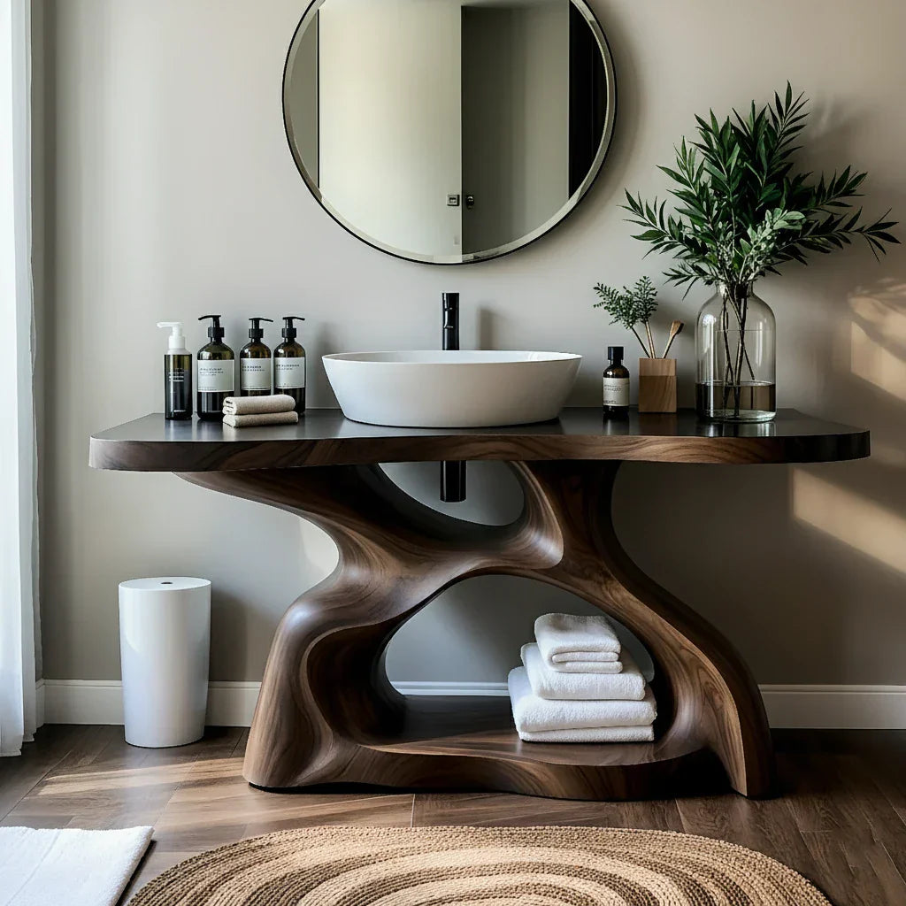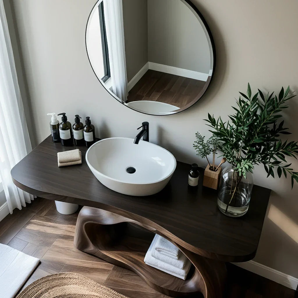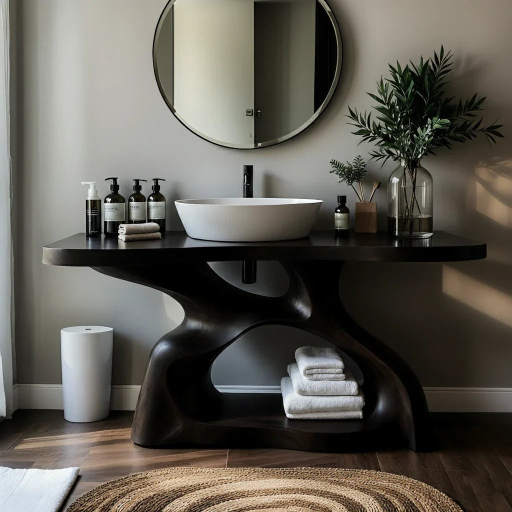 This sculptural solid wood bathroom vanity is designed as a functional centerpiece for calm, modern interiors. The thick top is finished in a rich, dark tone that highlights the flowing grain and frames a crisp white vessel sink, creating a clean contrast against the soft wall color and round mirror. Its wide surface offers generous space for daily essentials—from soaps and lotions to small trays and greenery—keeping everything organized yet visually light.