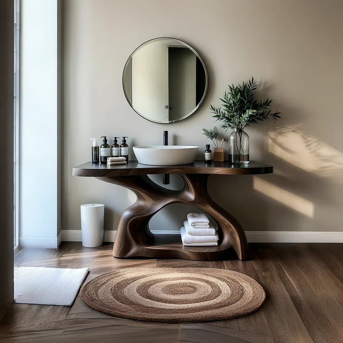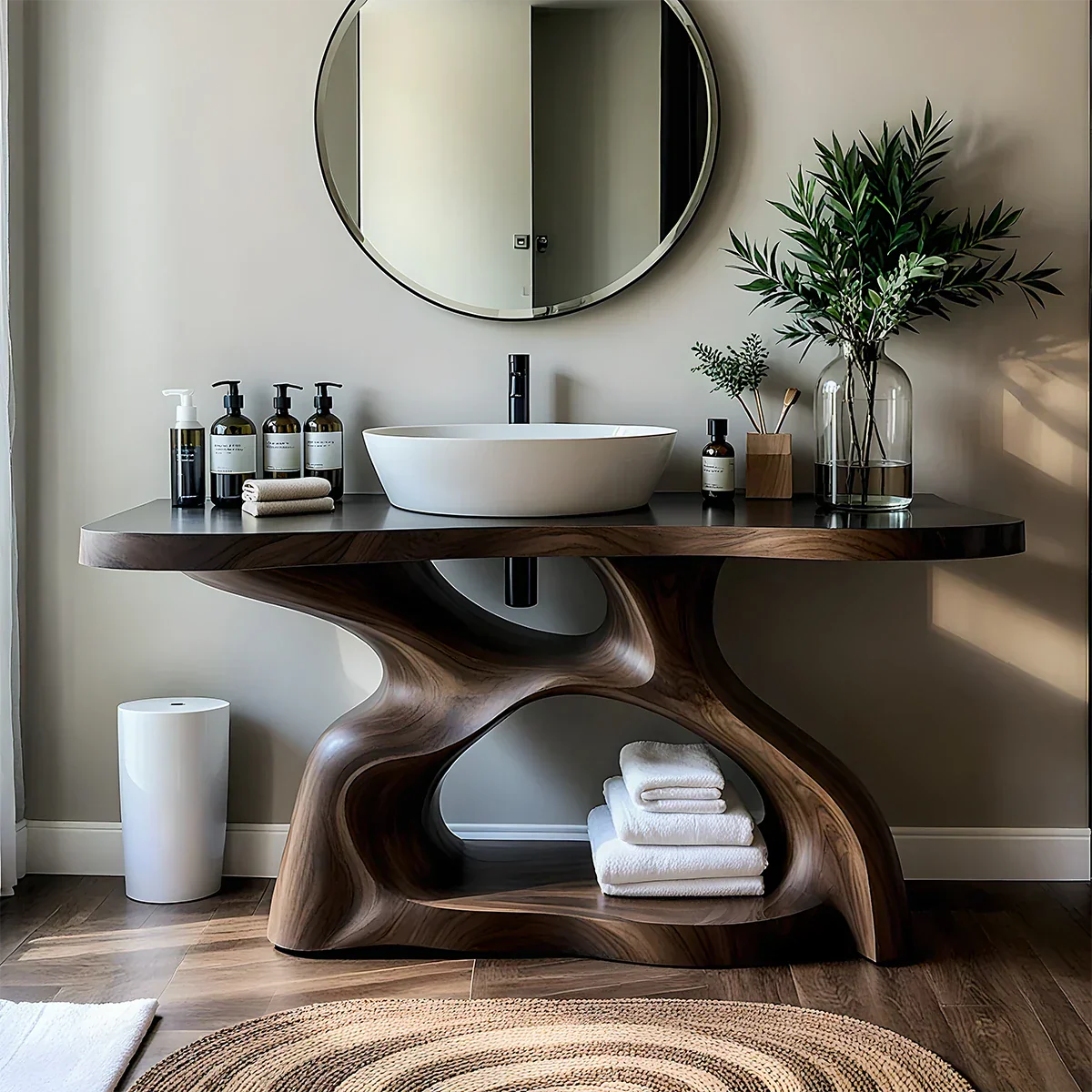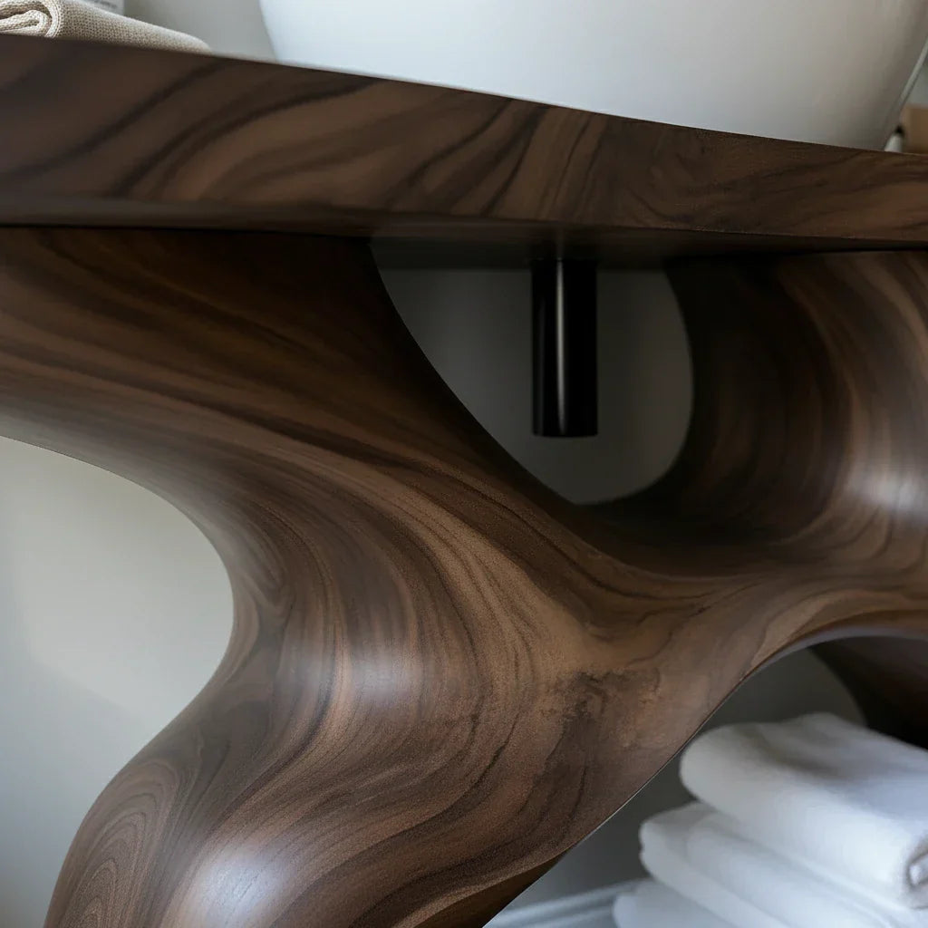This sculptural solid wood bathroom vanity is designed as a functional centerpiece for calm, modern interiors. The thick top is finished in a rich, dark tone that highlights the flowing grain and frames a crisp white vessel sink, creating a clean contrast against the soft wall color and round mirror. Its wide surface offers generous space for daily essentials—from soaps and lotions to small trays and greenery—keeping everything organized yet visually light.