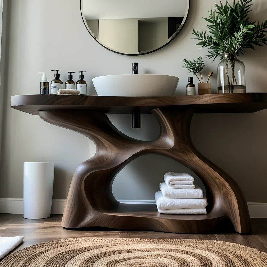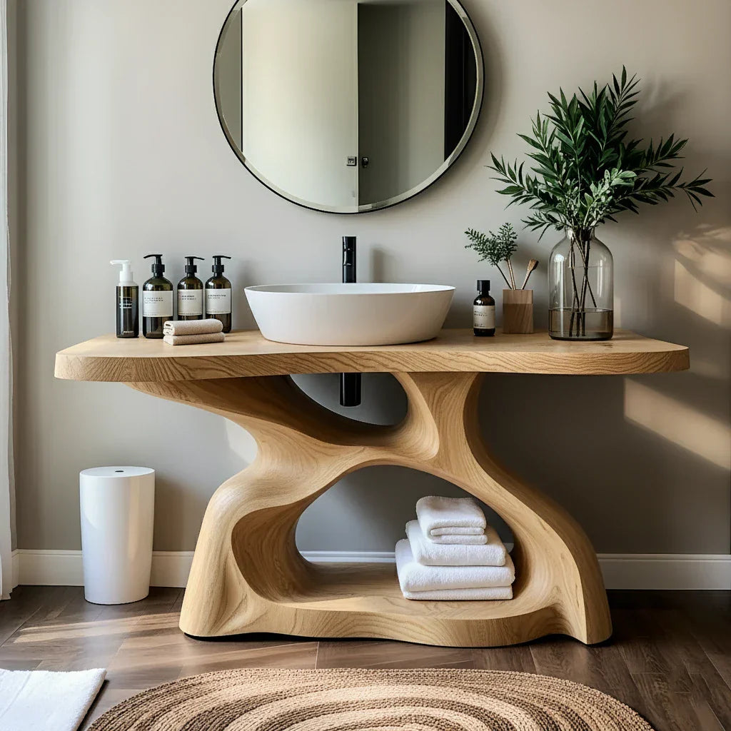 The base is carved as a continuous organic form, with smooth curves and open negative spaces that give the vanity a gallery-like presence. Integrated shelving within the sculpted frame provides practical storage for neatly folded towels and baskets while maintaining an airy, elevated look. The design pairs beautifully with Japandi, minimalist, spa-inspired, and contemporary homes seeking a warm, natural focal point in the bathroom.