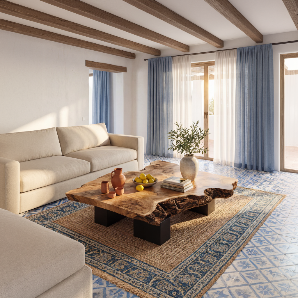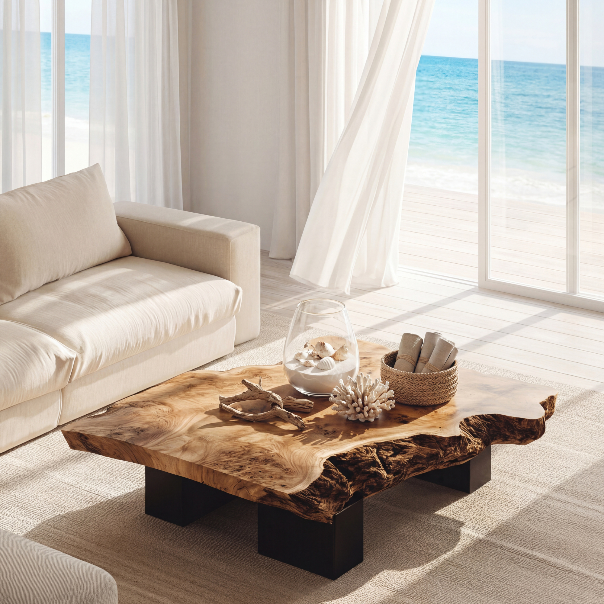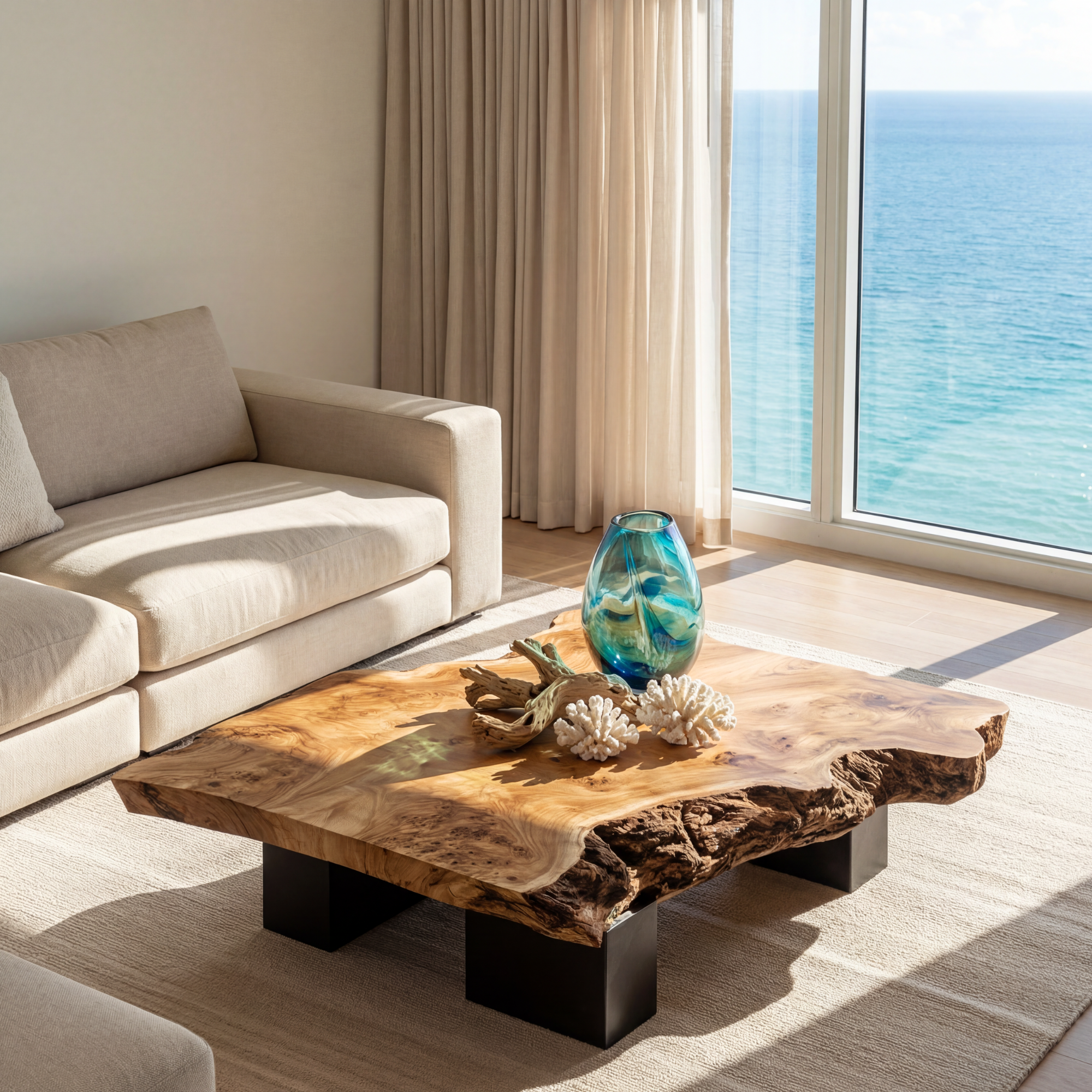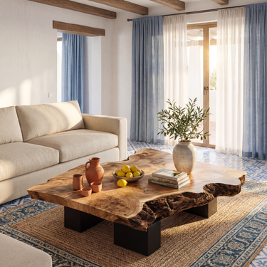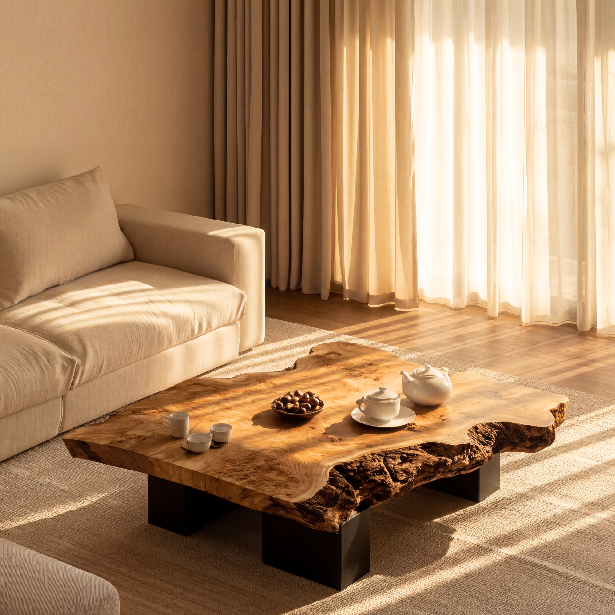This live edge coffee table turns a simple surface into a warm focal point for the living room. The broad, low slab top keeps the natural contours of the wood, with softly undulating edges that feel organic but still practical for everyday use. Its generous proportions offer plenty of space for books, trays, flowers, or a tea set, while the low block legs give the table a grounded, architectural presence.