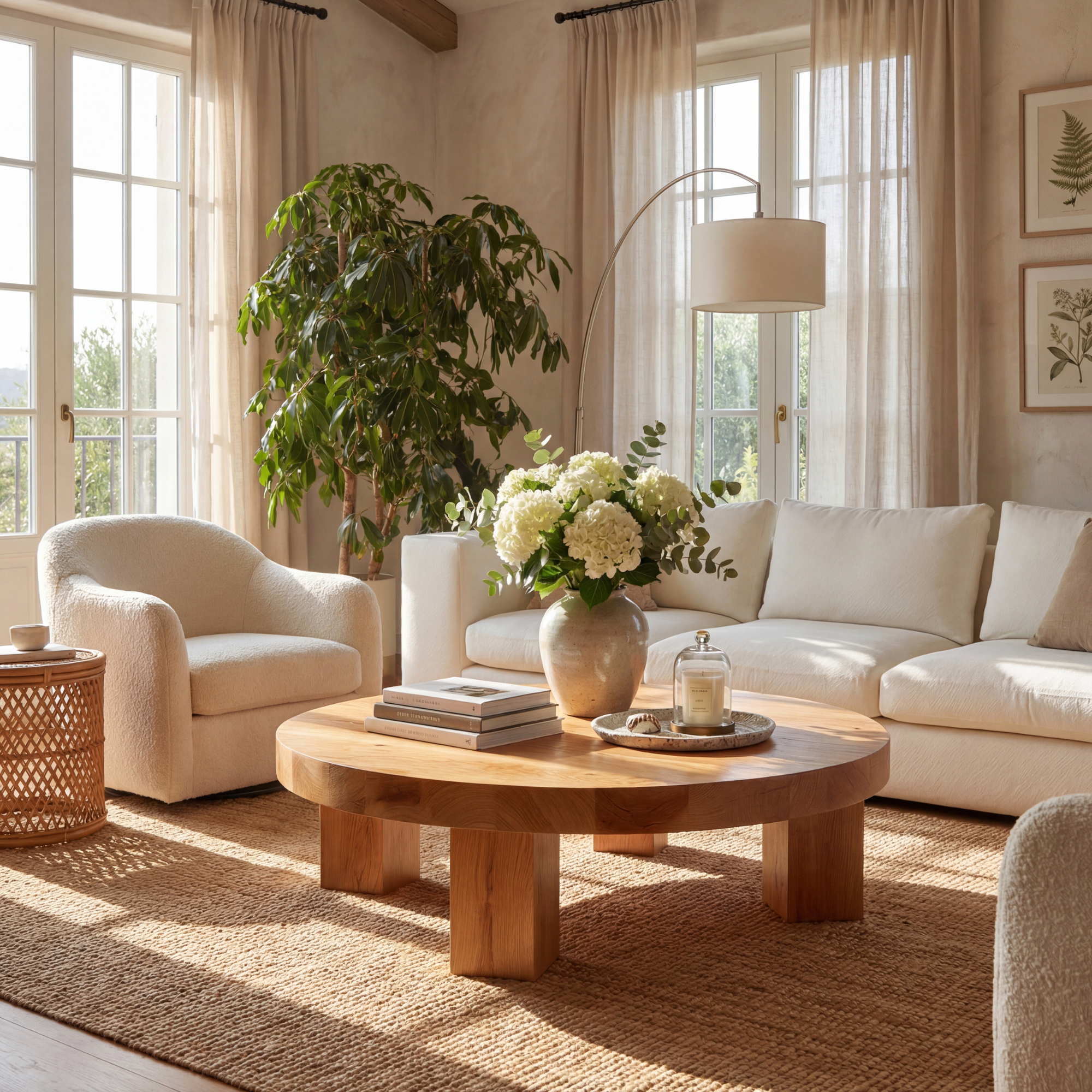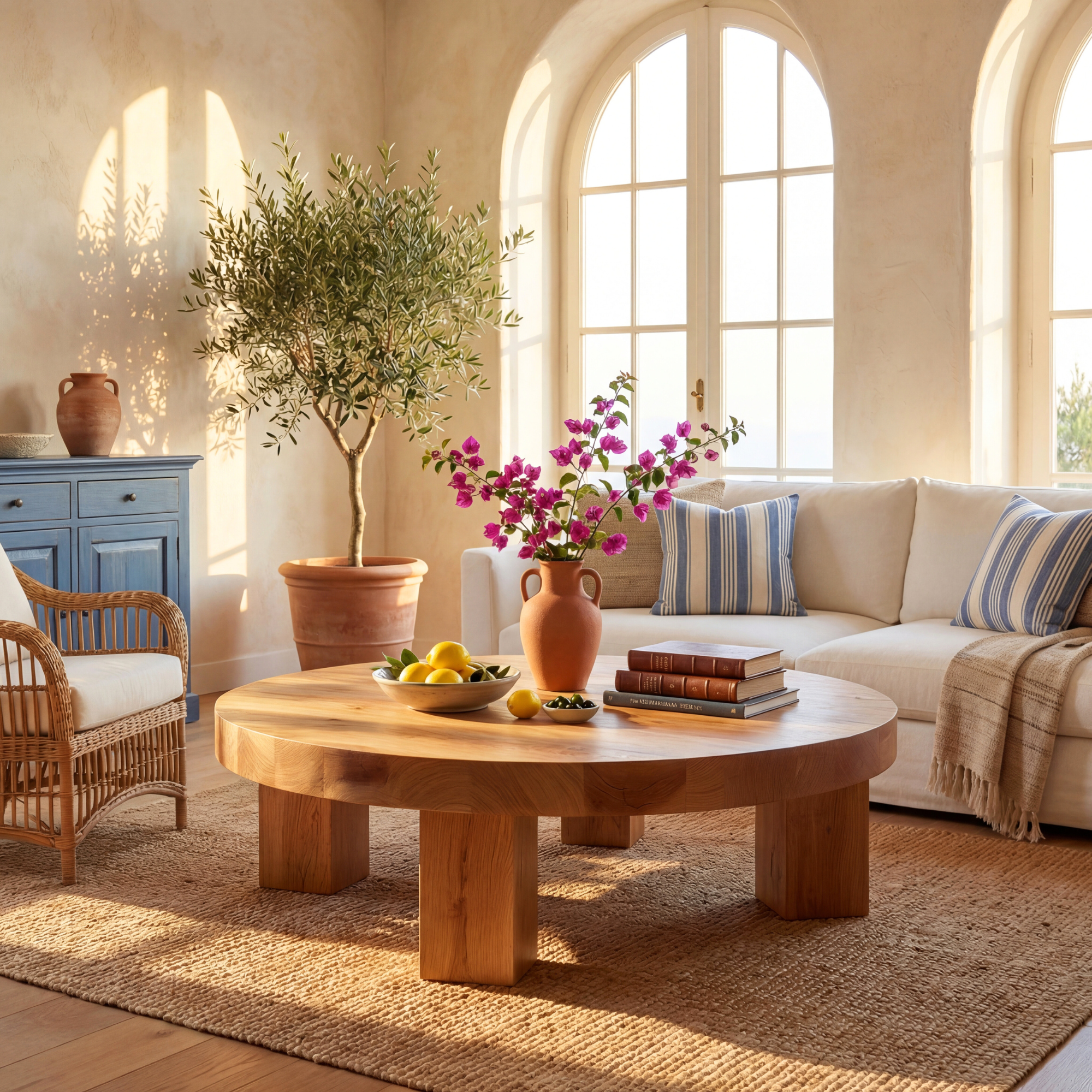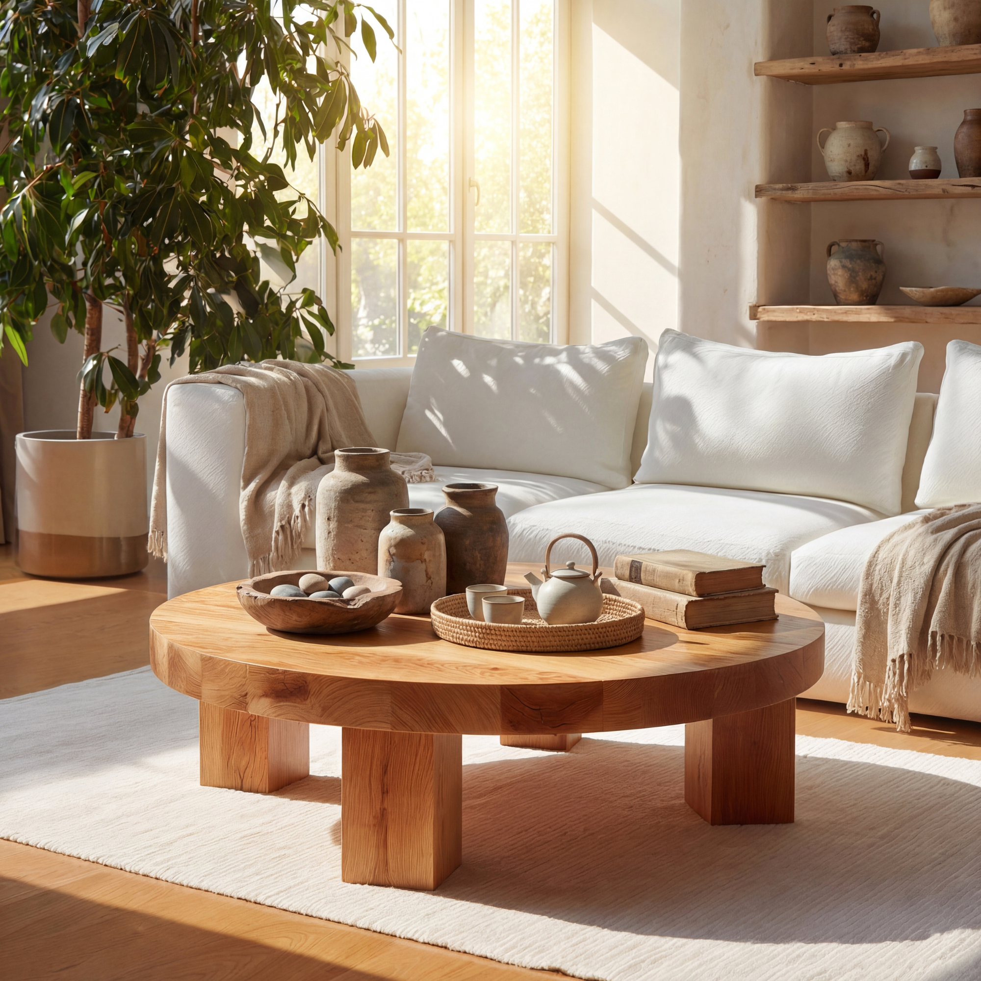 The simple round form brings softness to the space, while the thick base structure adds visual weight and stability. Its spacious surface is ideal for displaying books, candles, trays, floral arrangements, and everyday decor, offering both function and understated style.