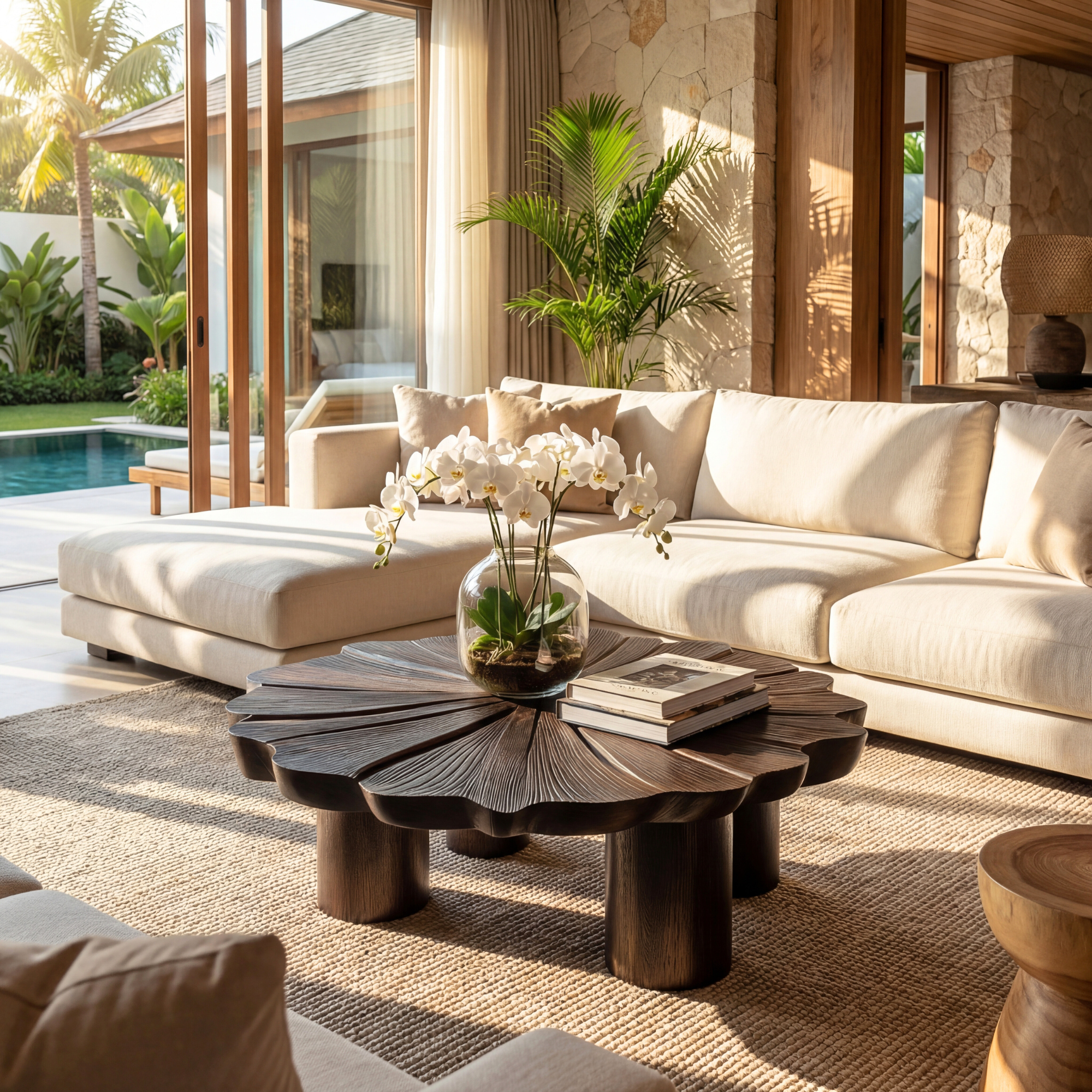 The carved top is rich in movement and detail, giving the piece a handcrafted look that draws attention from every angle. Its petal-like edges soften the overall form, while the bold base provides stability and balance. This combination of texture, sculptural shaping, and solid wood construction makes the table an eye-catching centerpiece for living rooms, lounge spaces, or carefully curated interiors.
