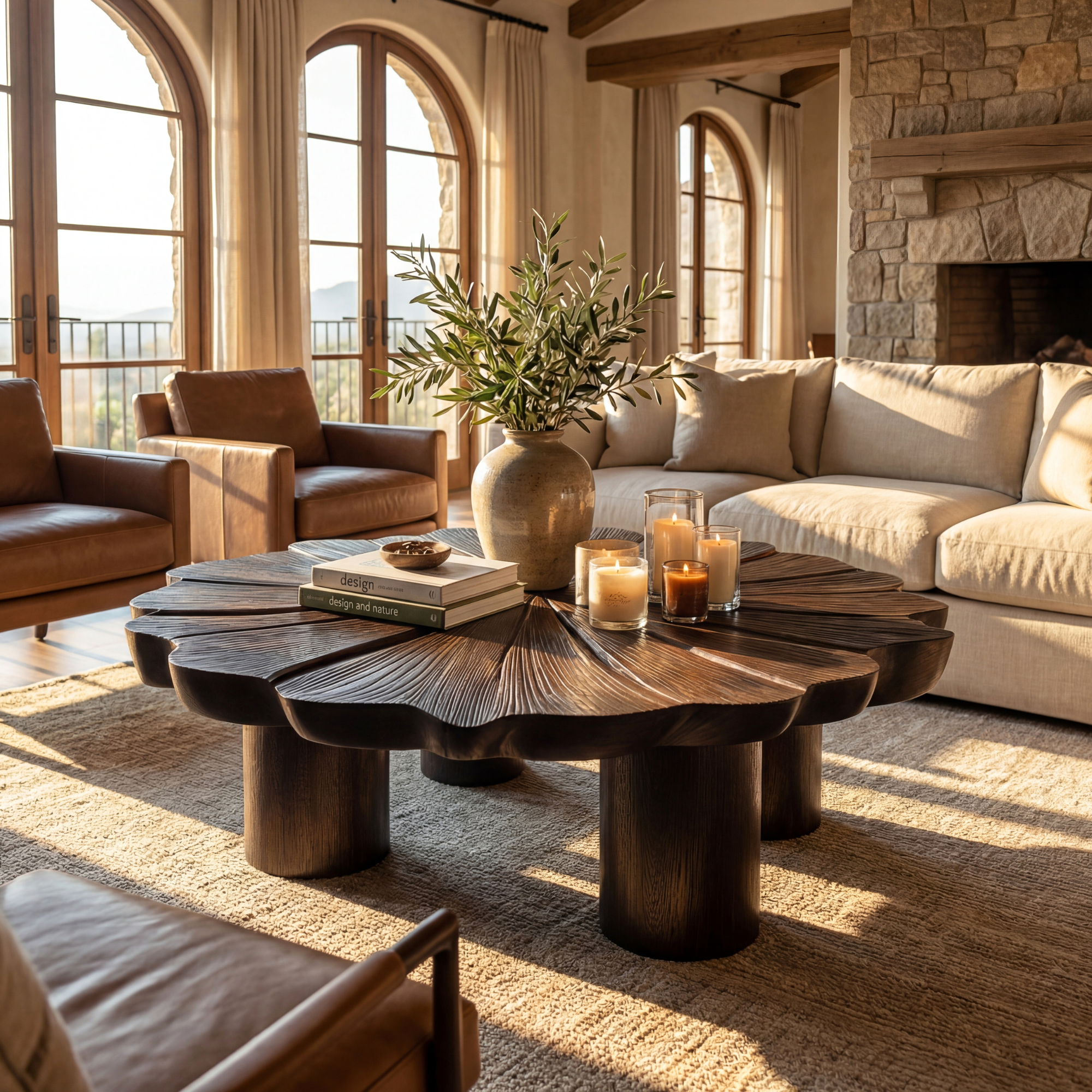 This sculptural coffee table is crafted from solid wood and designed to bring natural beauty, artistic detail, and a strong visual presence into the living space. Featuring a wide round silhouette inspired by organic floral forms, the table stands out with its deeply textured top surface and substantial cylindrical legs, creating a design that feels both grounded and expressive.