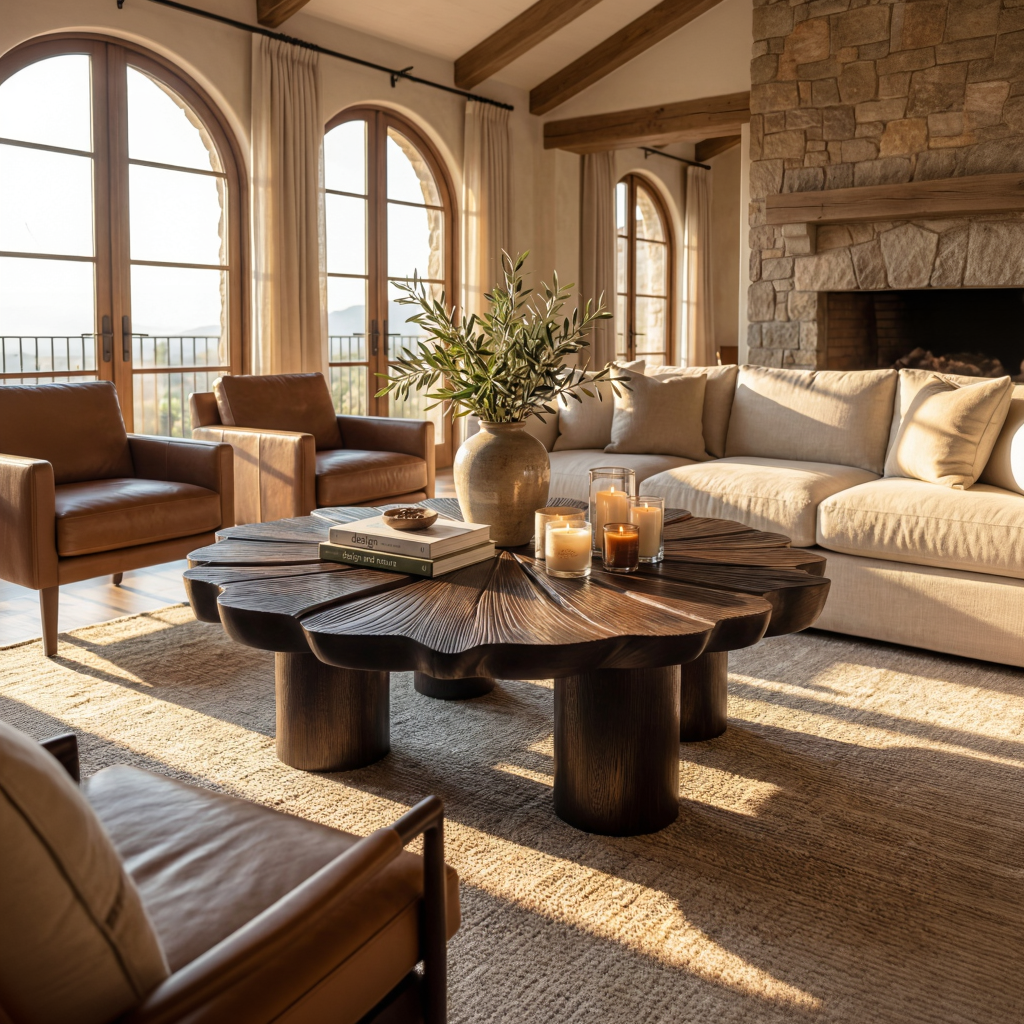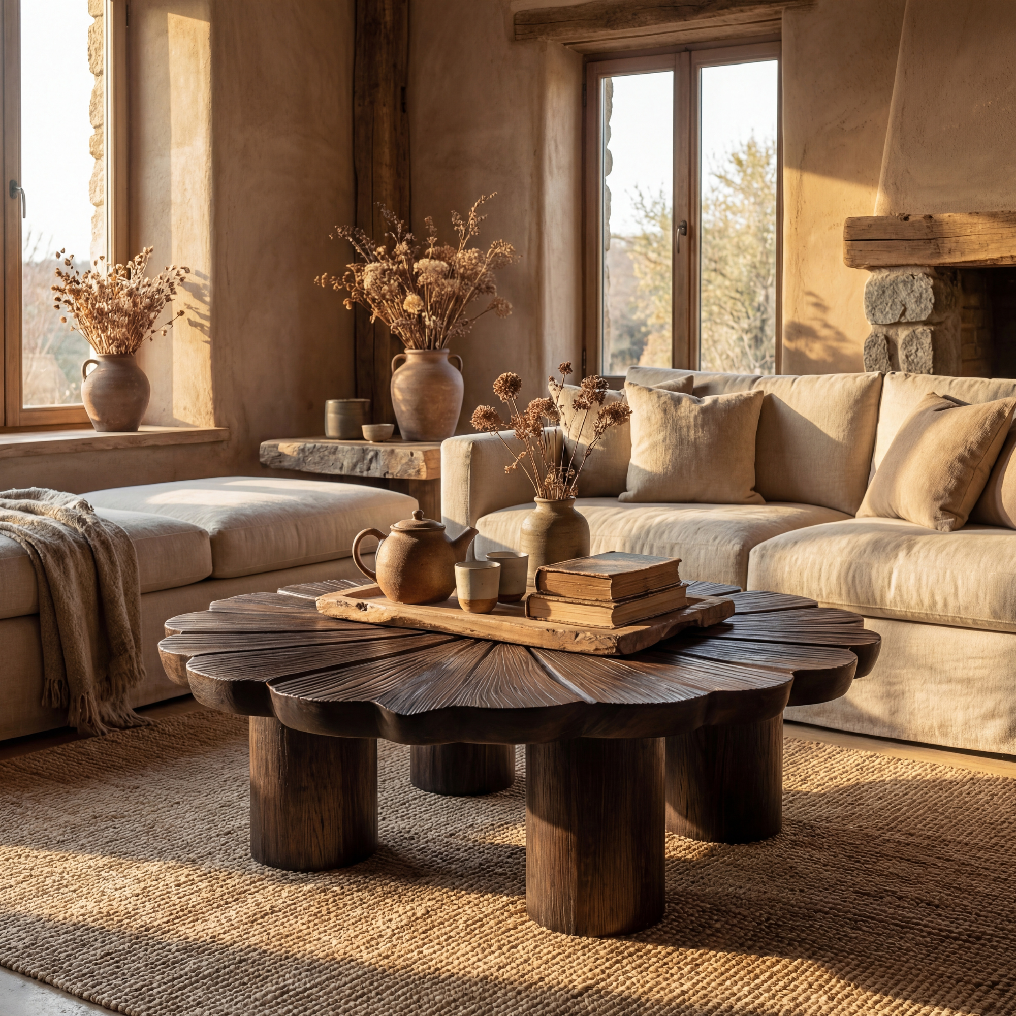 Its generous tabletop offers ample space for books, candles, trays, vases, and decorative objects, making it both practical for everyday use and striking as a statement piece. With its sculptural presence and timeless material, this table works beautifully in interiors that value warmth, craftsmanship, and organic design.