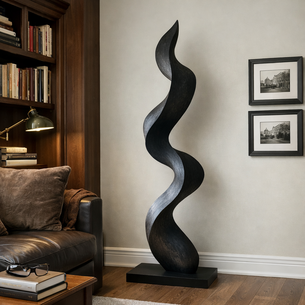 This sculpture is carved from solid wood into a soft, continuous upward curve that suggests movement and ease. The flowing form gives the impression of a slow, rising motion, calm yet expressive, bringing a sense of quiet energy into the space.